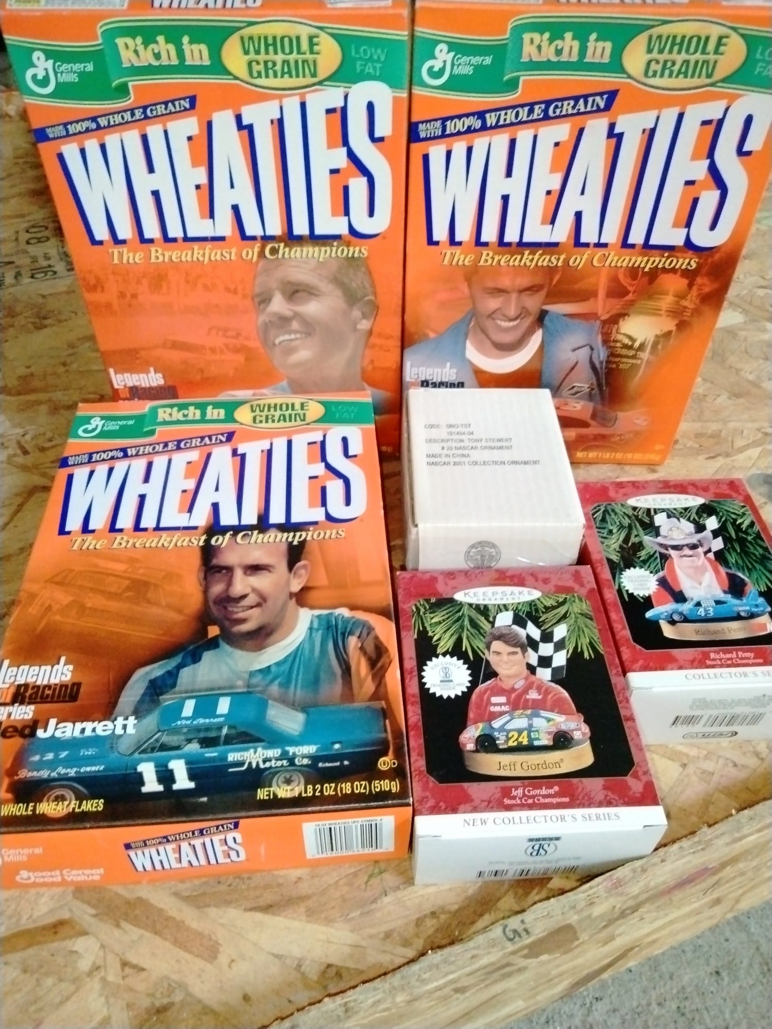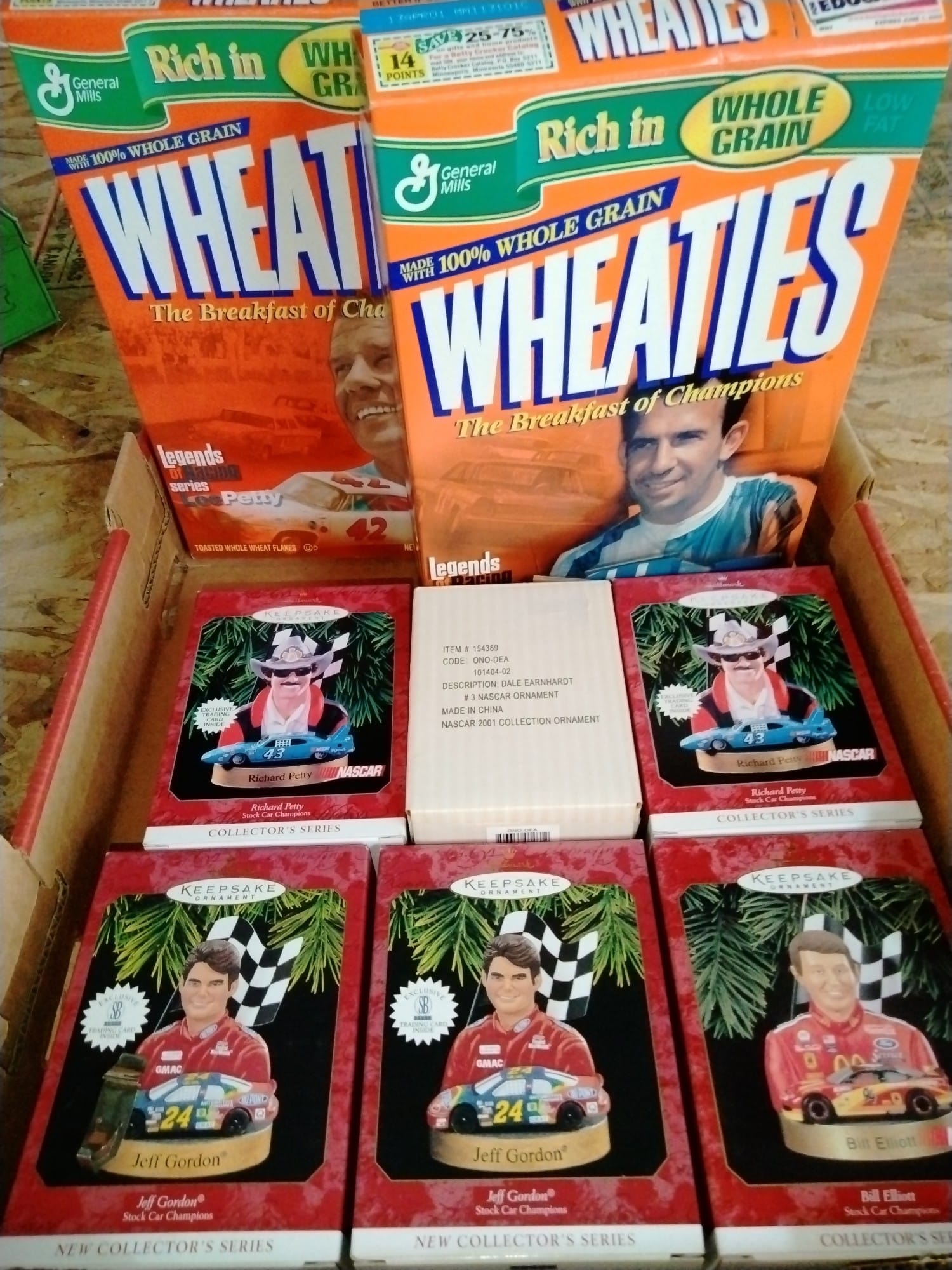 62 NASCAR Hallmark ornaments and wheaties boxes empty
