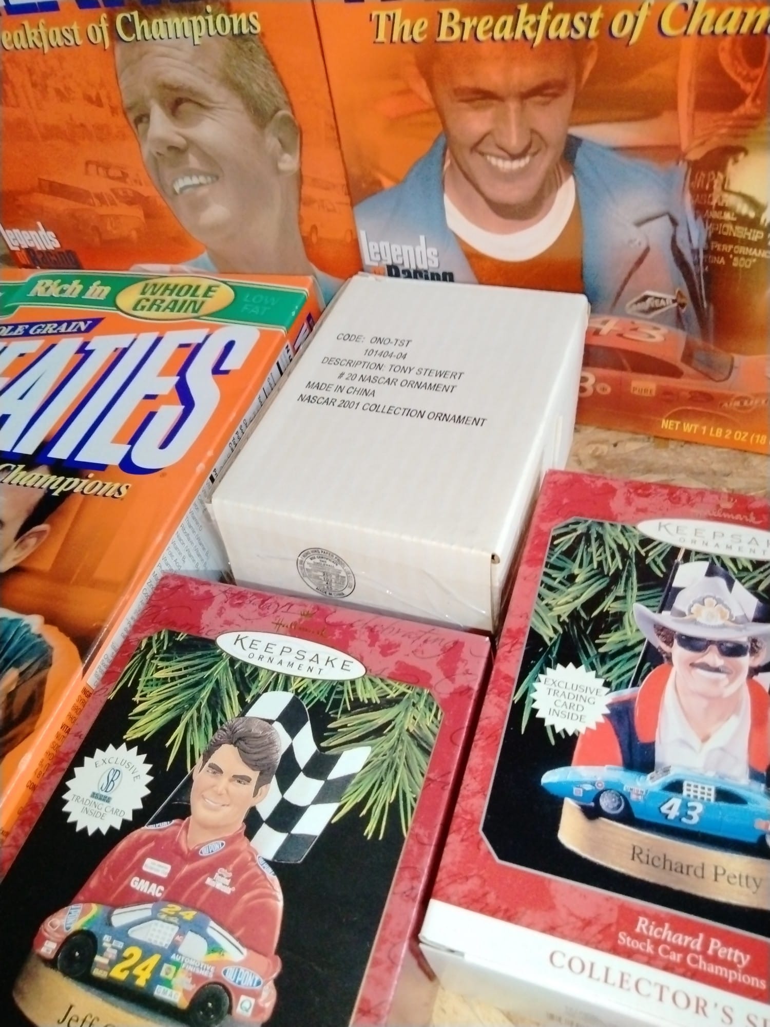63 NASCAR Hallmark ornaments and wheaties boxes empty