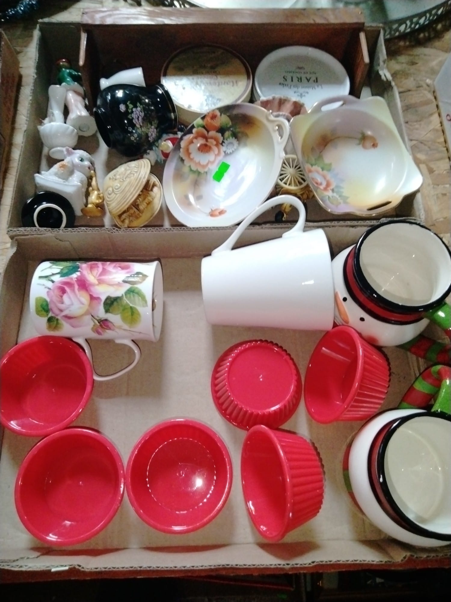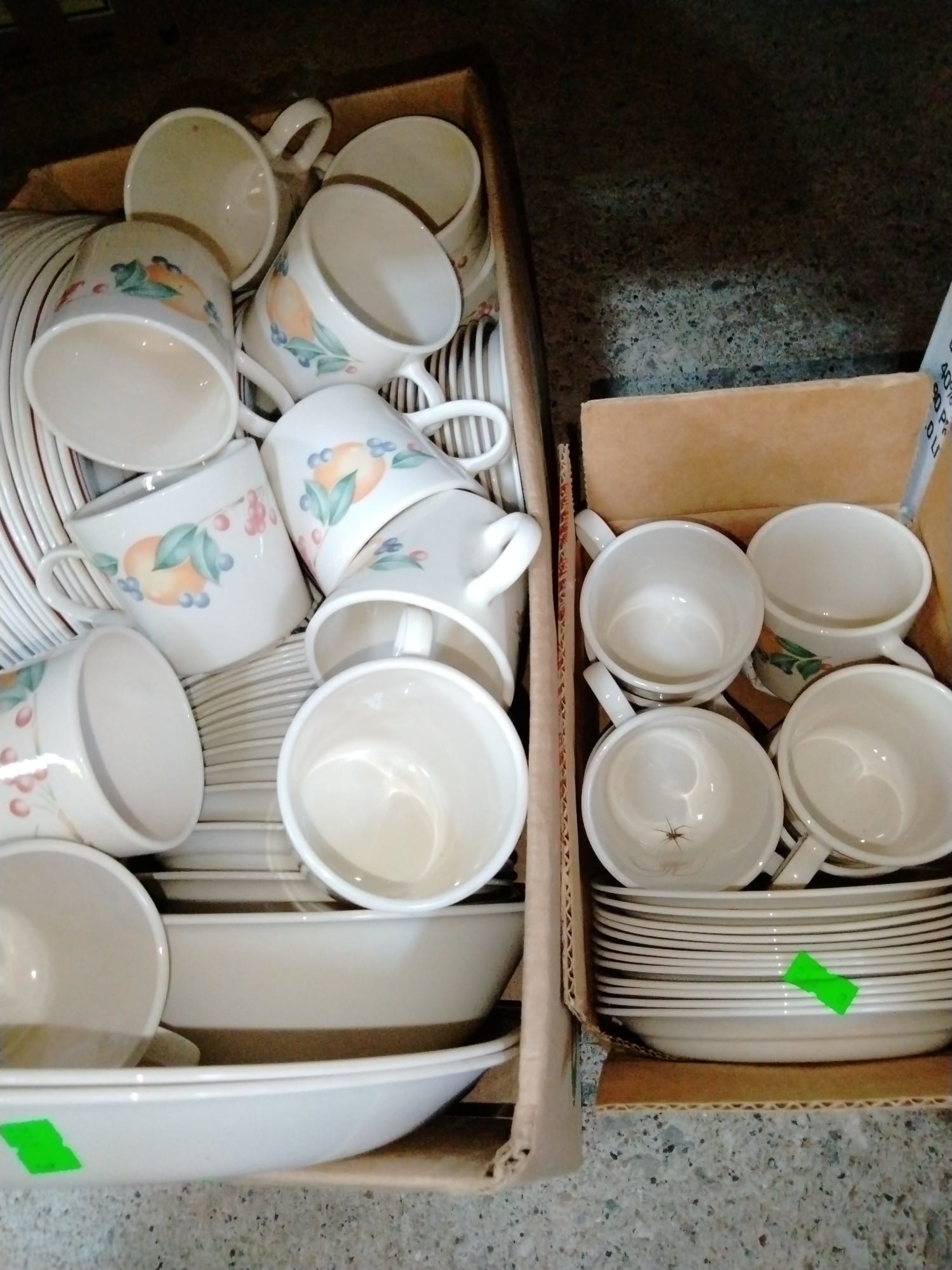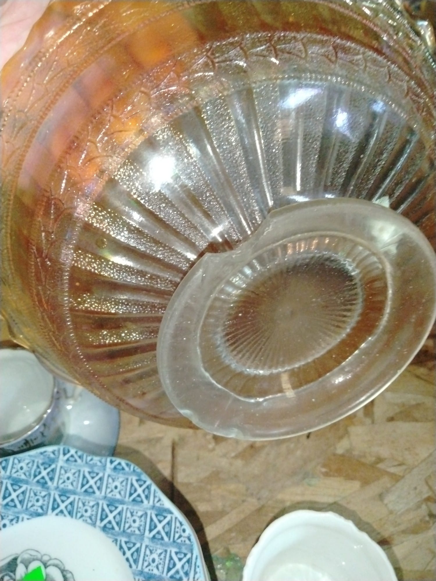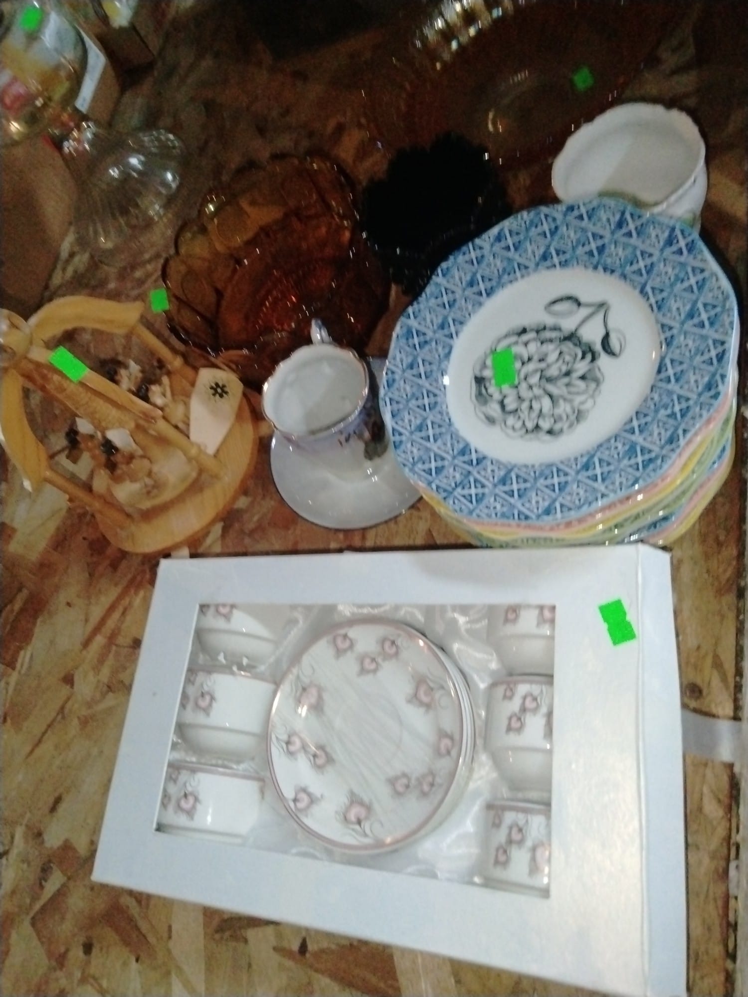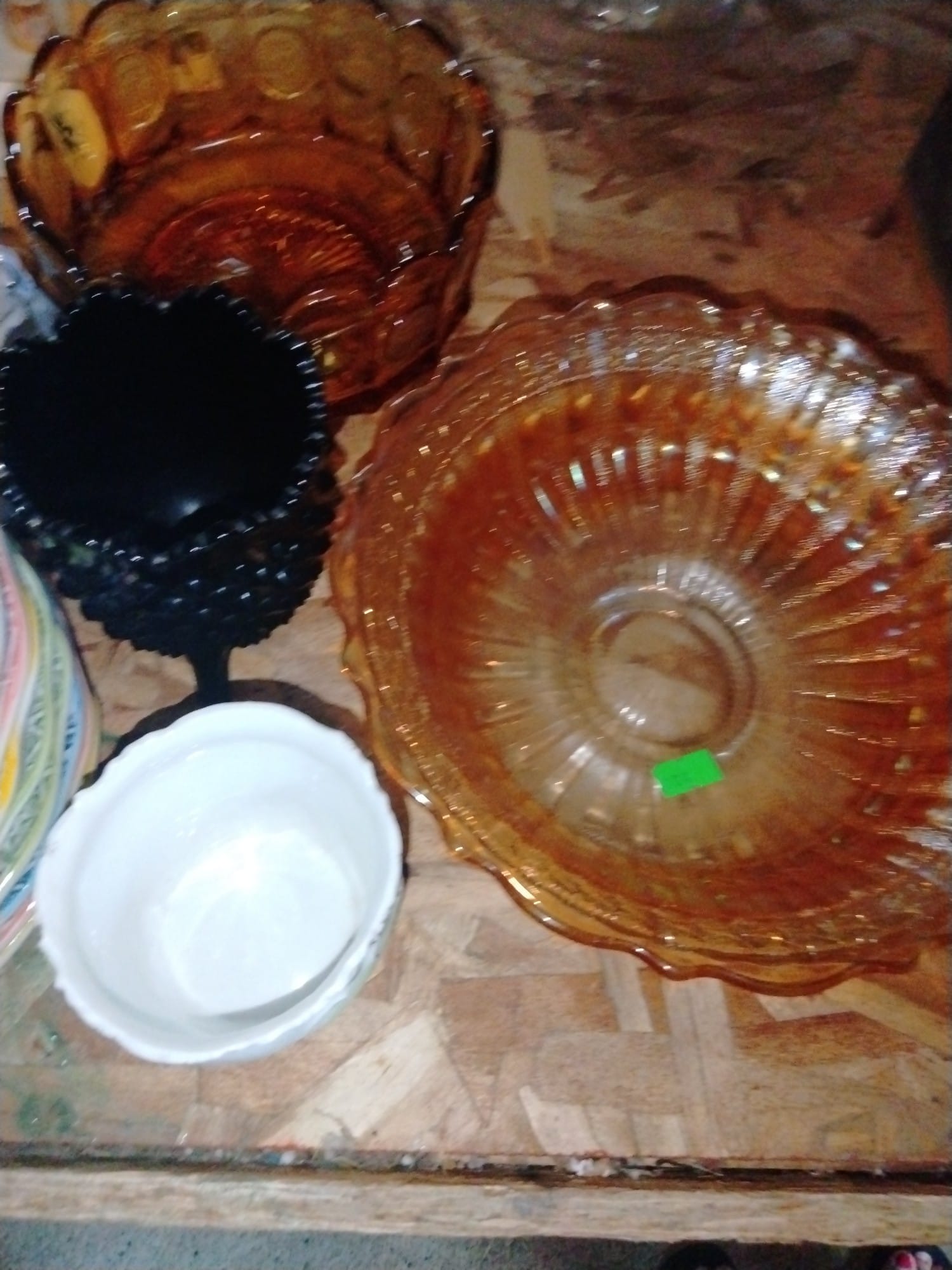 104 Teacups and saucers, Christmas whirly gig, Williamsburg plates, carnival glass bowl with chips, amber bowl, black hobnail dish