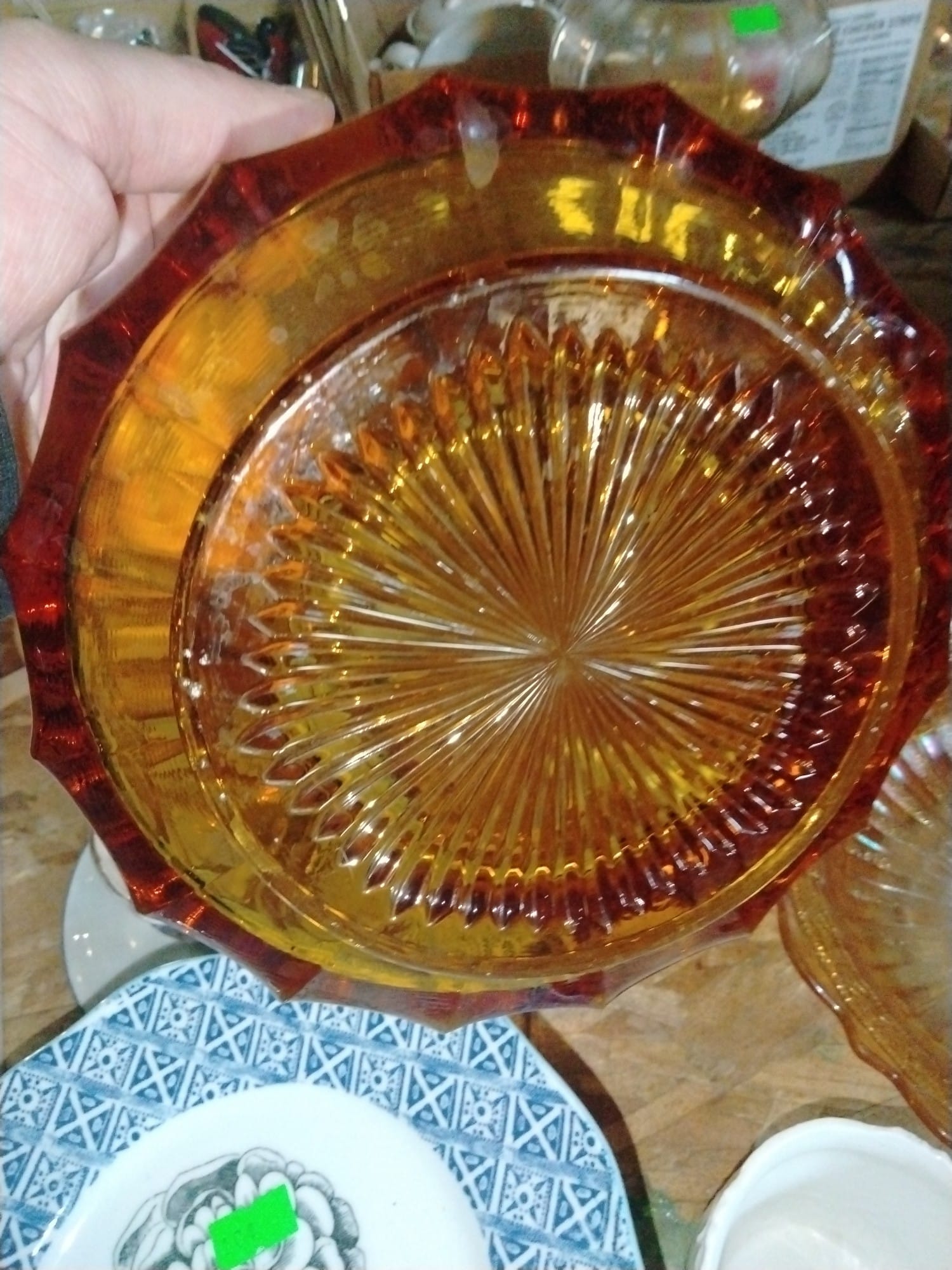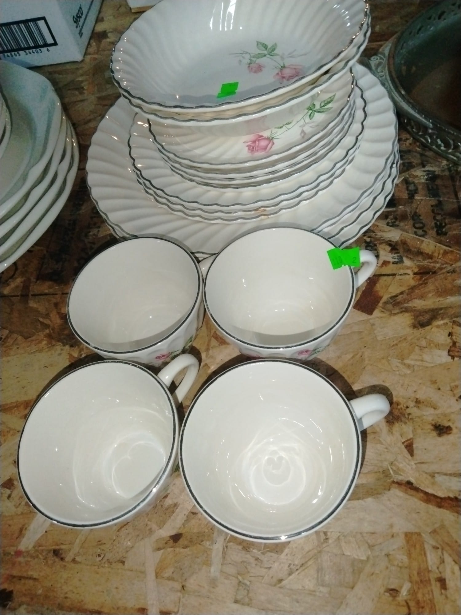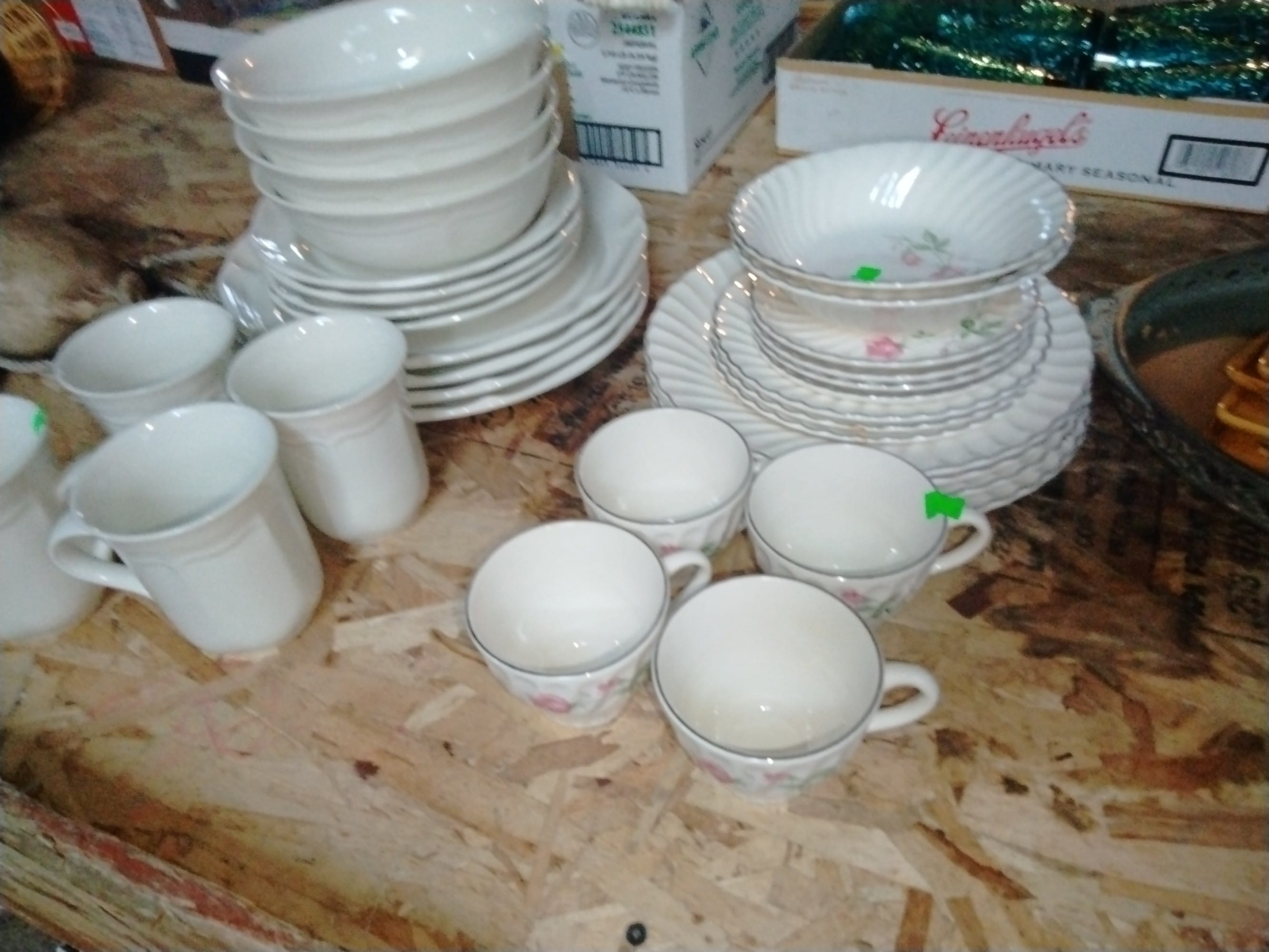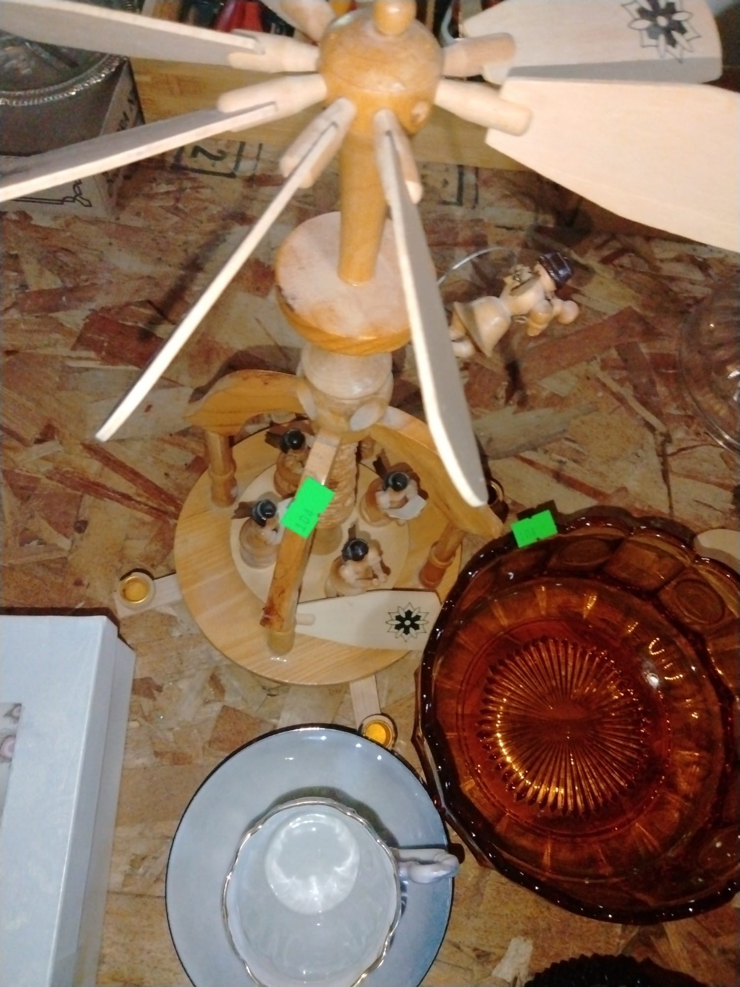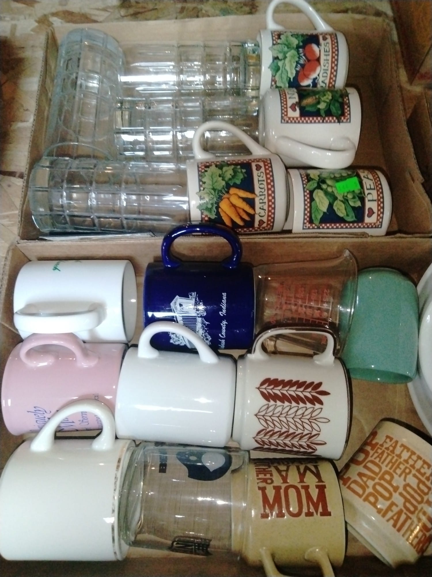 104 Teacups and saucers, Christmas whirly gig, Williamsburg plates, carnival glass bowl with chips, amber bowl, black hobnail dish