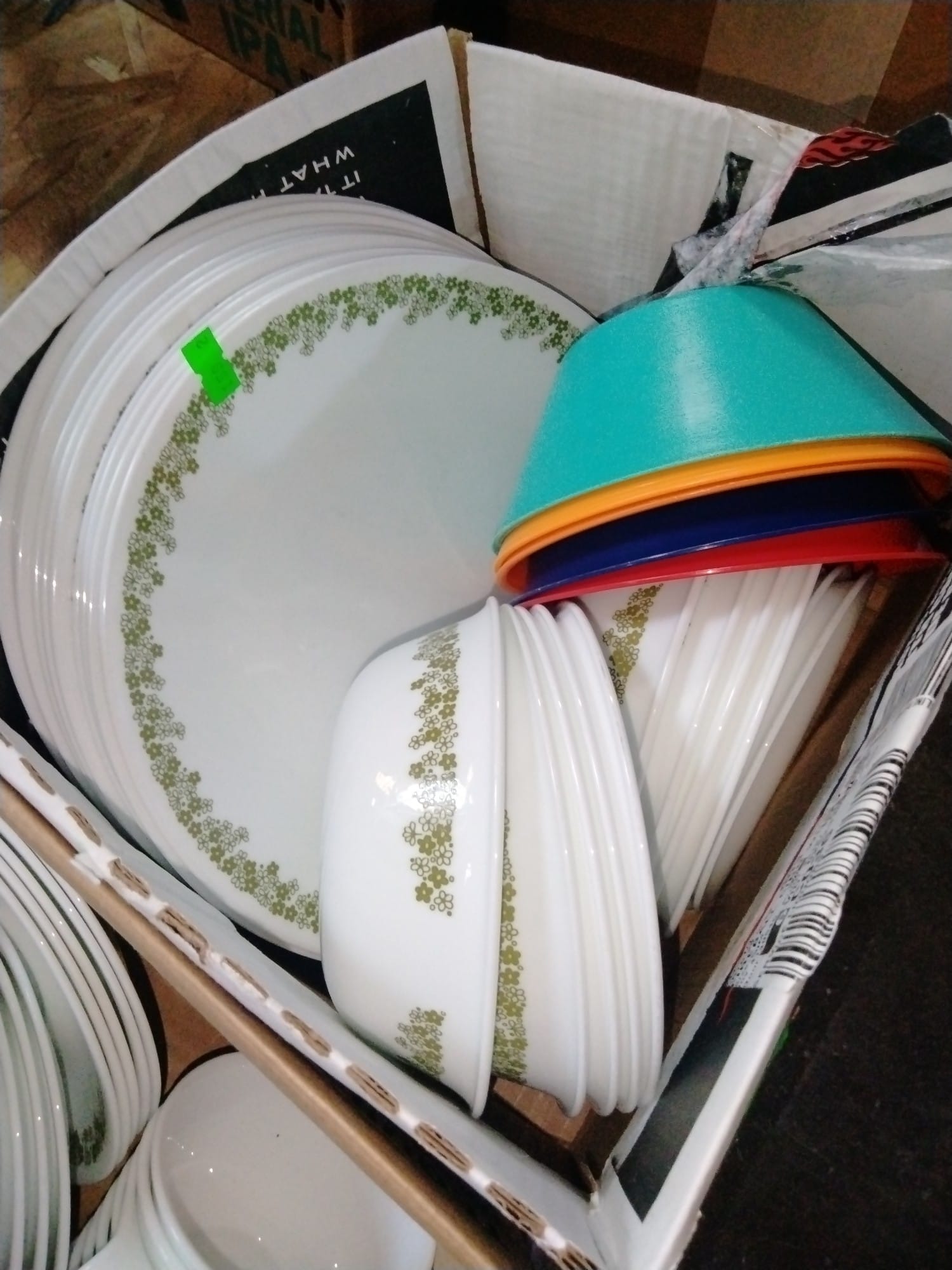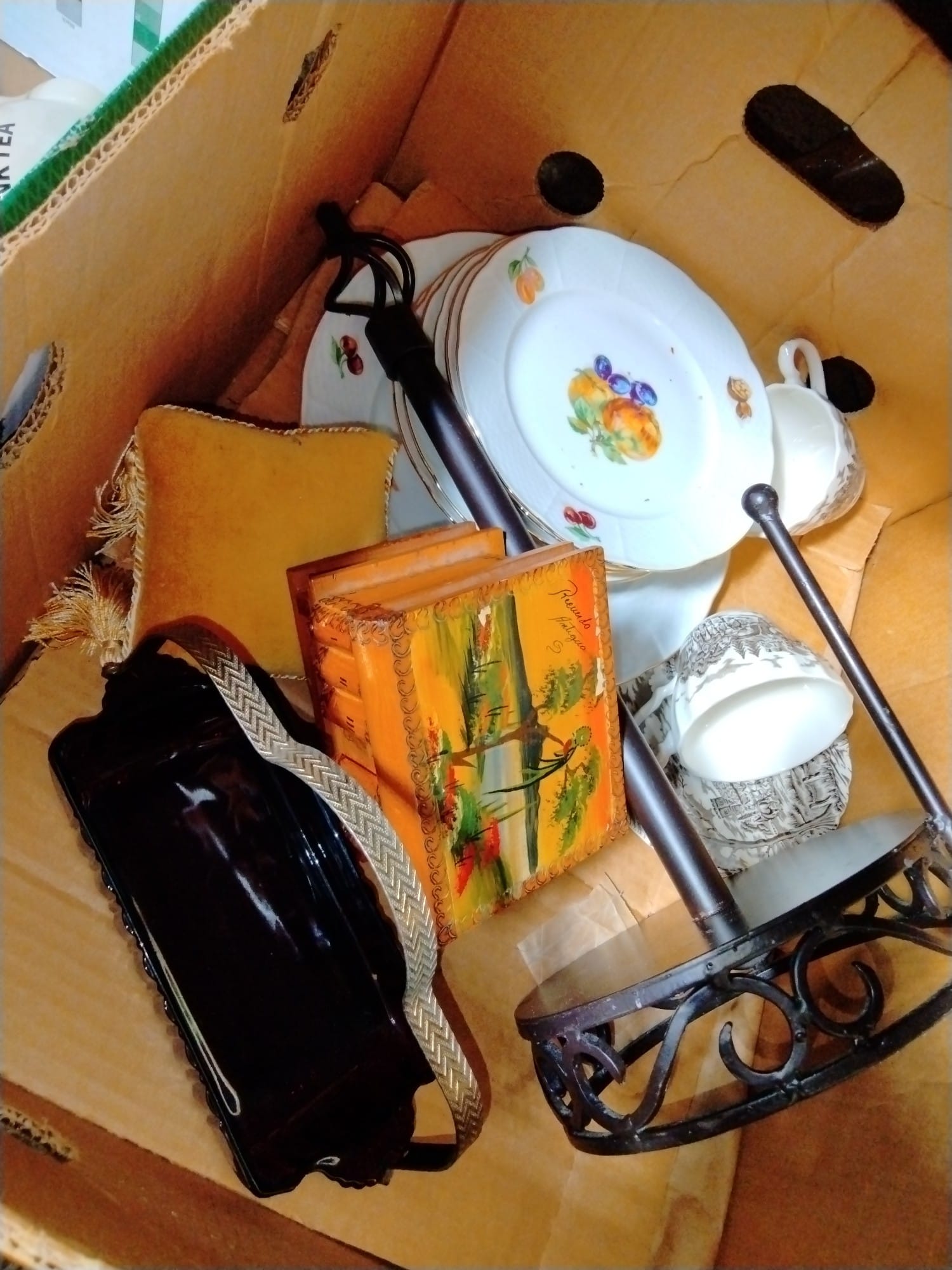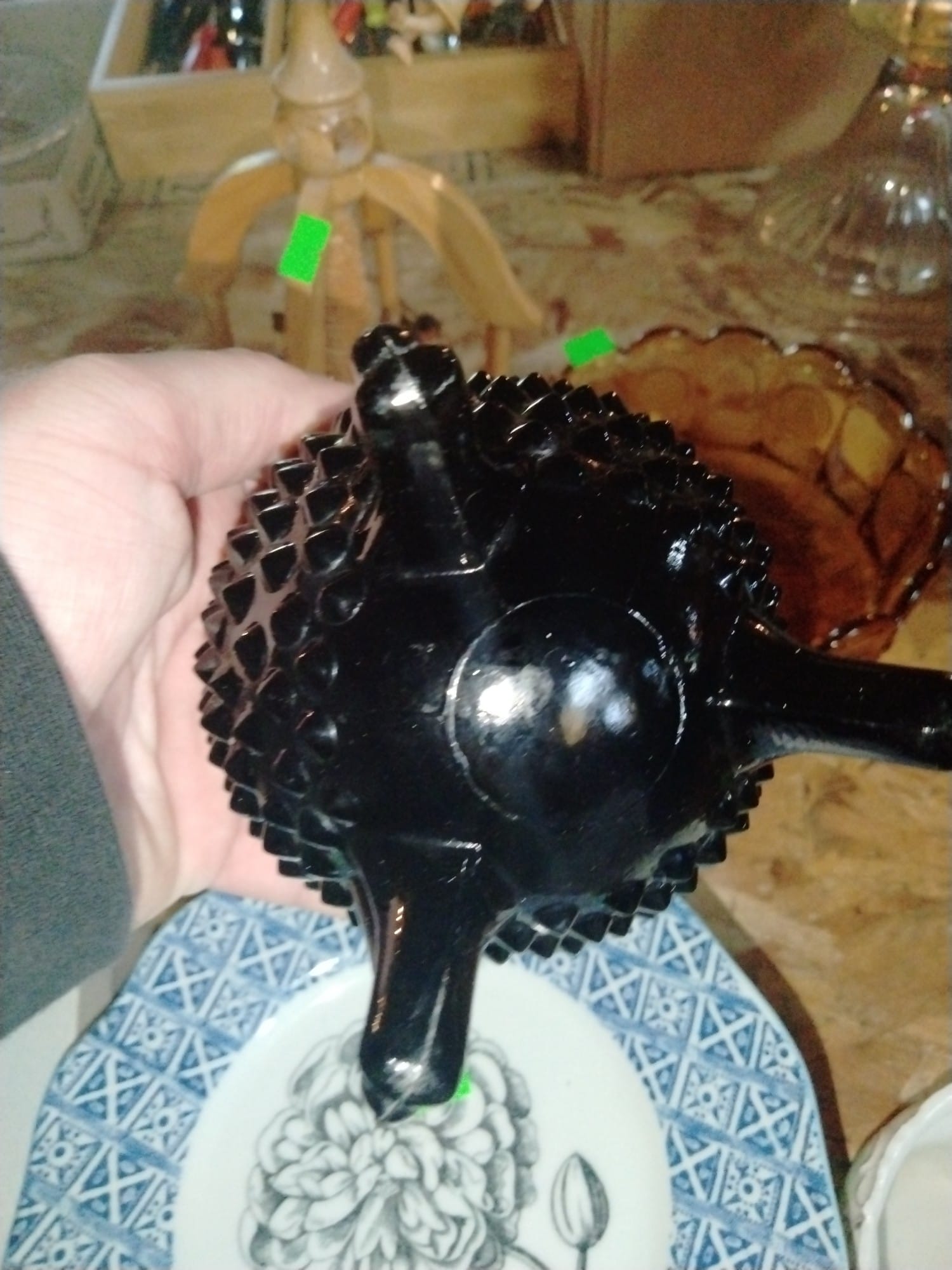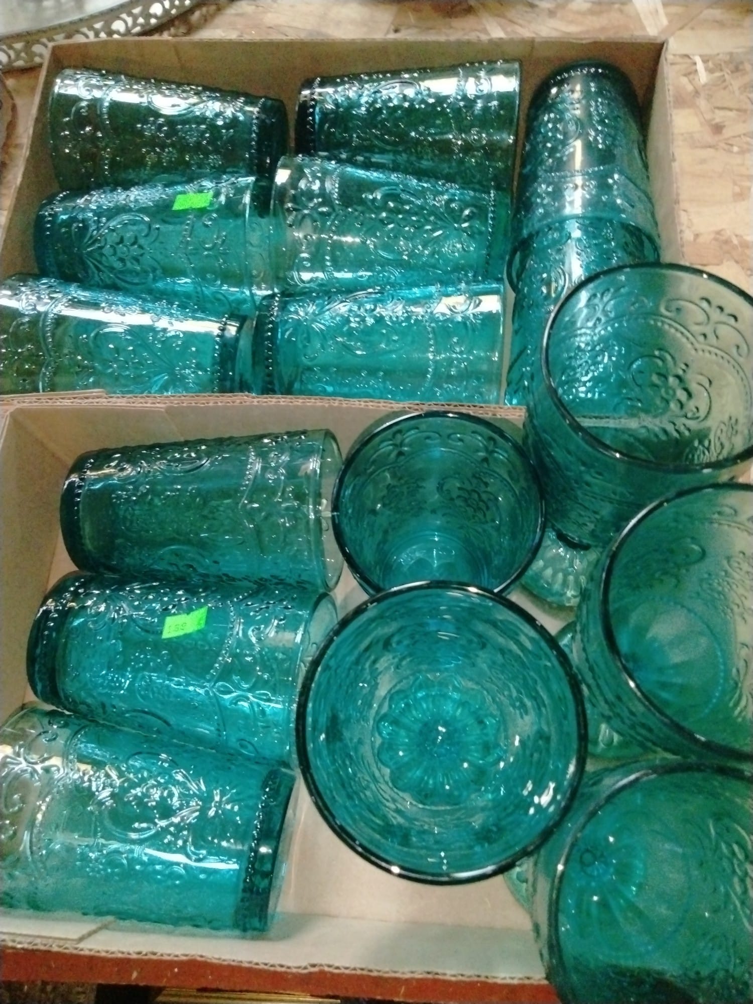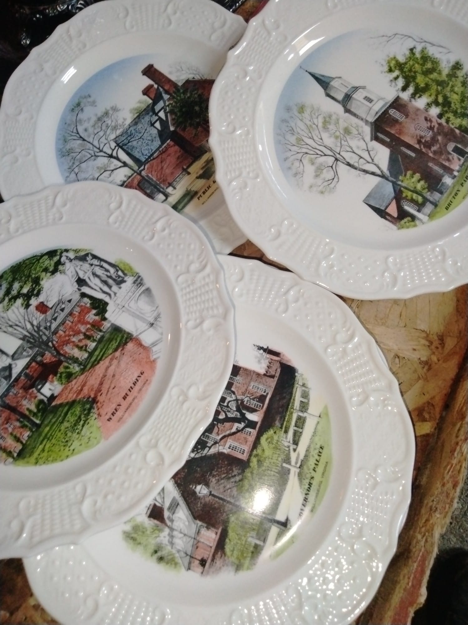 104 Teacups and saucers, Christmas whirly gig, Williamsburg plates, carnival glass bowl with chips, amber bowl, black hobnail dish