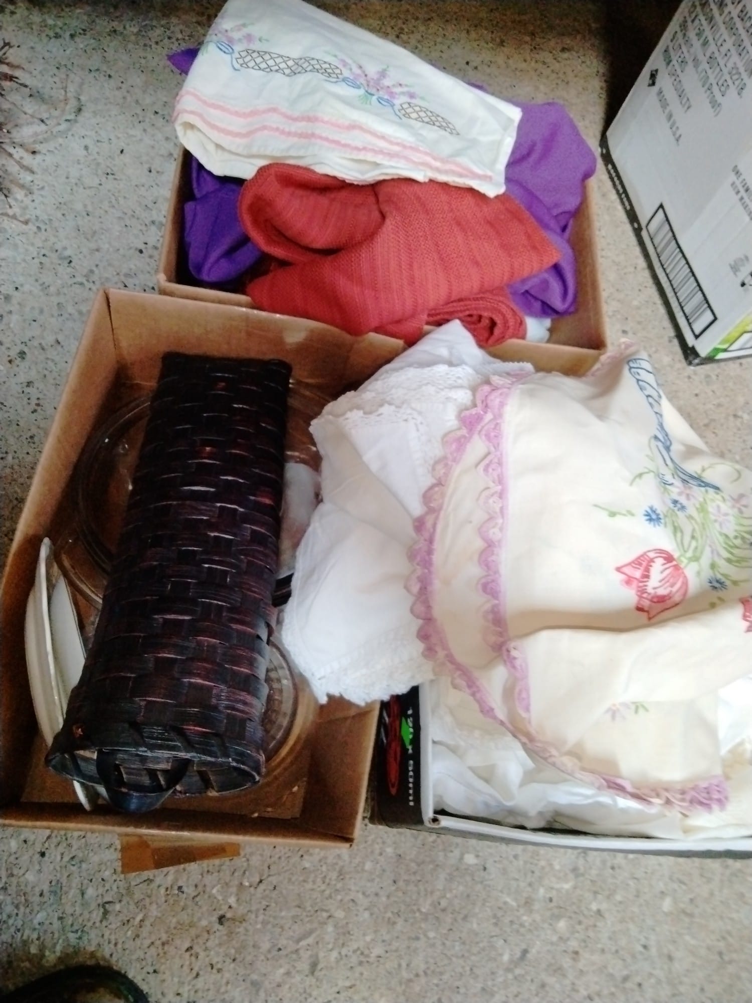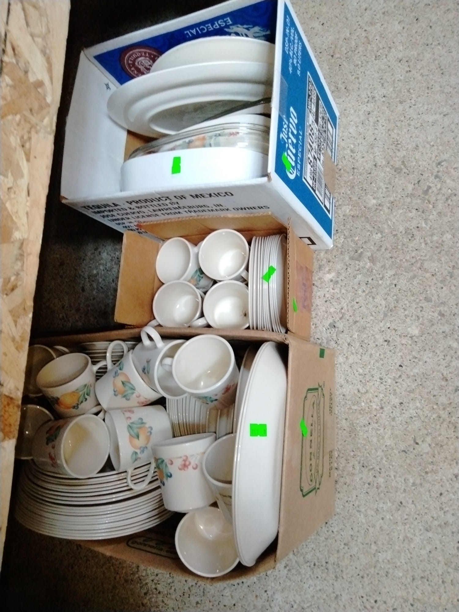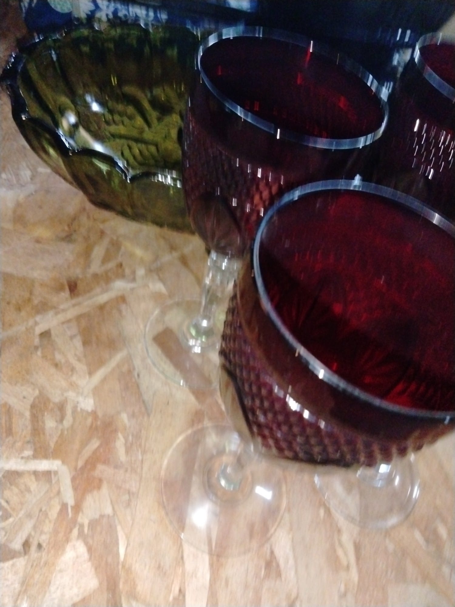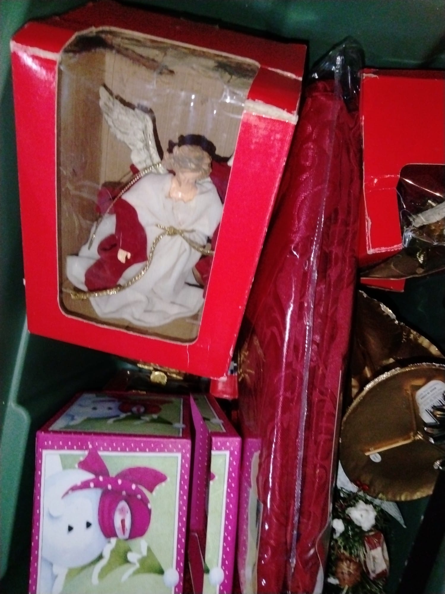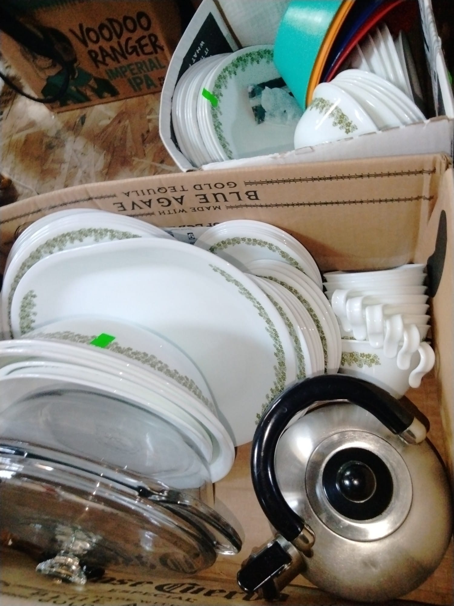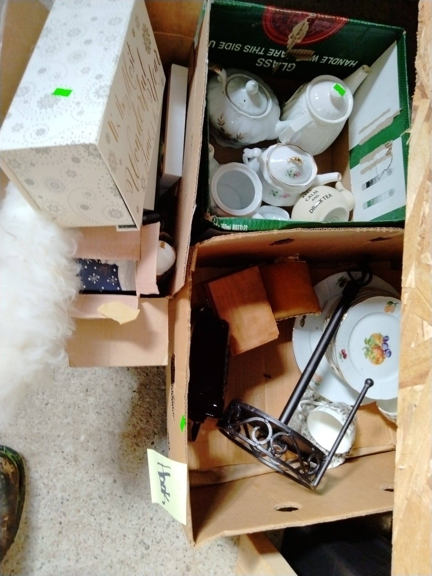 104 Teacups and saucers, Christmas whirly gig, Williamsburg plates, carnival glass bowl with chips, amber bowl, black hobnail dish