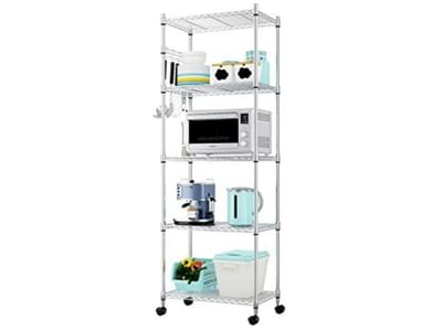 27 TOOLF 4-Tier Foldable Shelving Unit, Freestanding Metal Storage Shelf with MDF Tabletop, No Assembly Storage Shelves with Wheels for Garage Kitchen Bakers Closet Pantry, Heavy Duty Shelving, dent on shelf