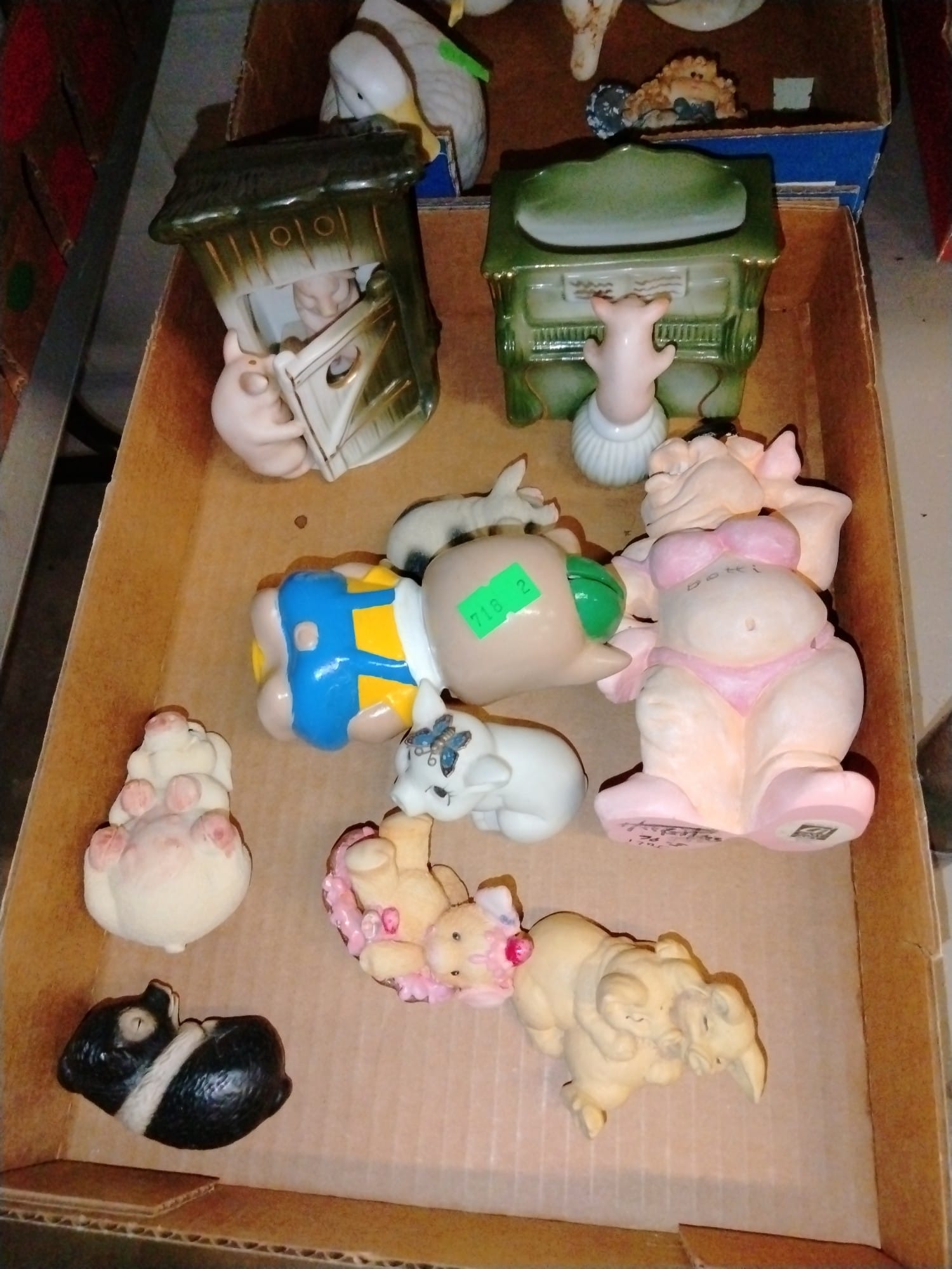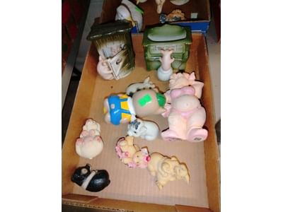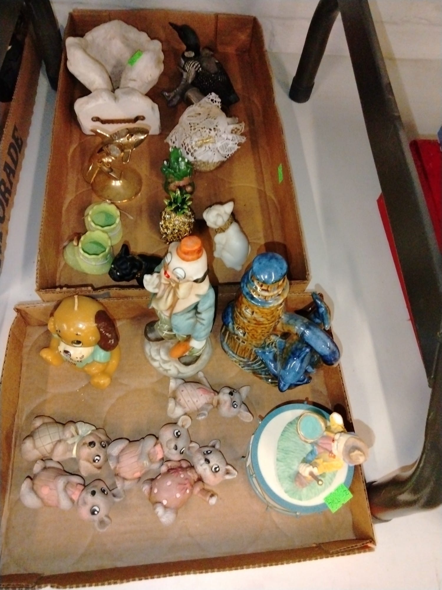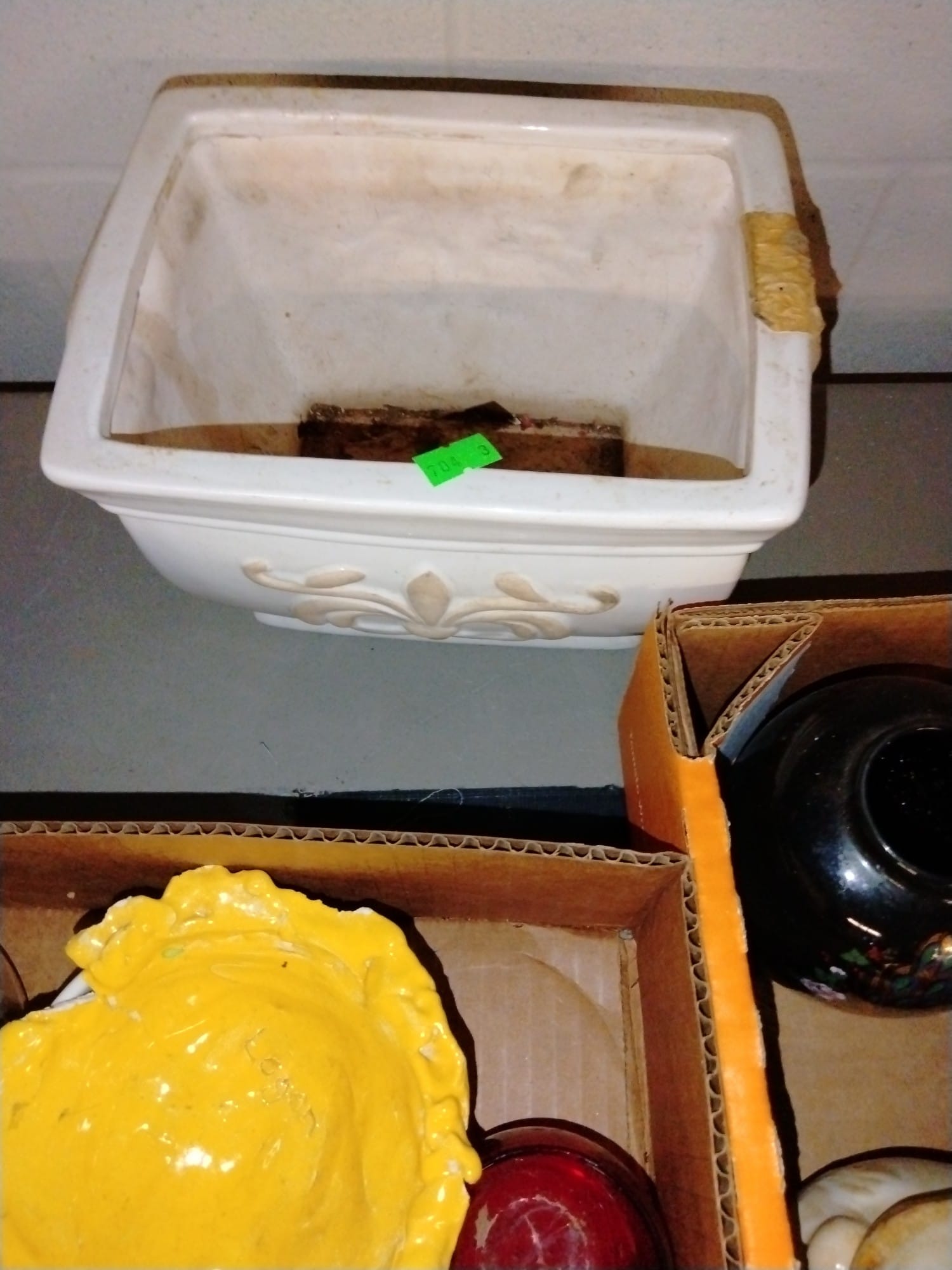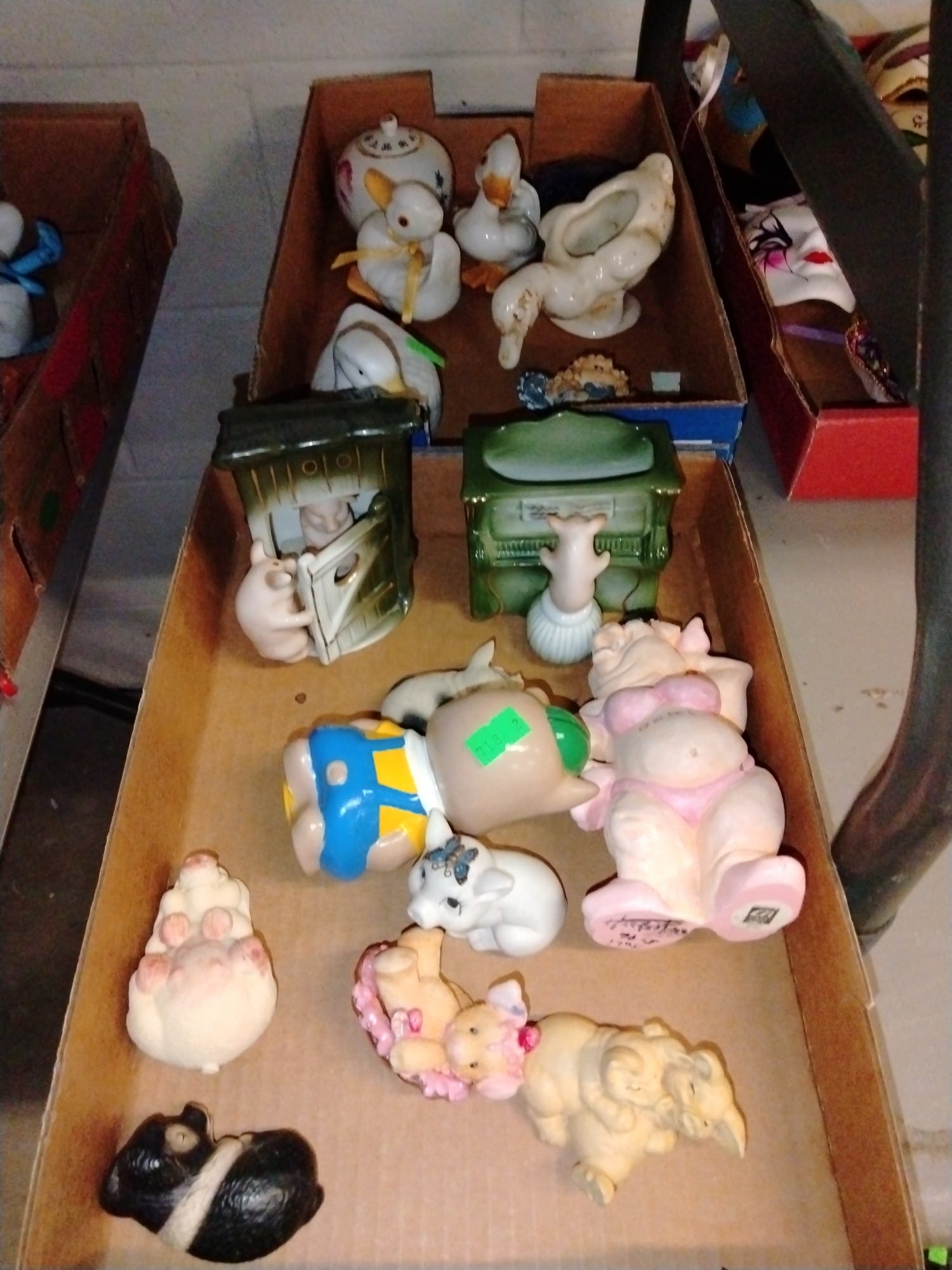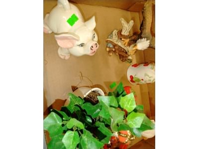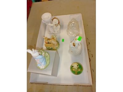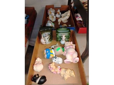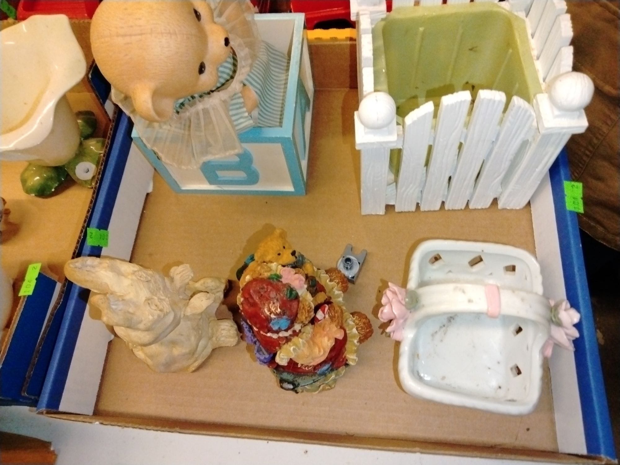 104 Planter, porcelain assortment , resin bear, pottery rabbit, music box, trinket boxes, art glass vase