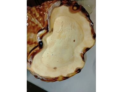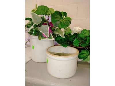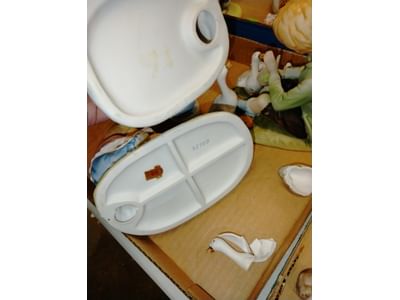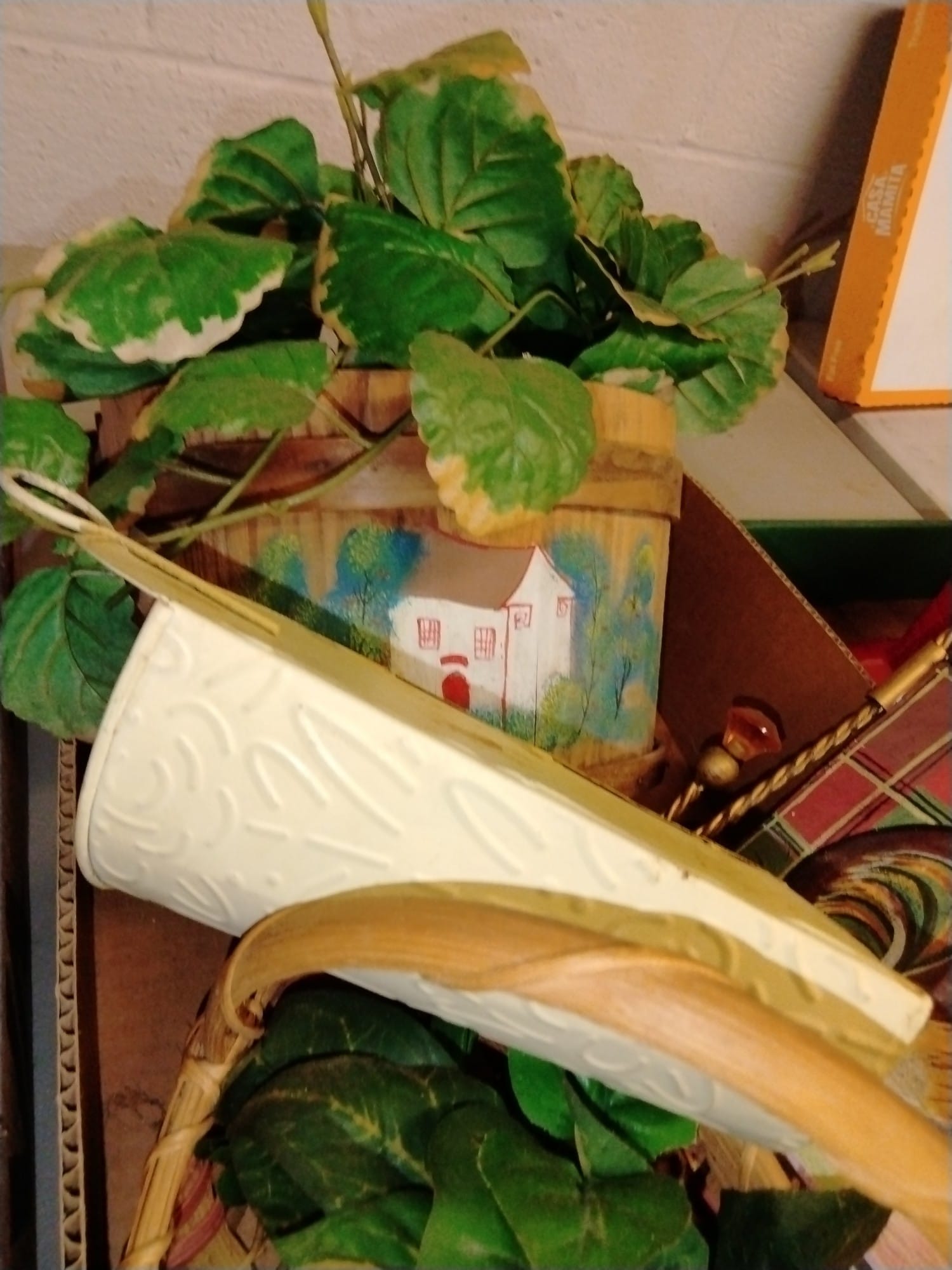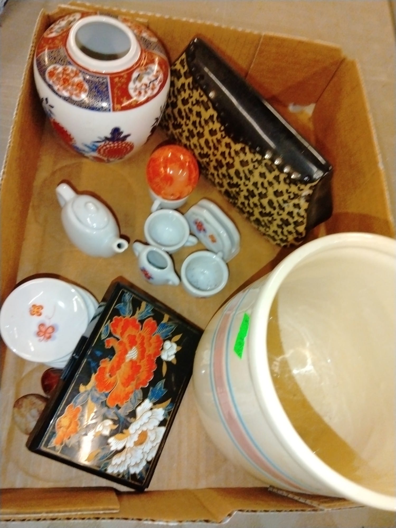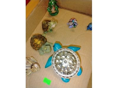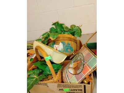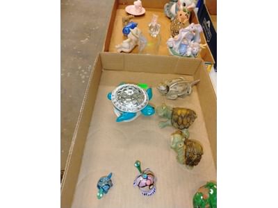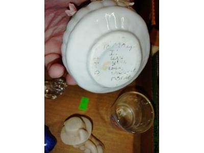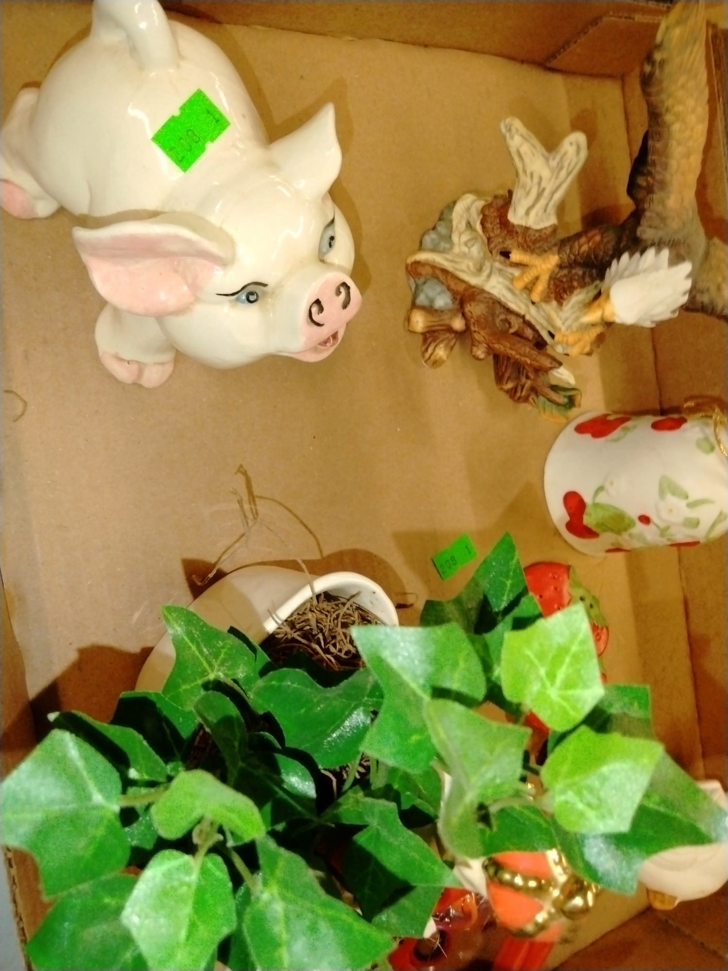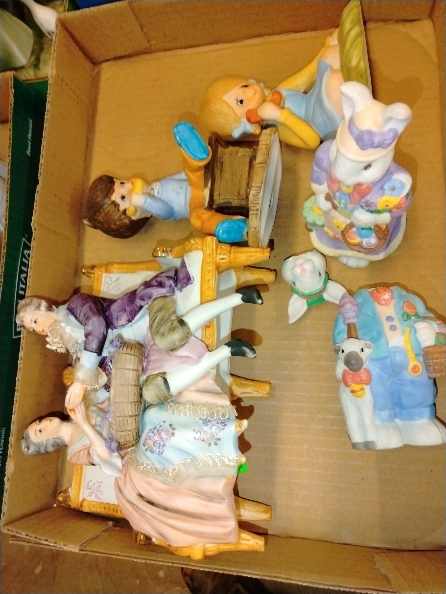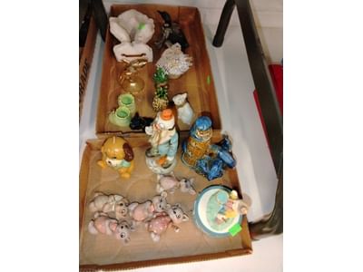 104 Planter, porcelain assortment , resin bear, pottery rabbit, music box, trinket boxes, art glass vase