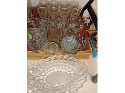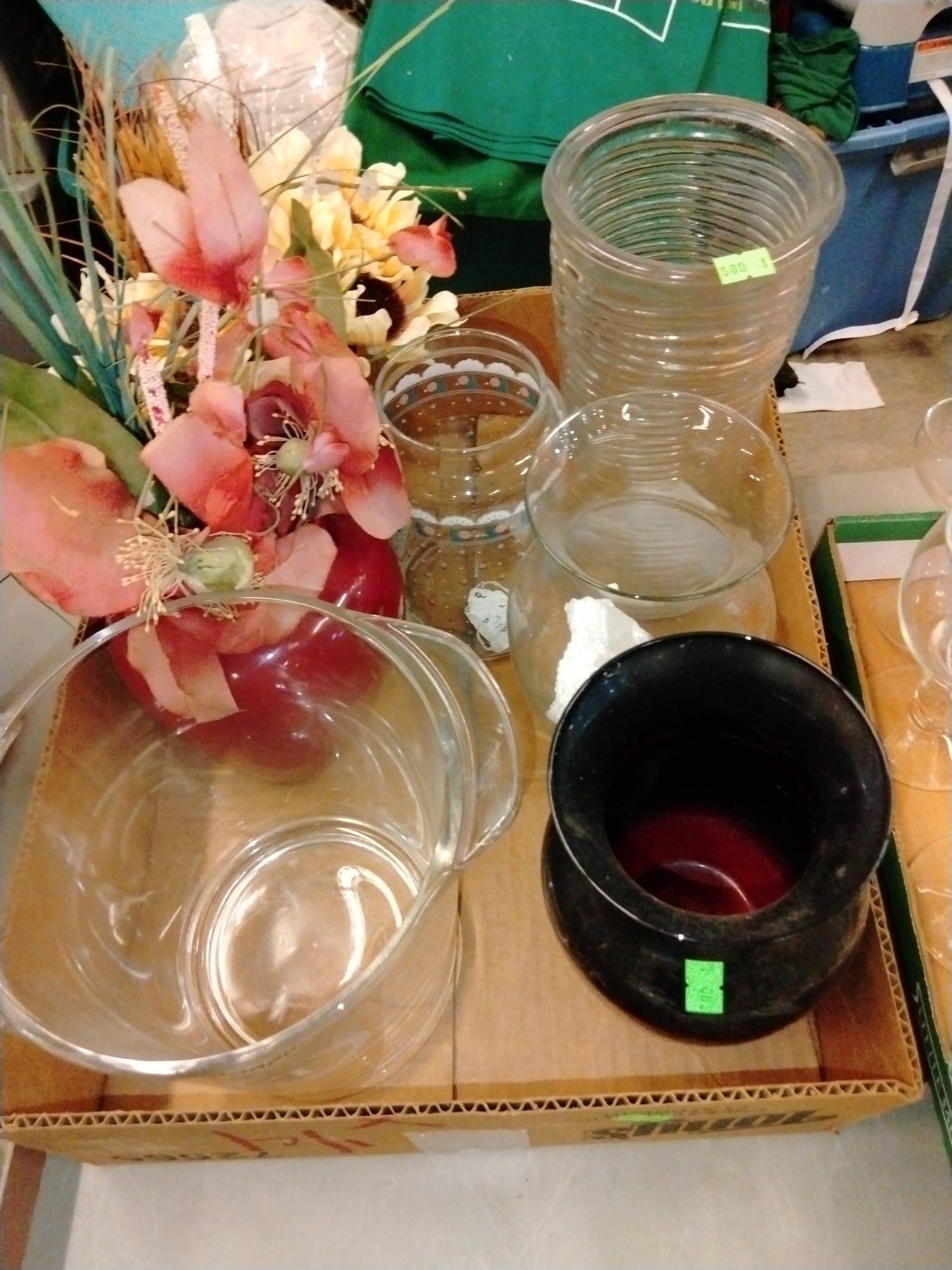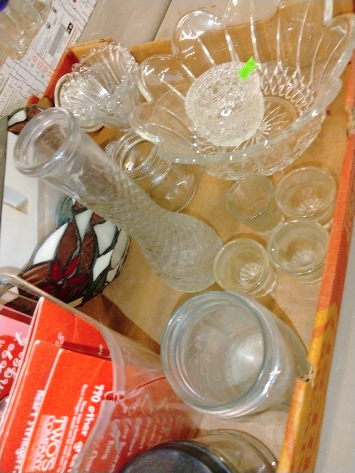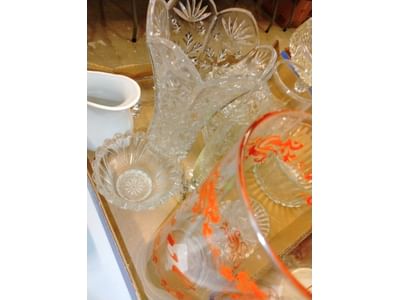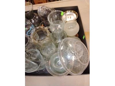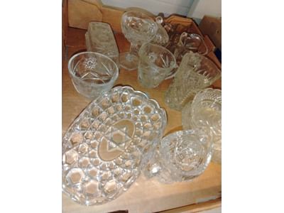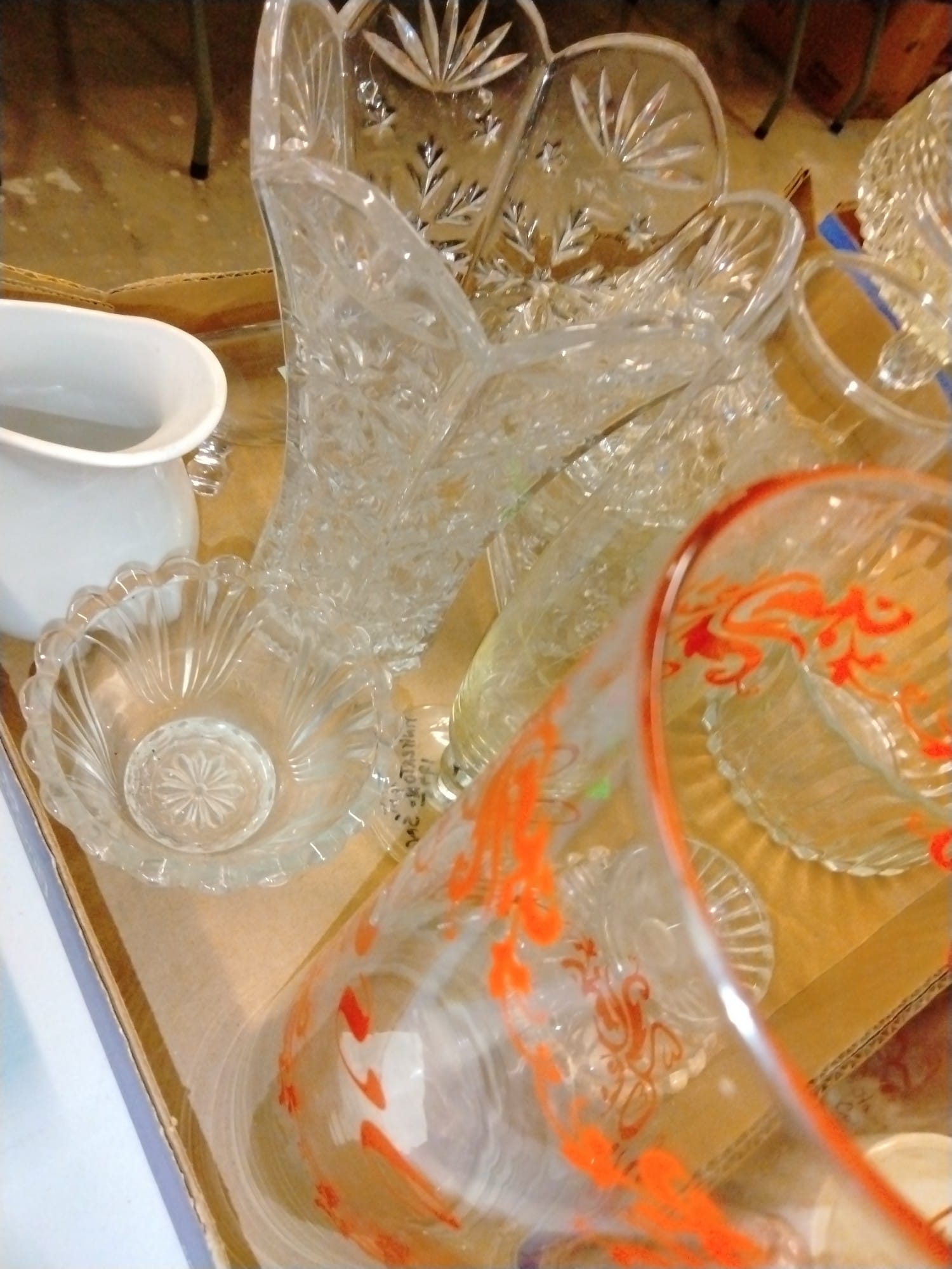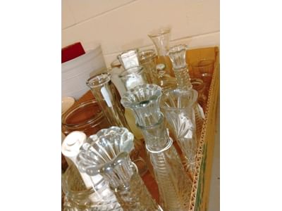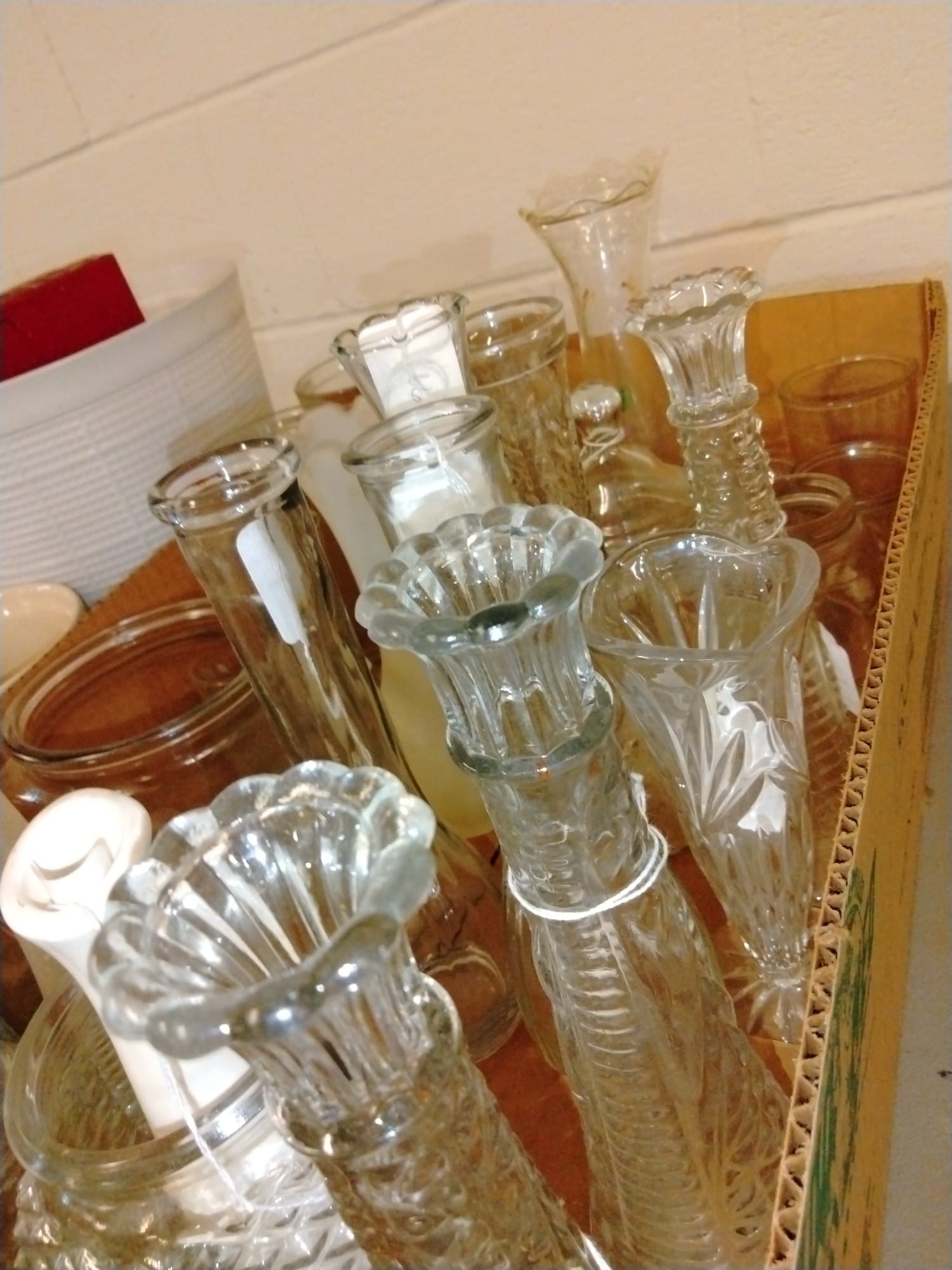 109 Glass vases, compote, candy dish, fan plate, pottery creamer