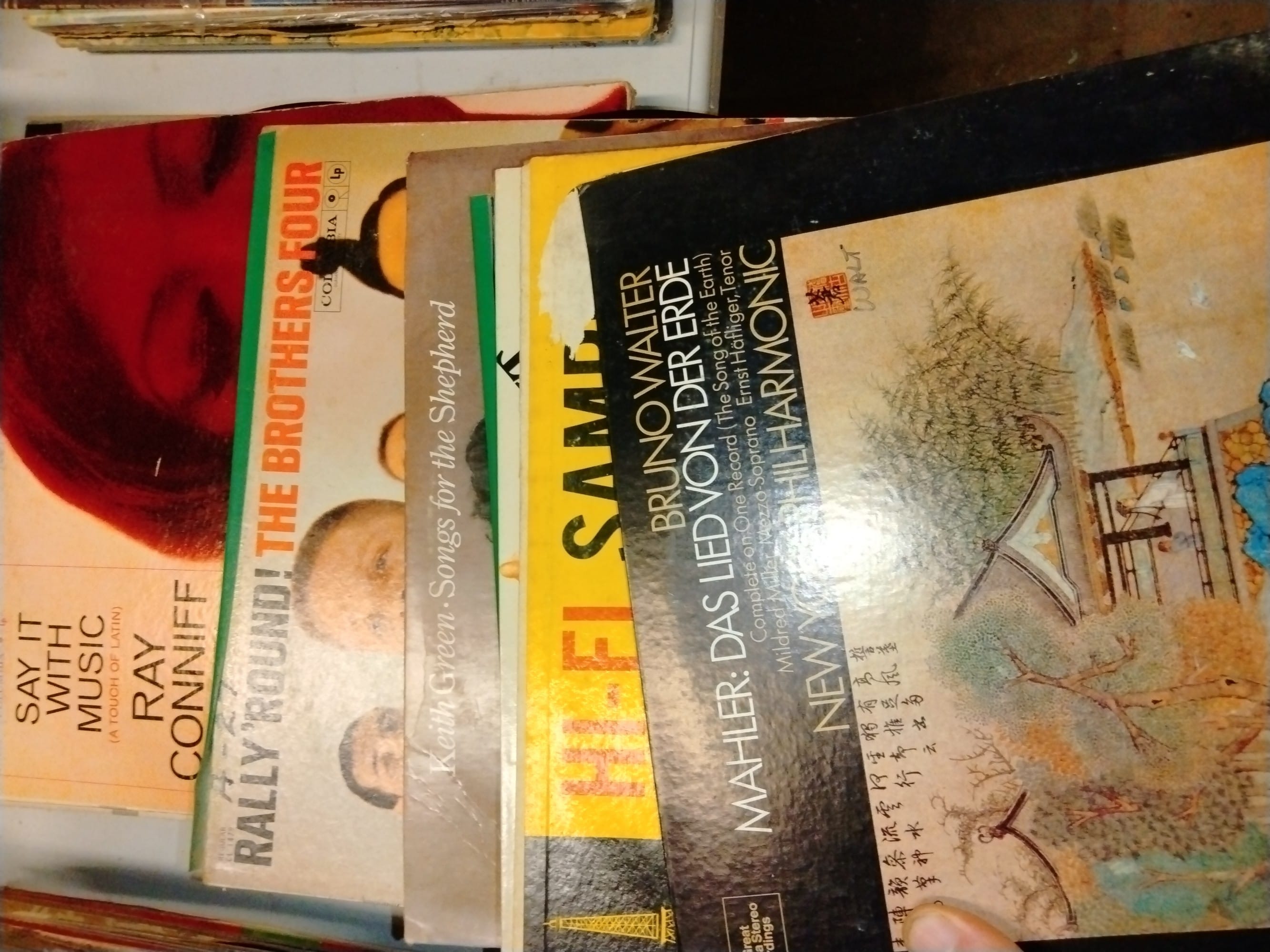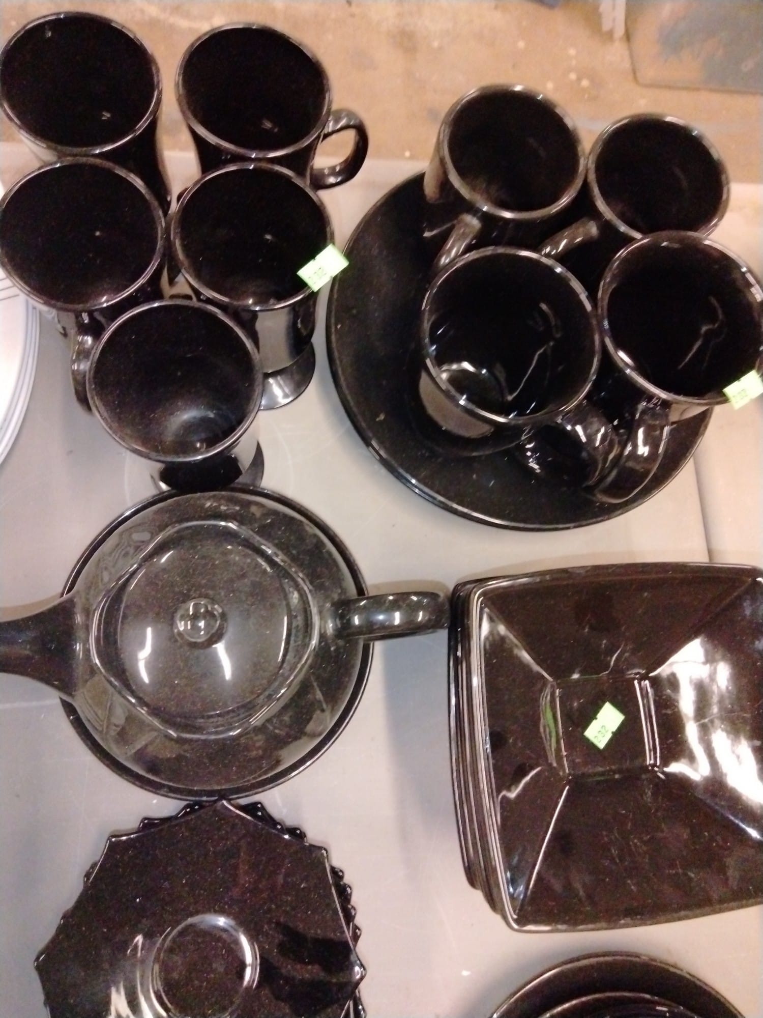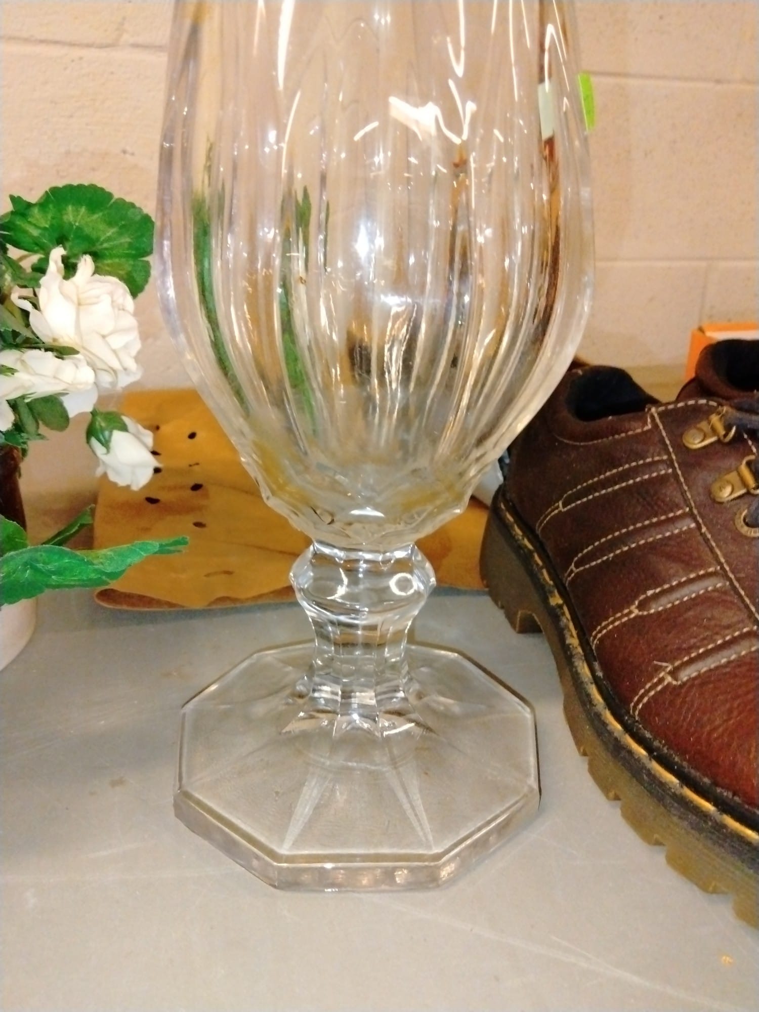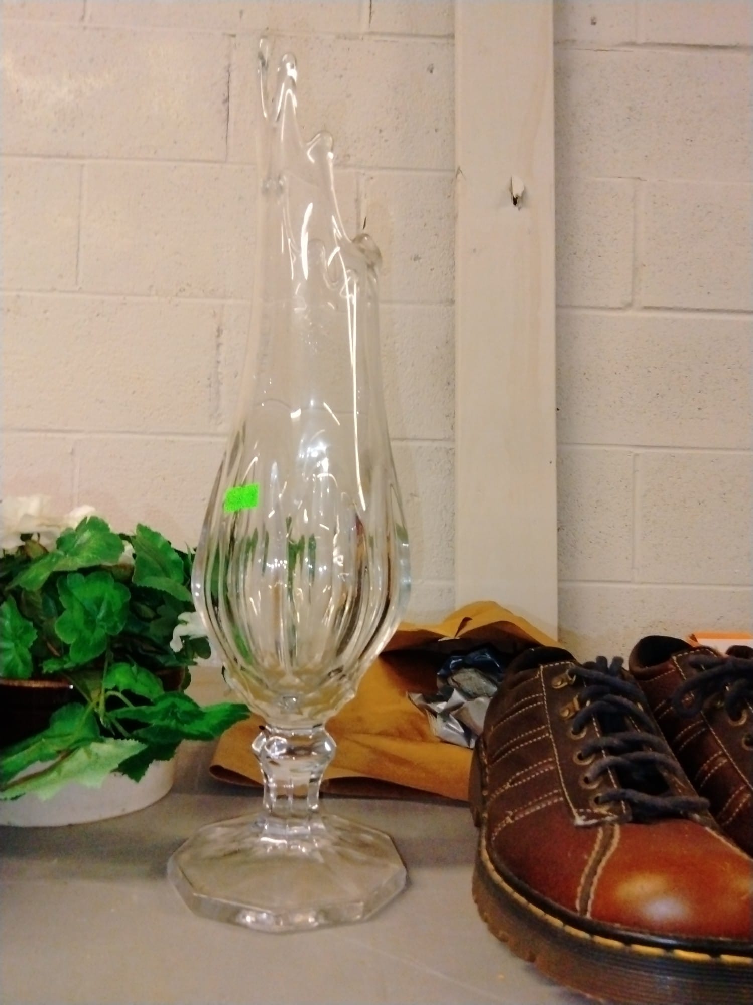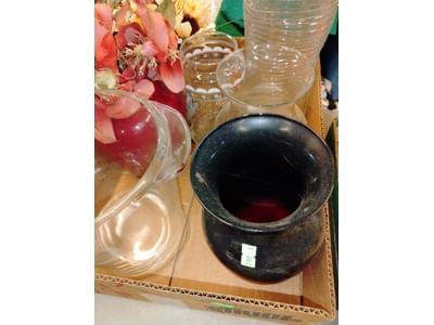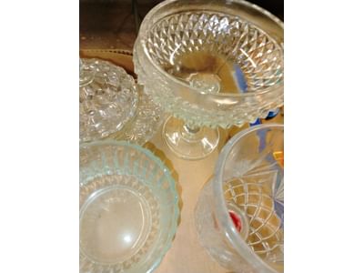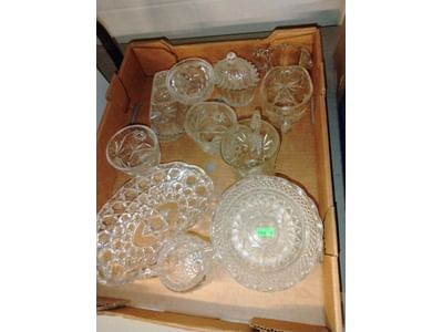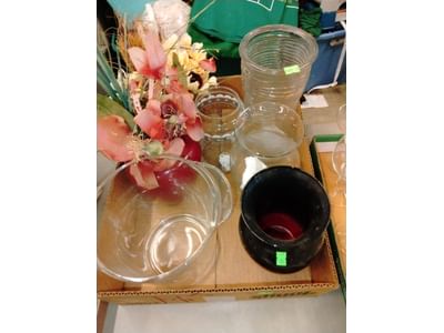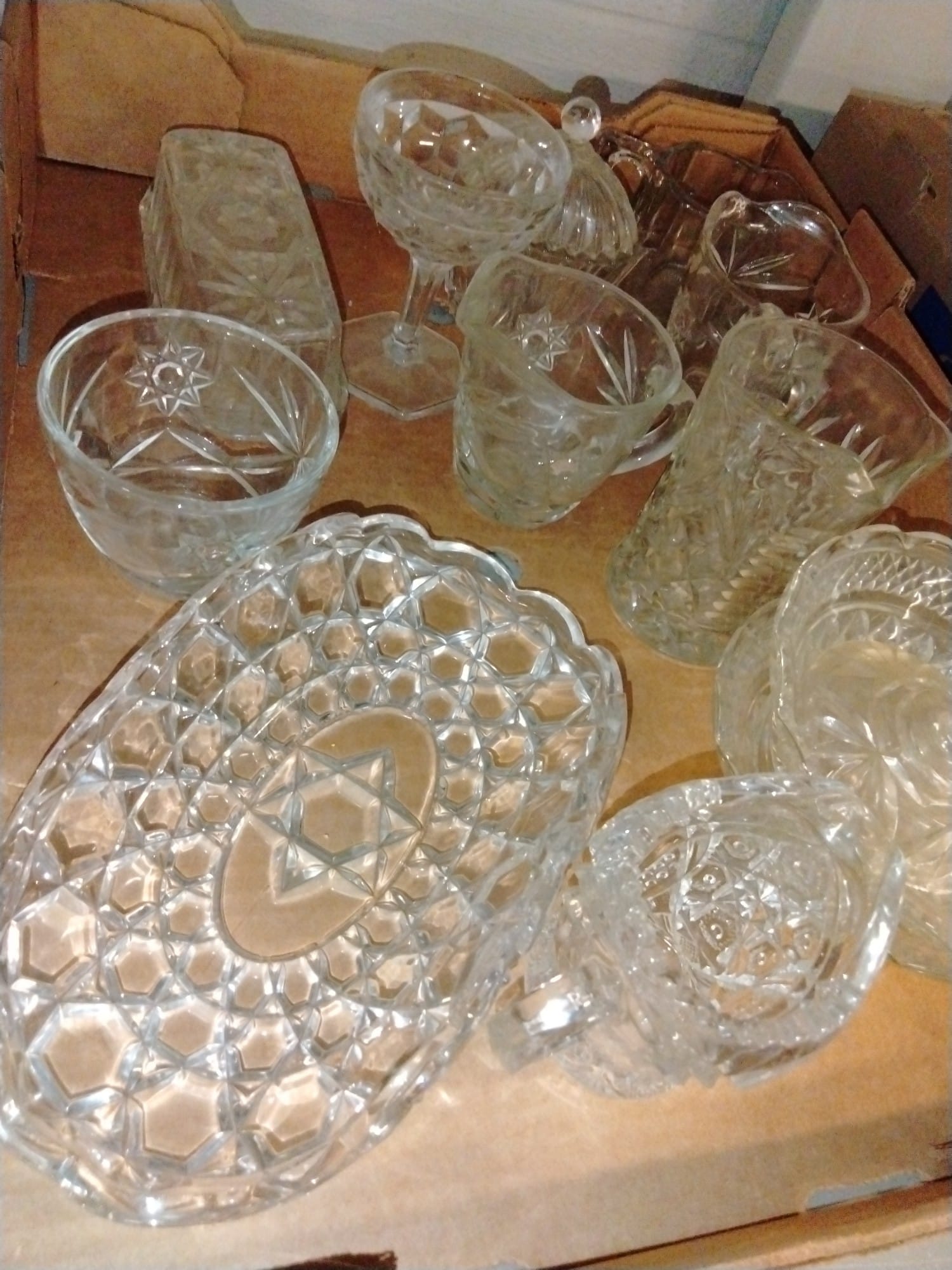 109 Glass vases, compote, candy dish, fan plate, pottery creamer
