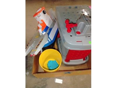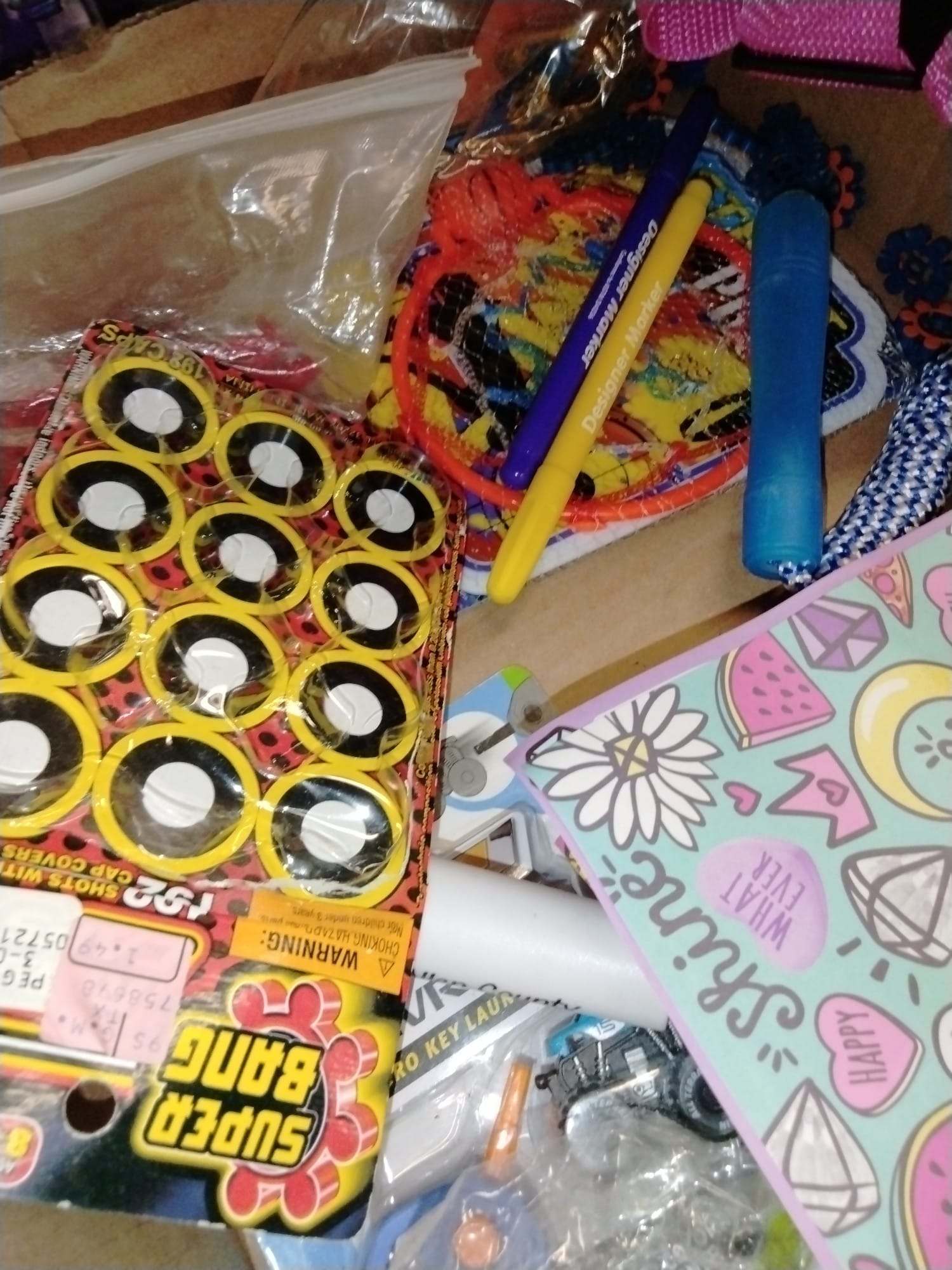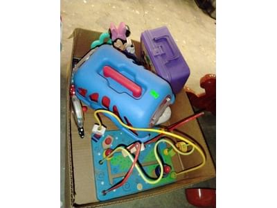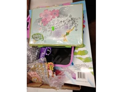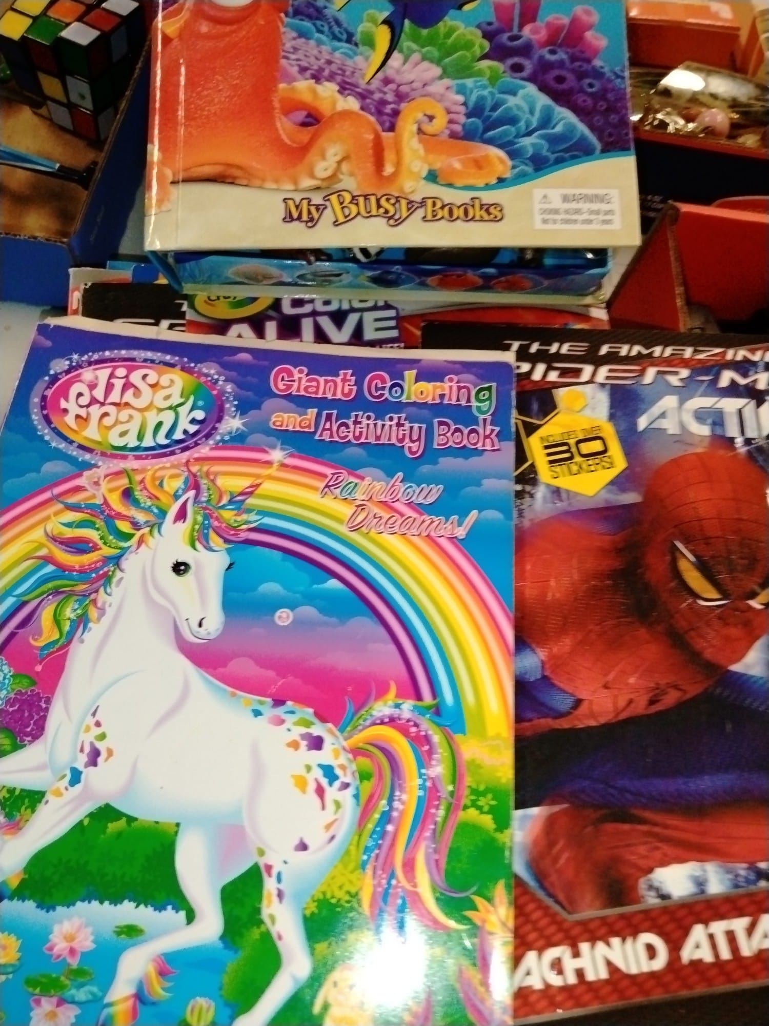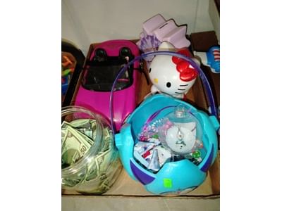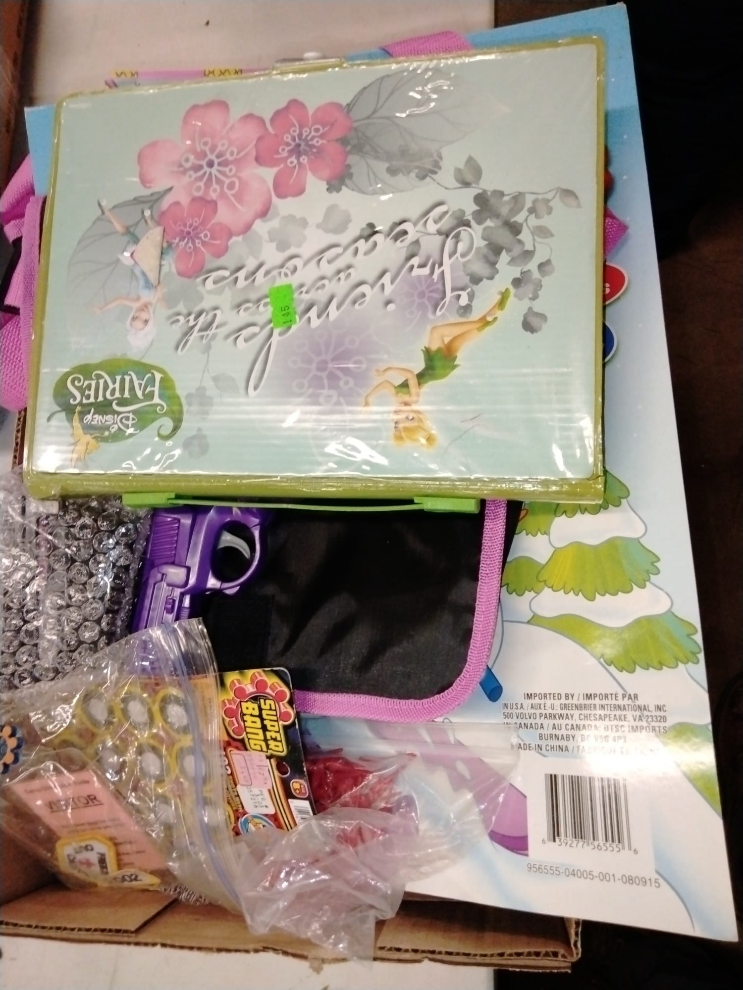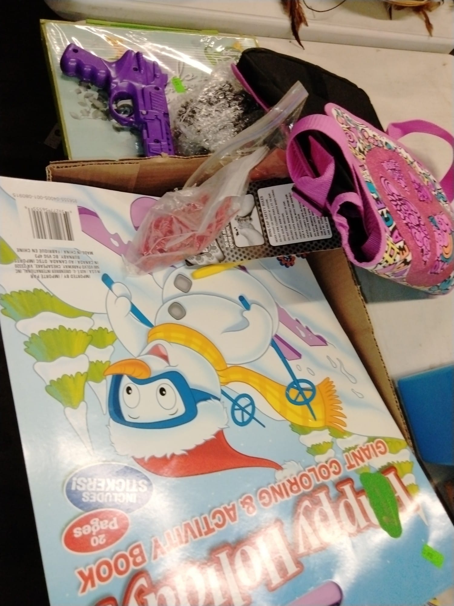 145 Child’s Tote, coloring book, art box, cap gun, miscellaneous