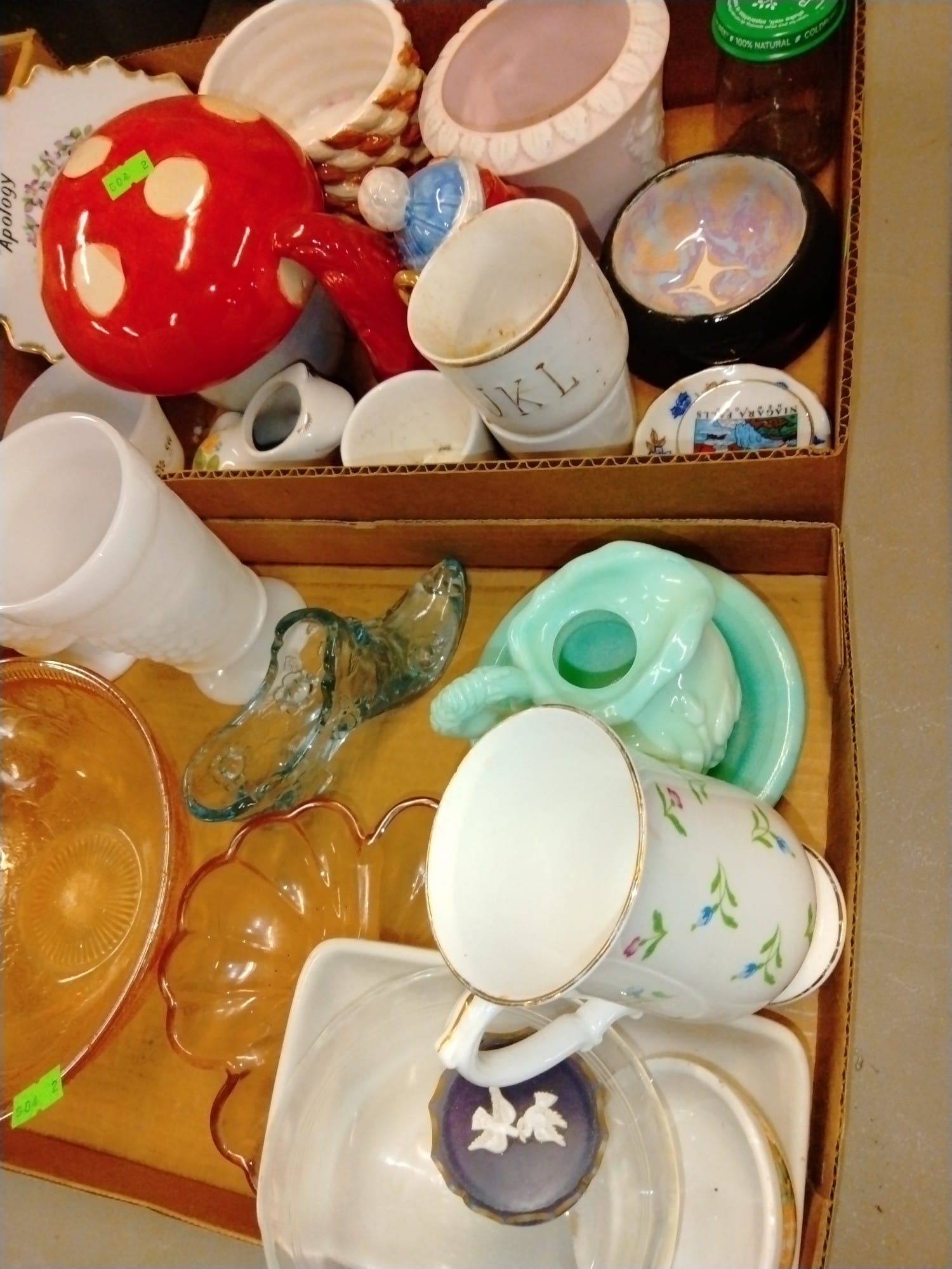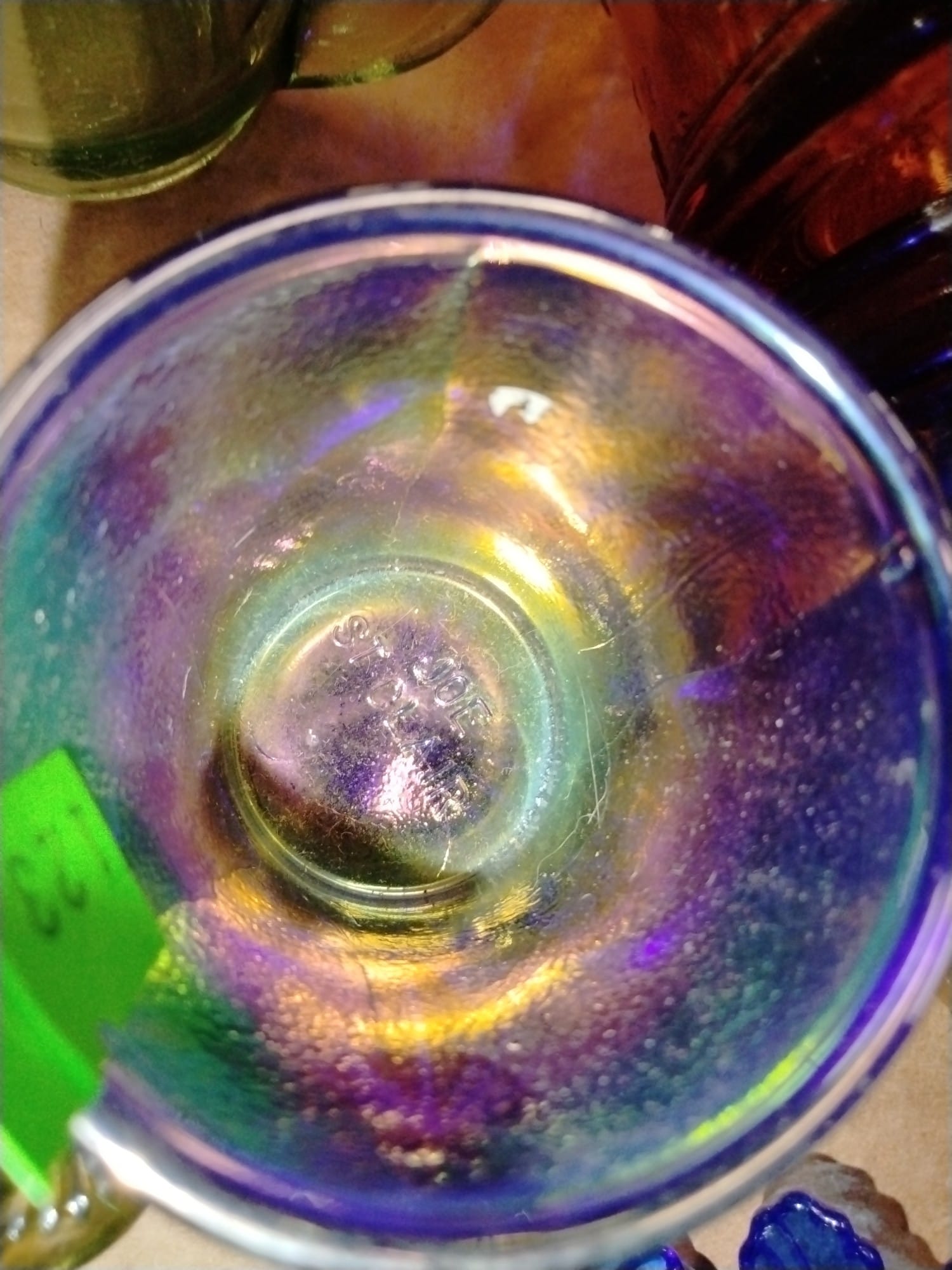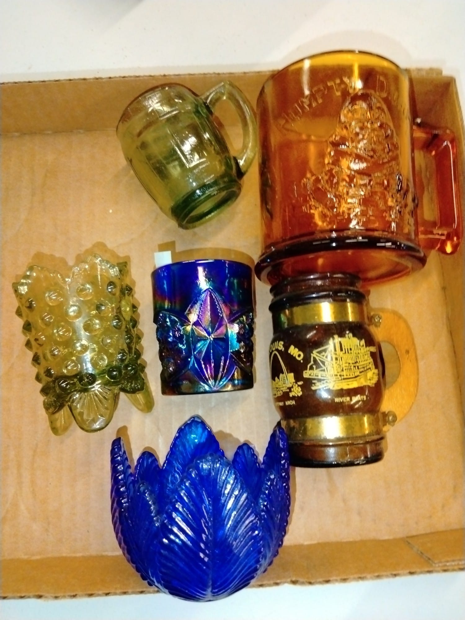 123 Joe St Clair carnival glass toothpick holder, Fenton toothpick holder, Humpty Dumpty mug, souvenir cup, green toothpick holder