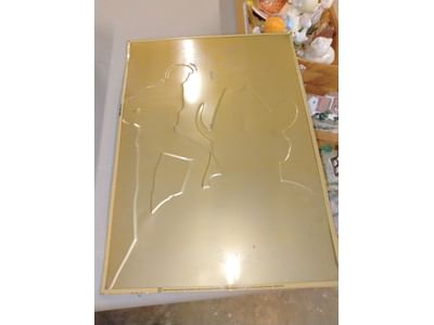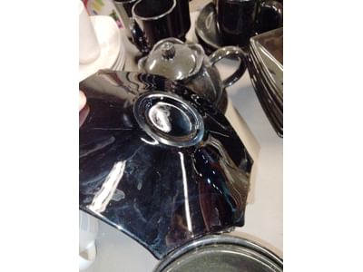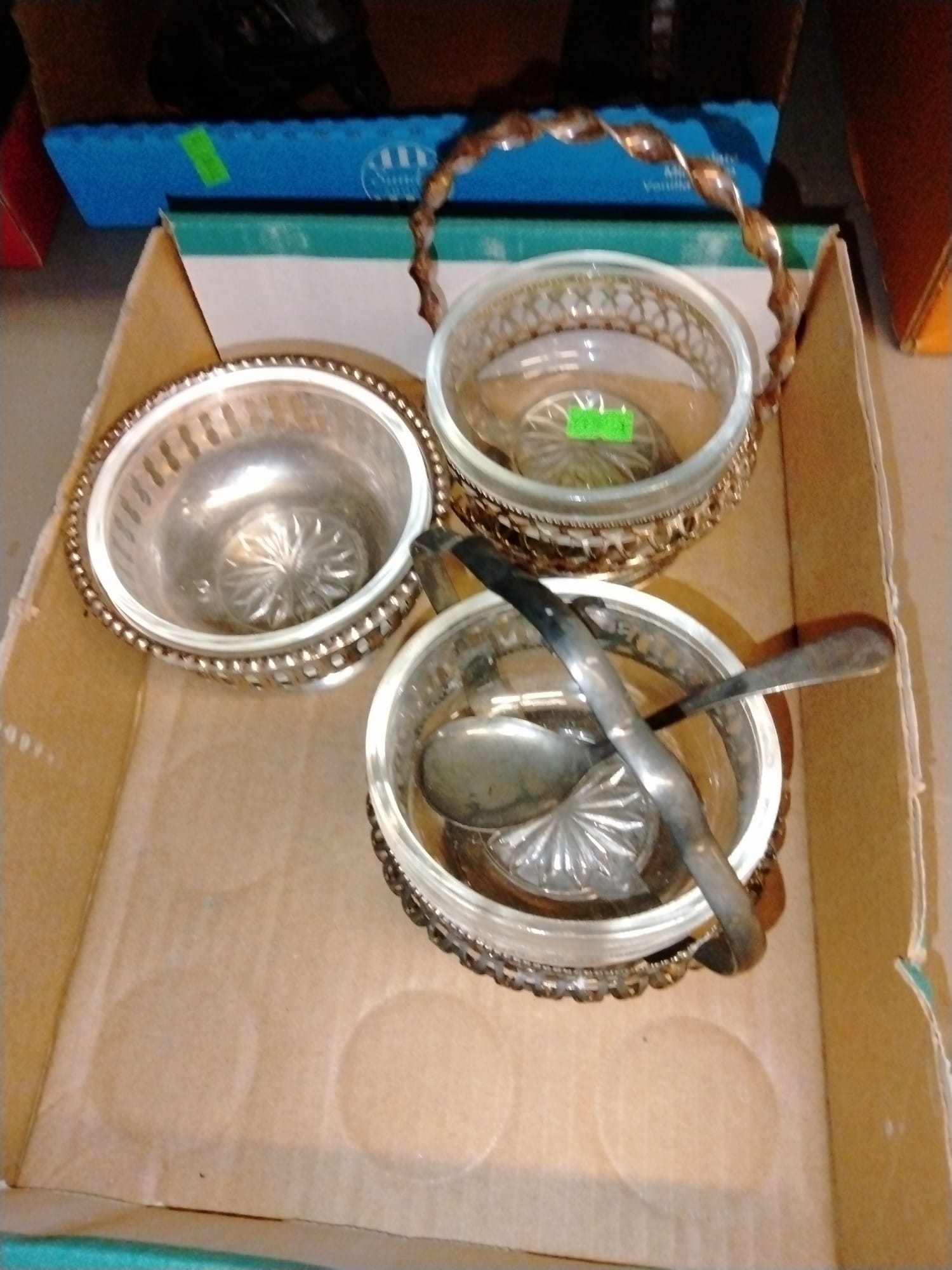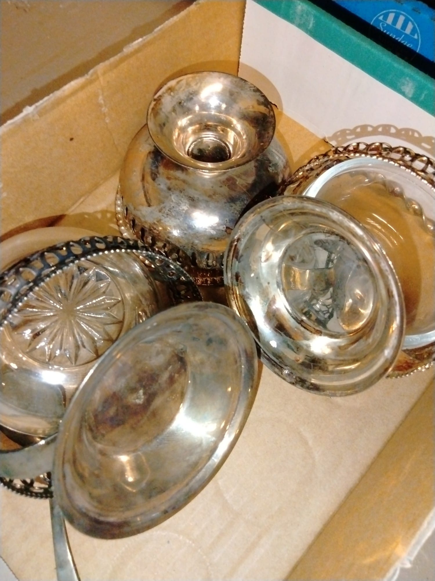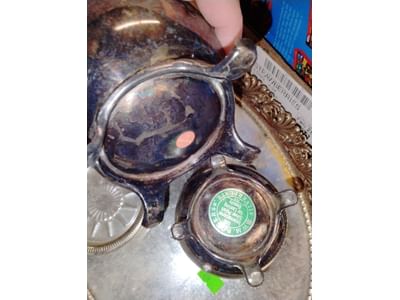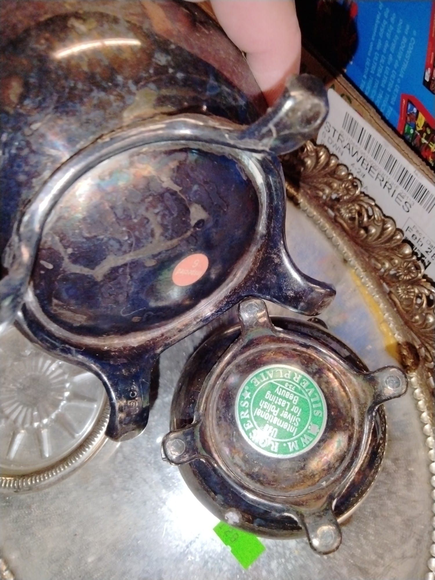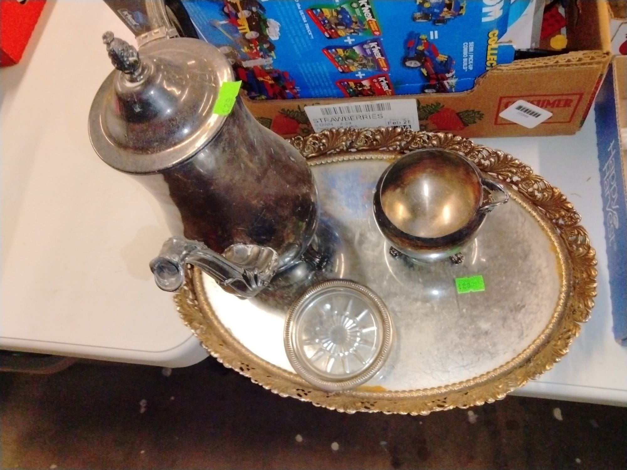 129 Silver plate teapot and creamer with damage, coaster and vanity mirror tray