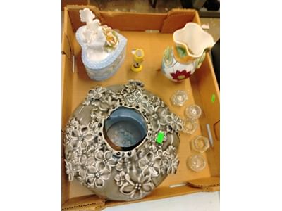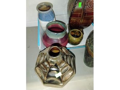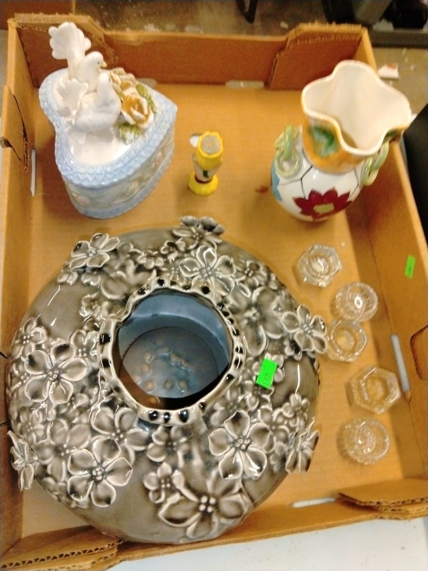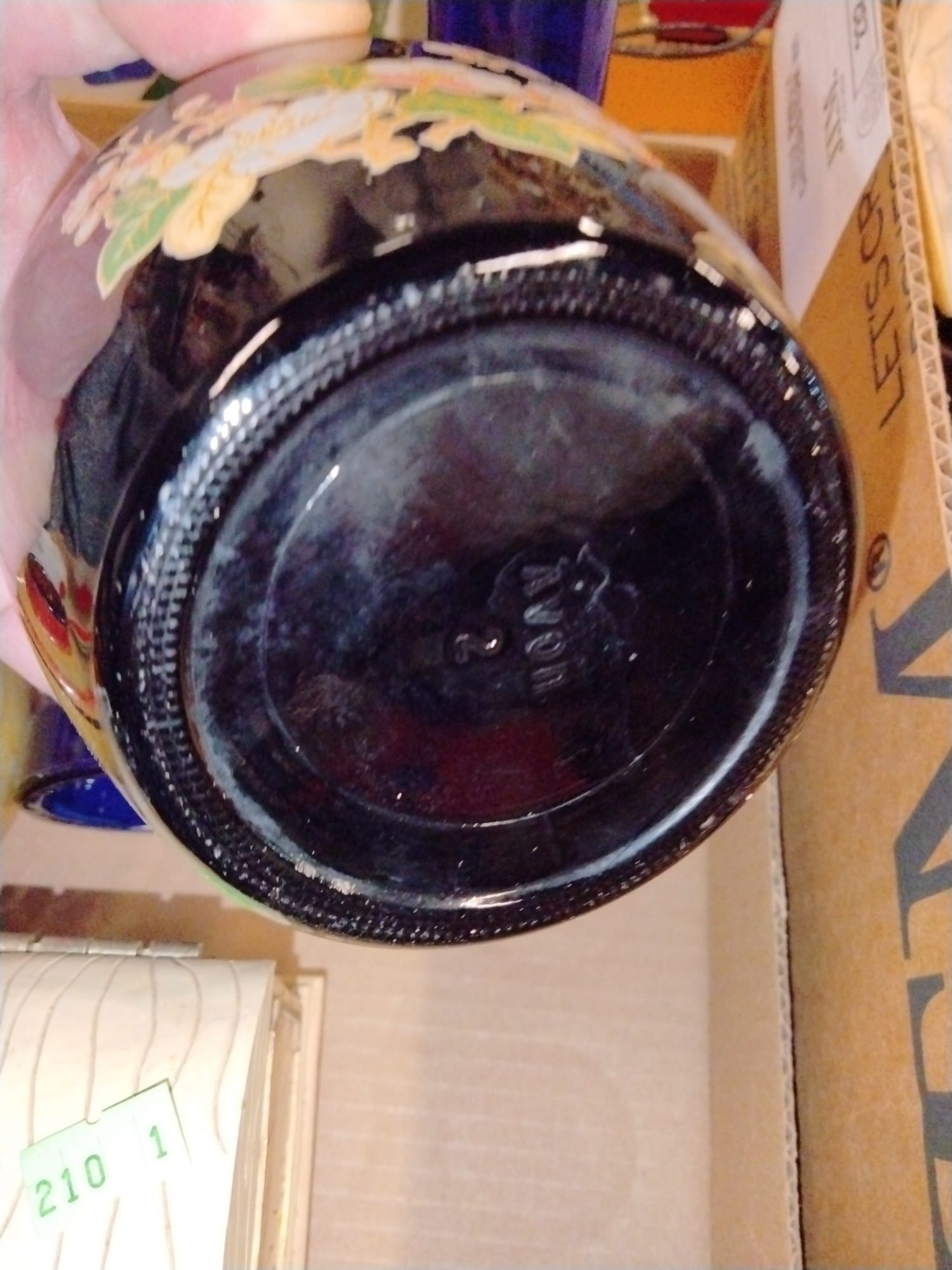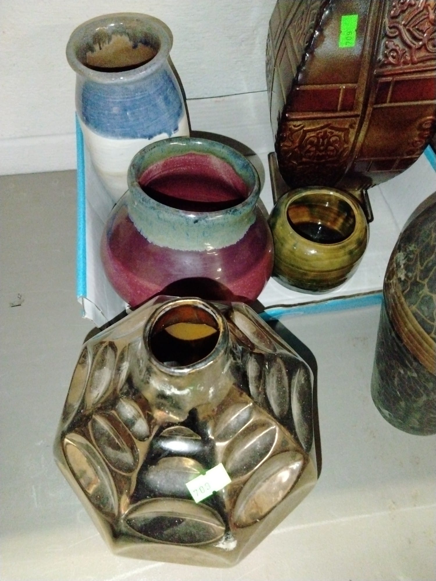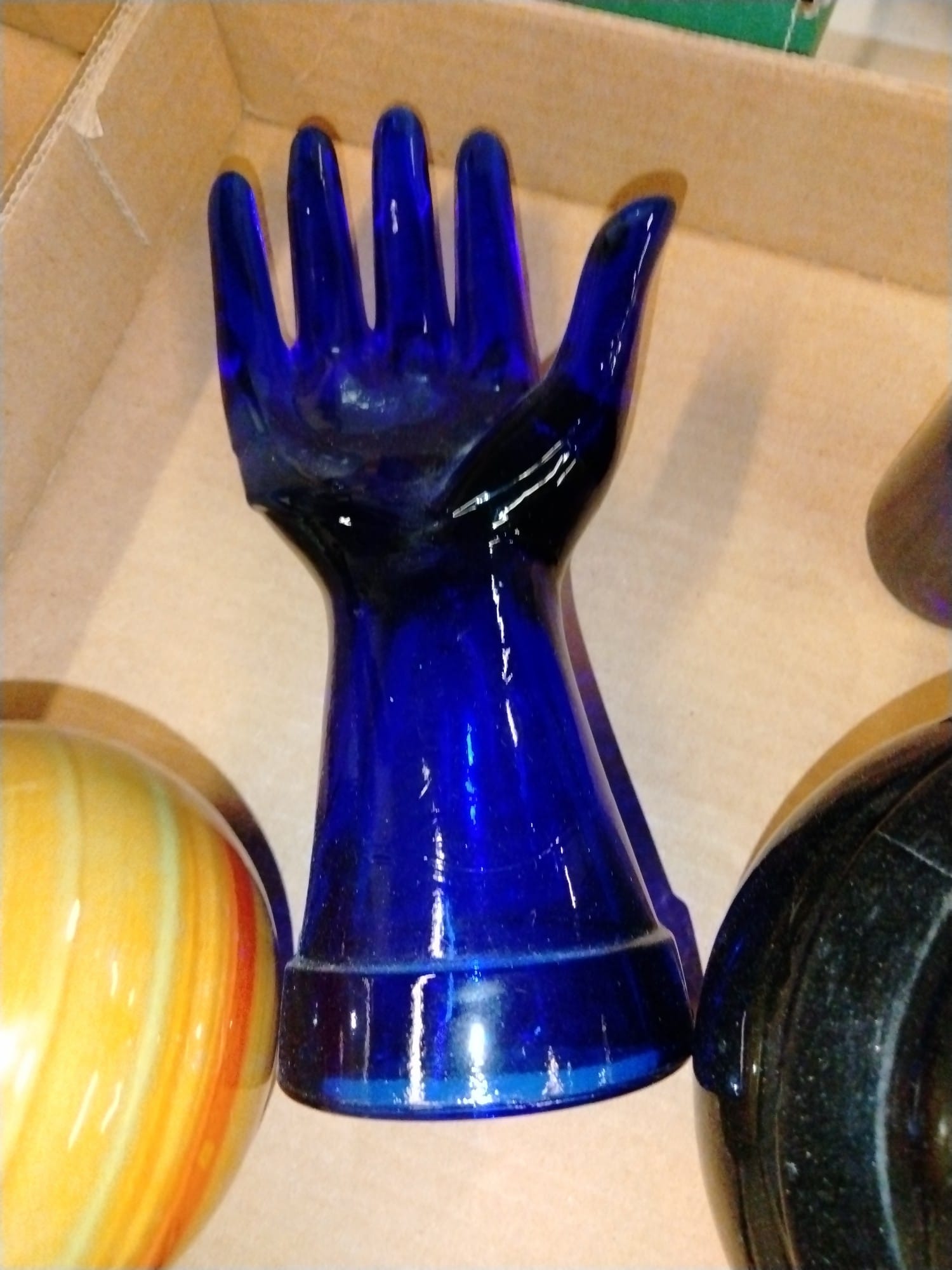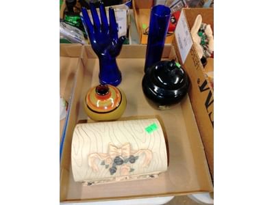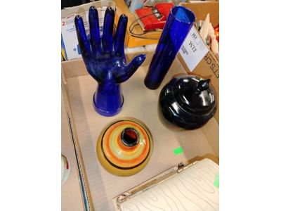 210 Jewelry box, Avon jar, Cobalt blue hand form and vase, pottery vase