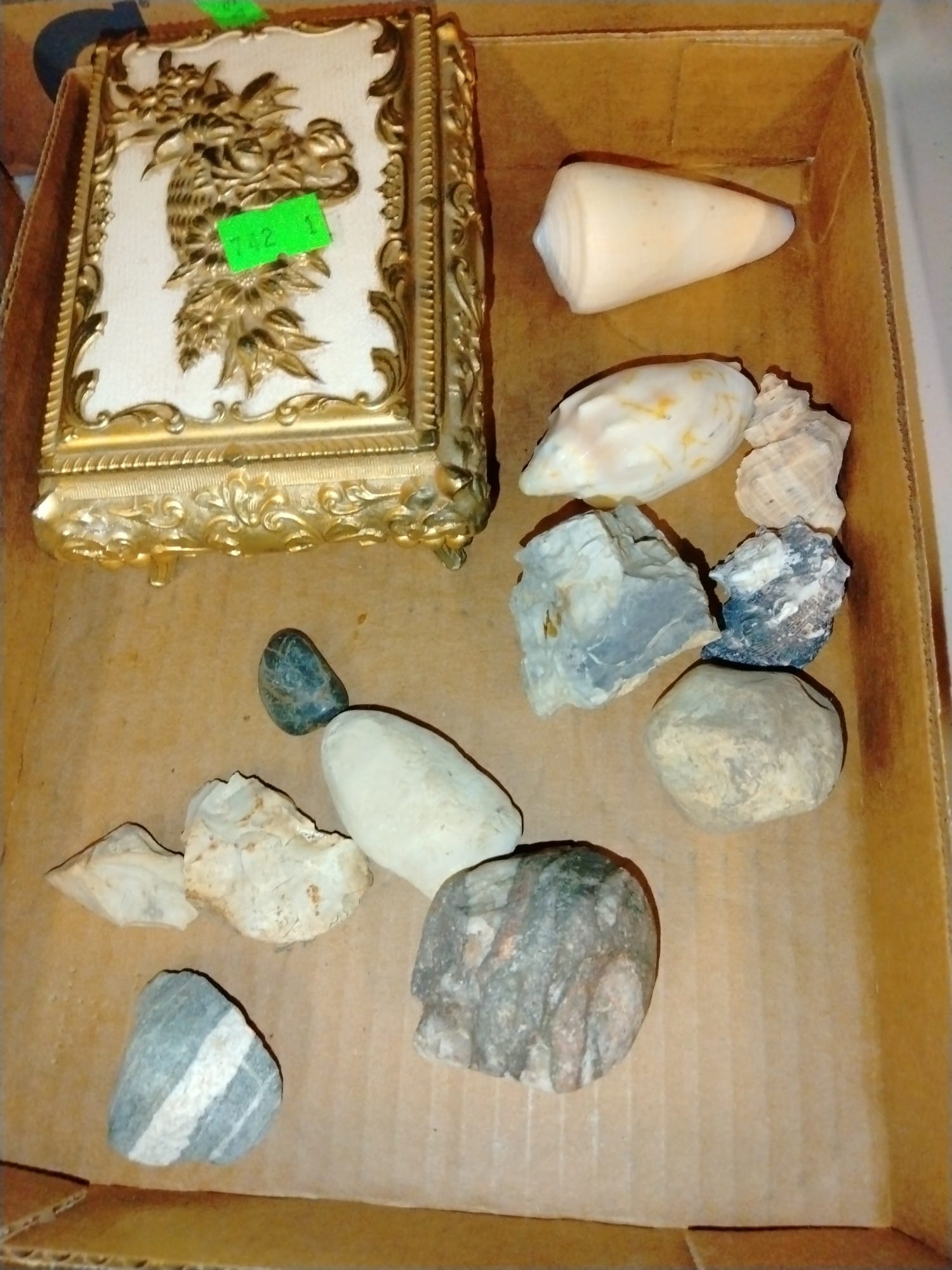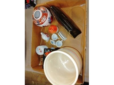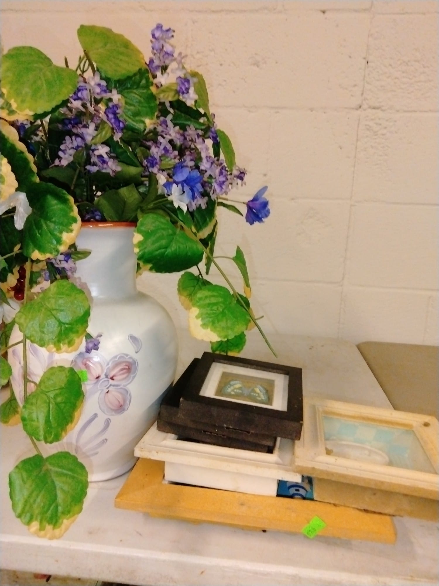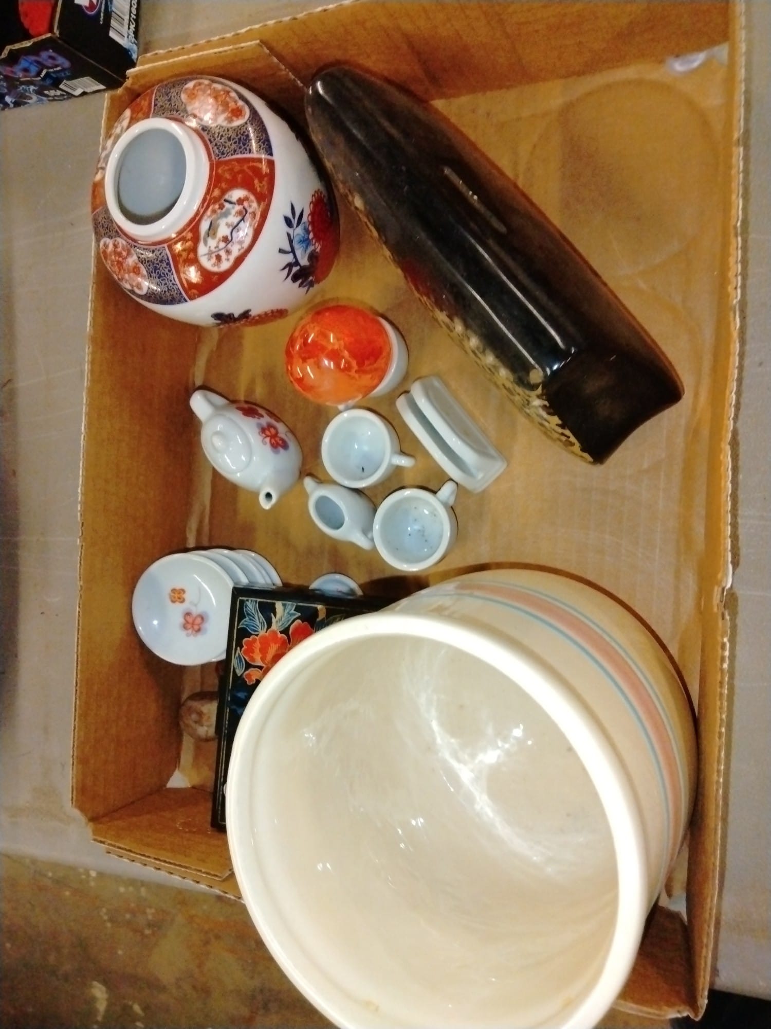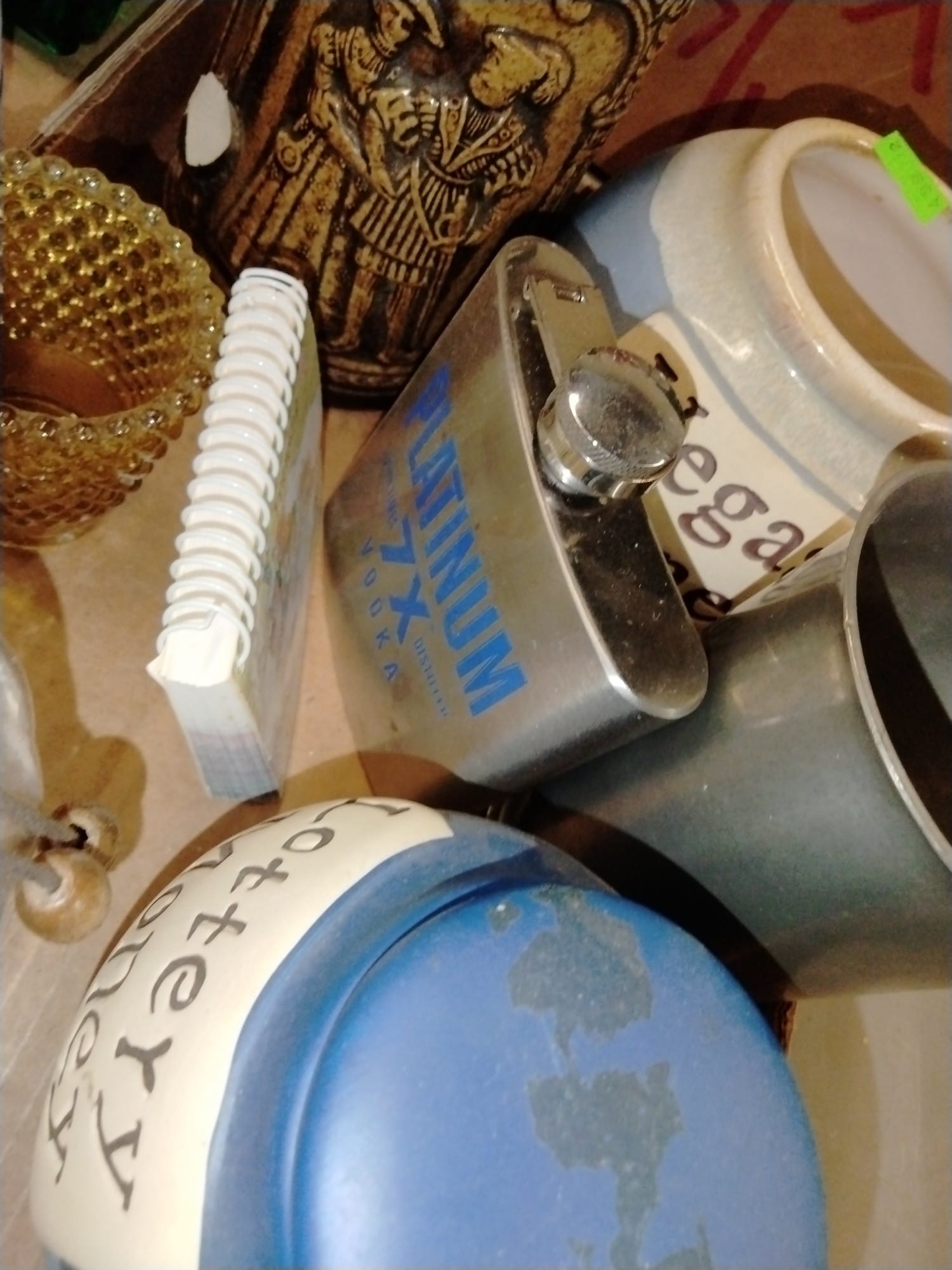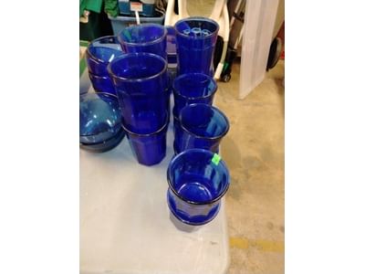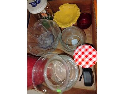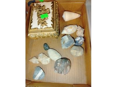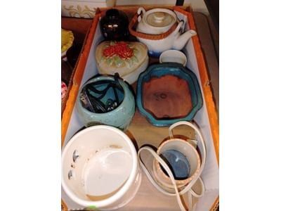 210 Jewelry box, Avon jar, Cobalt blue hand form and vase, pottery vase