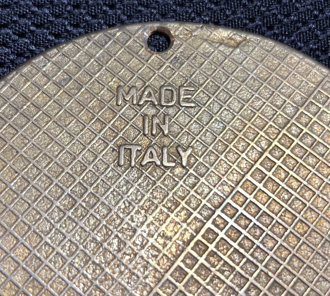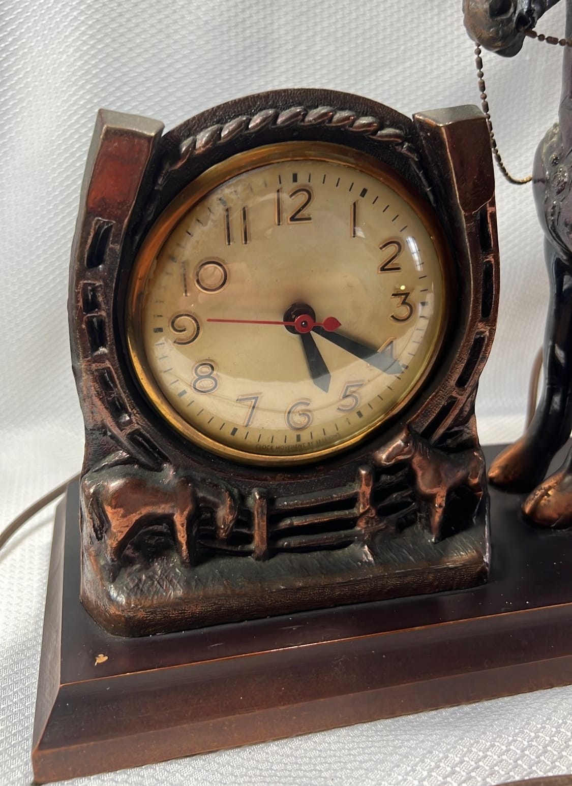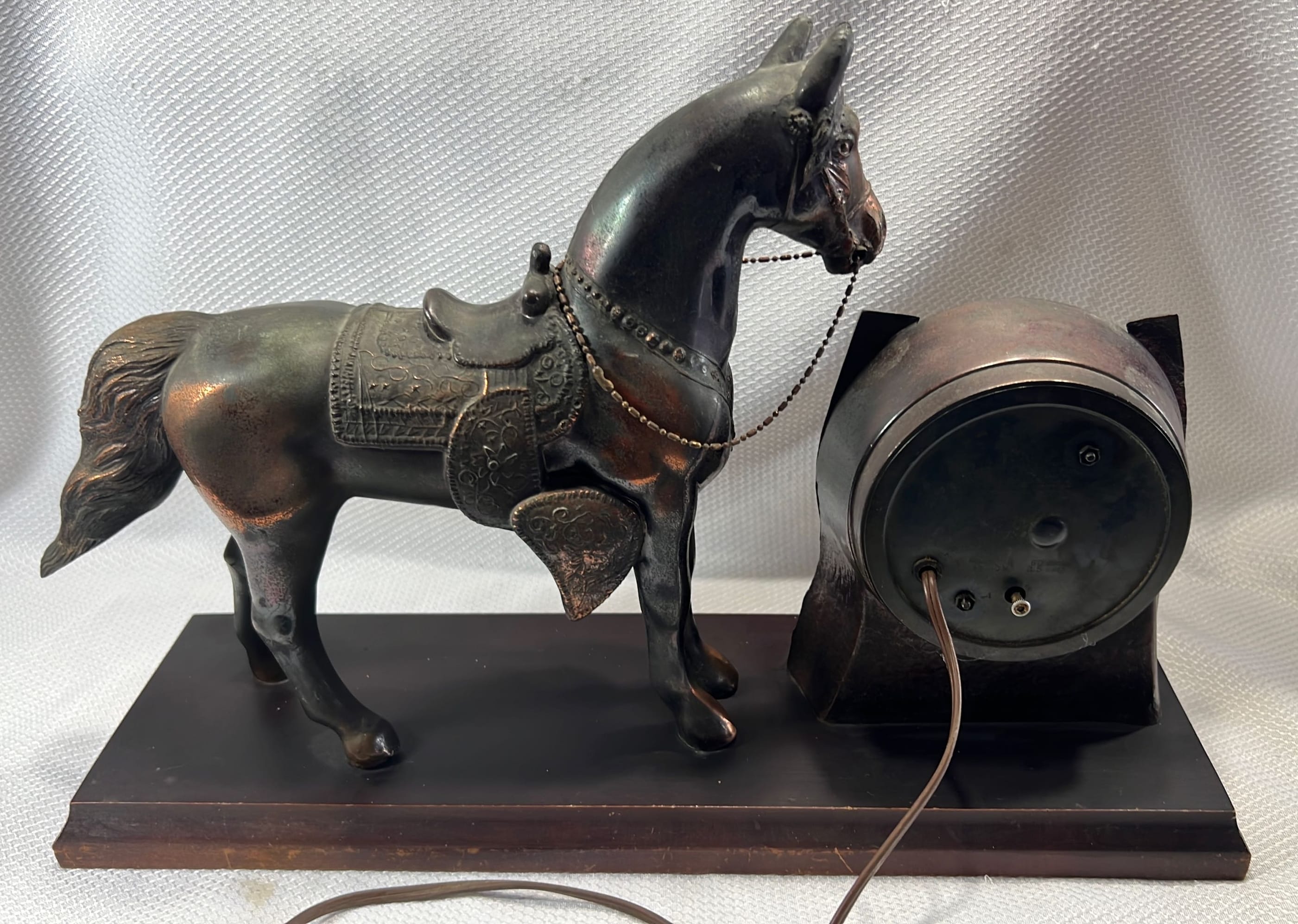 22 1950’s Horse clock with horseshoe dial, bronze color, is in working condition.