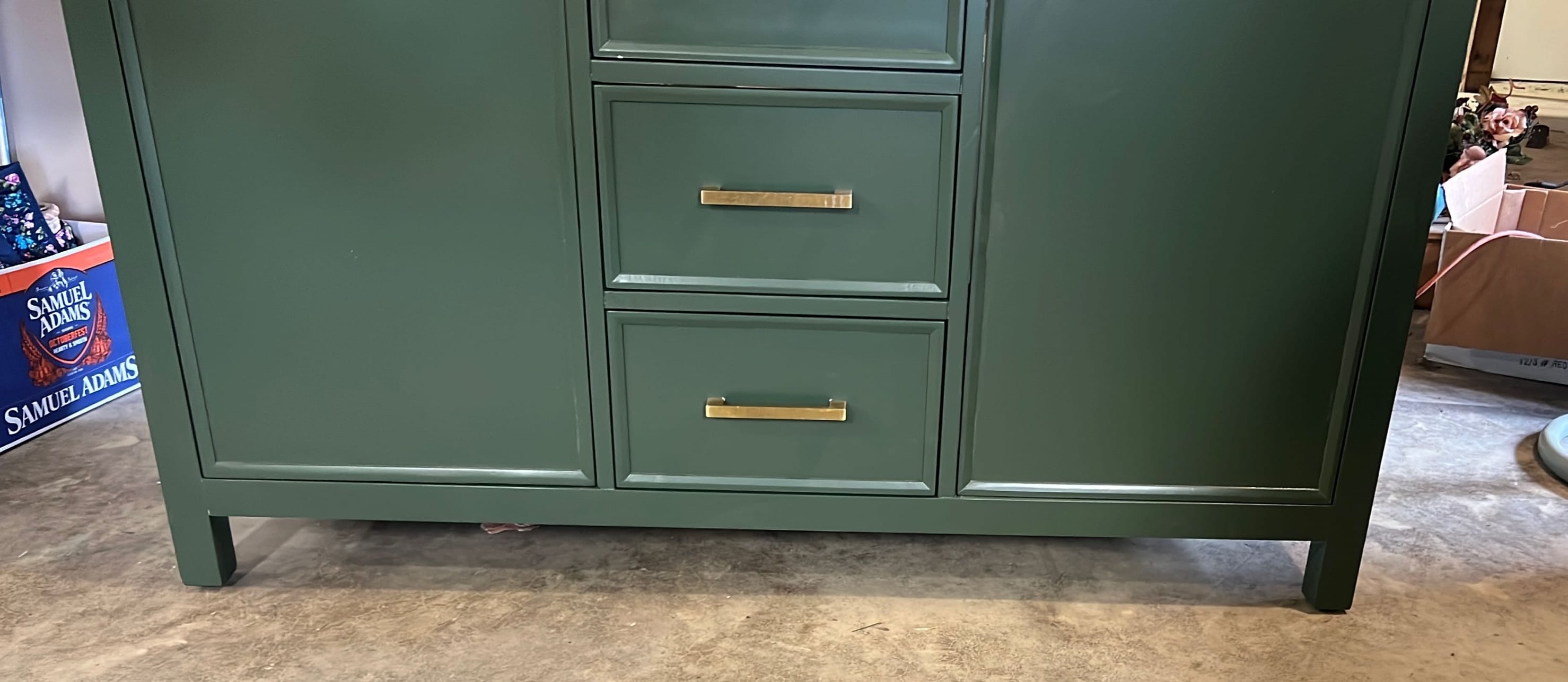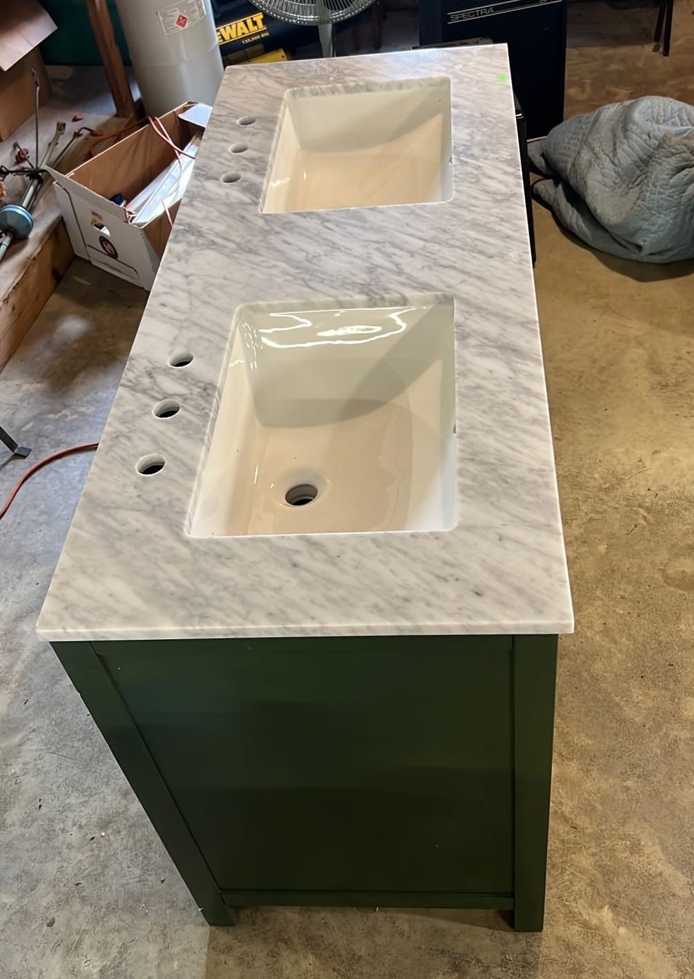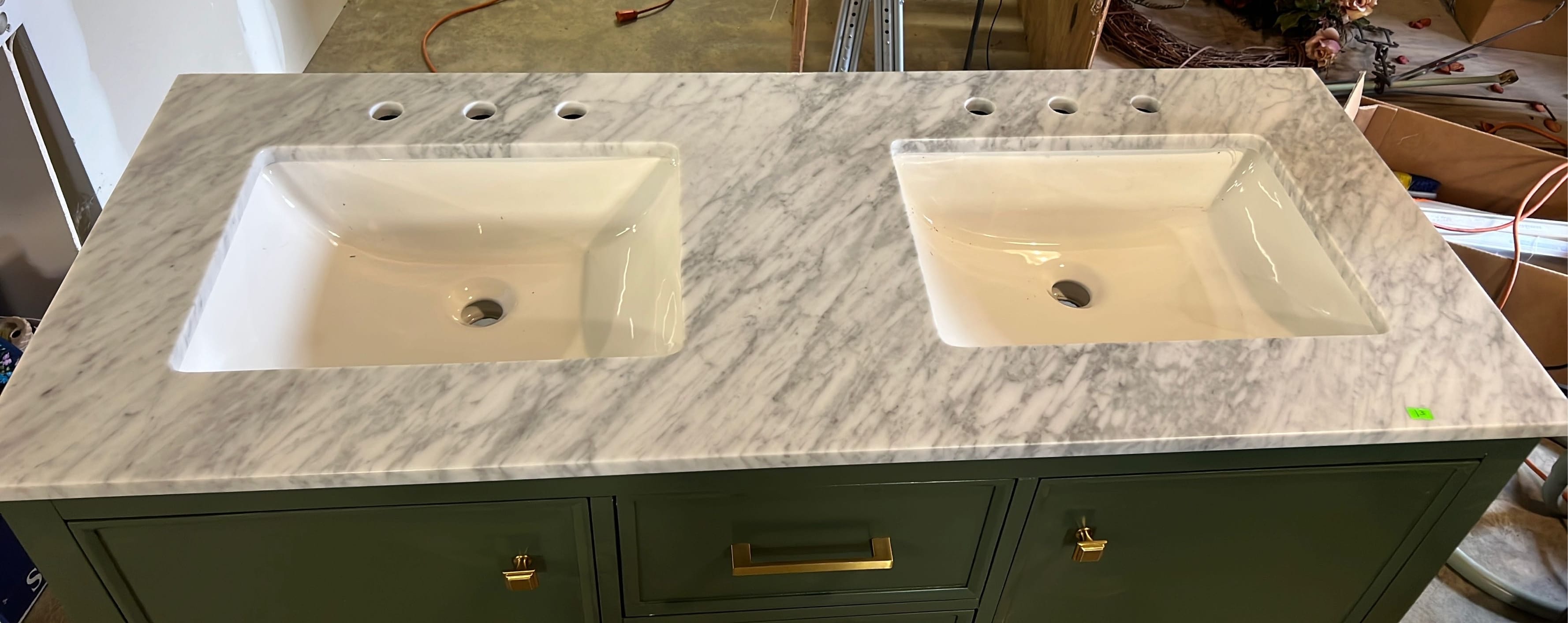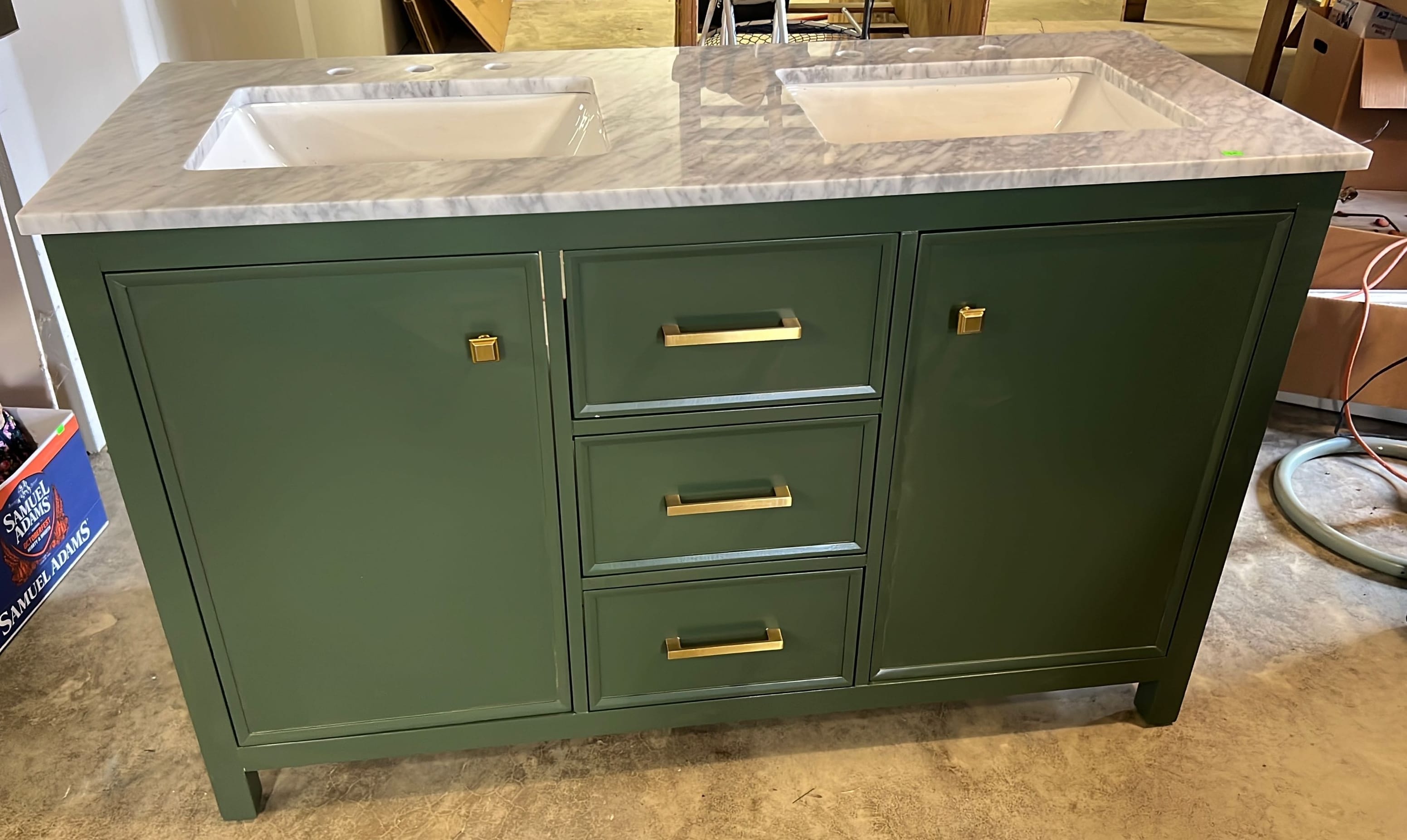 13 New 54” Double Marble Sink Vanity w/ 1 back leg repaired (retail $1250)
