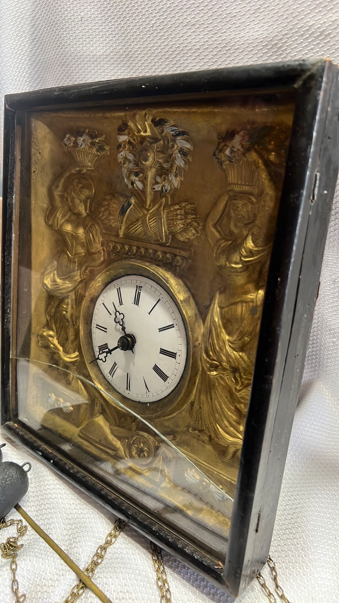 19 19th Century 10x11” Rahmenuhr/frame Clock - Brass Shield Poly Chrome, enamel dial, pendulum movement w/ 2 weights