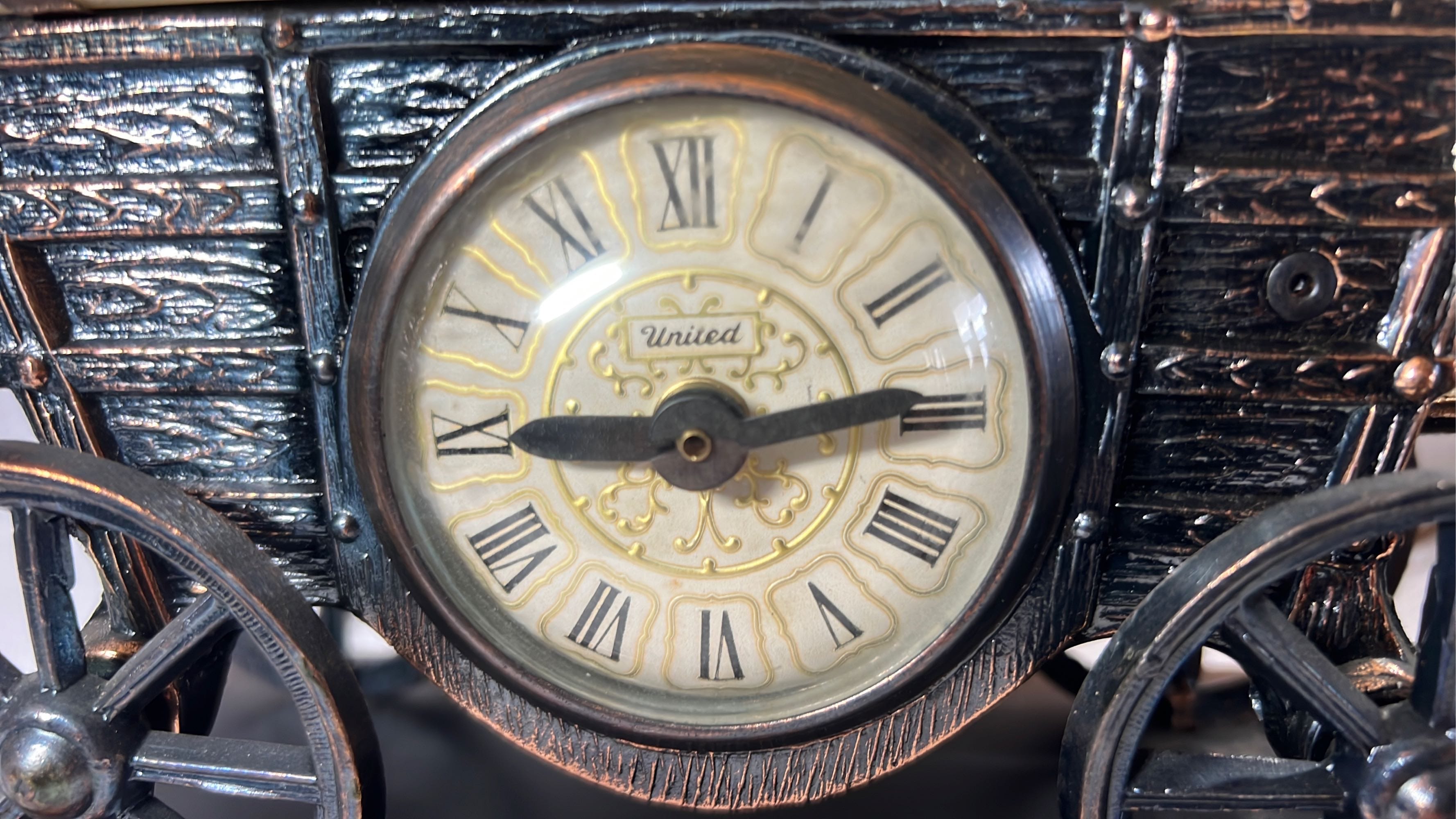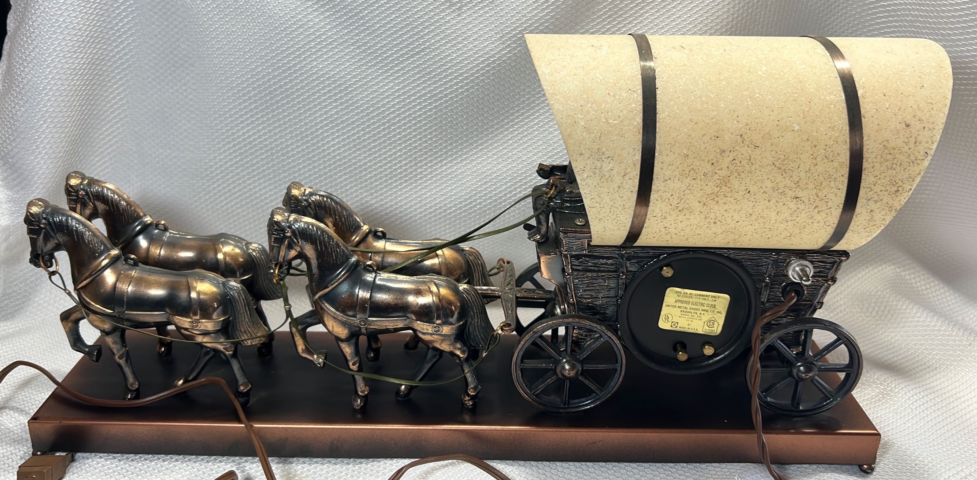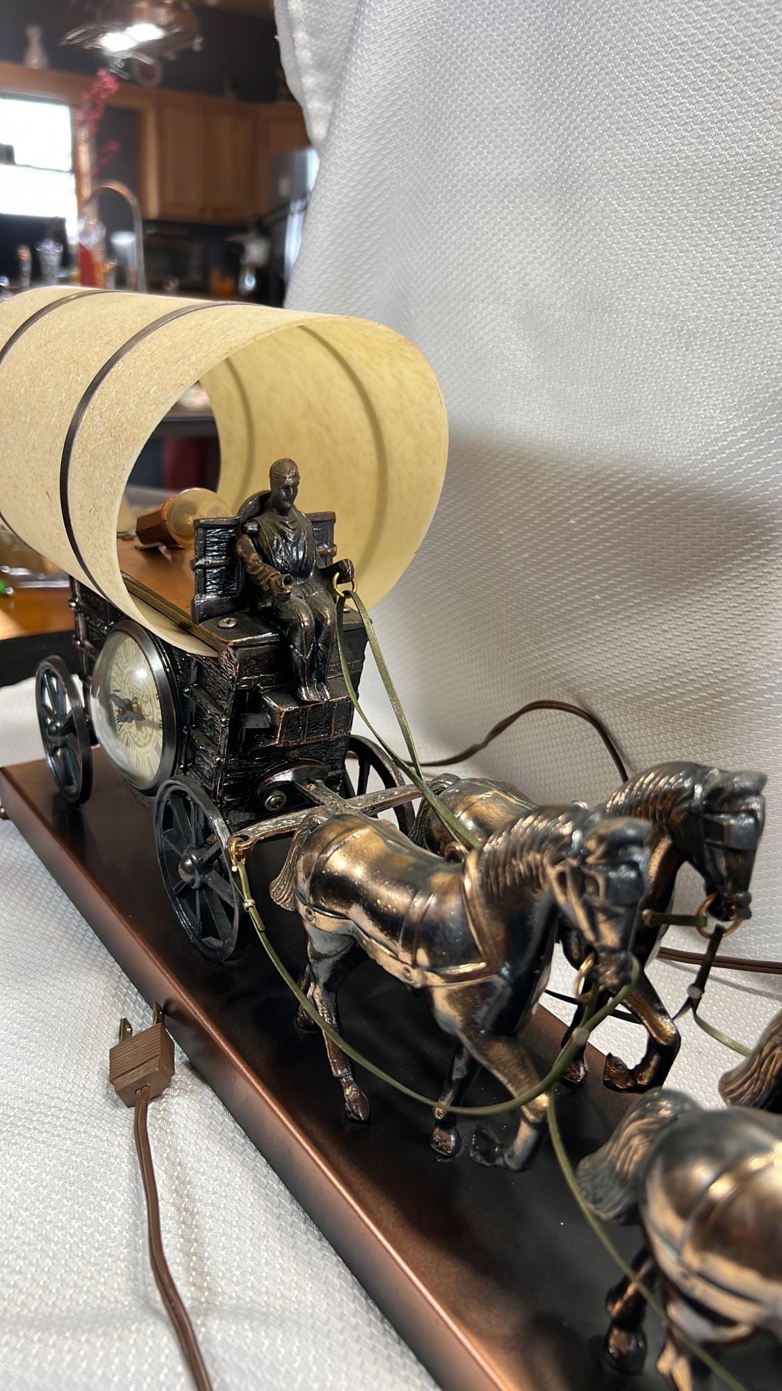 21 Vintage United Clock (550 Metal Bronze Horses Covered Wagon) Wagon cover has light in working order. Near mint/mint condition