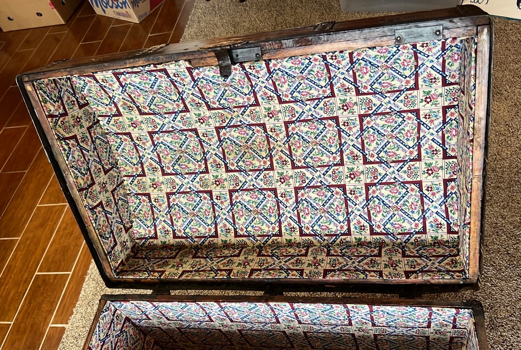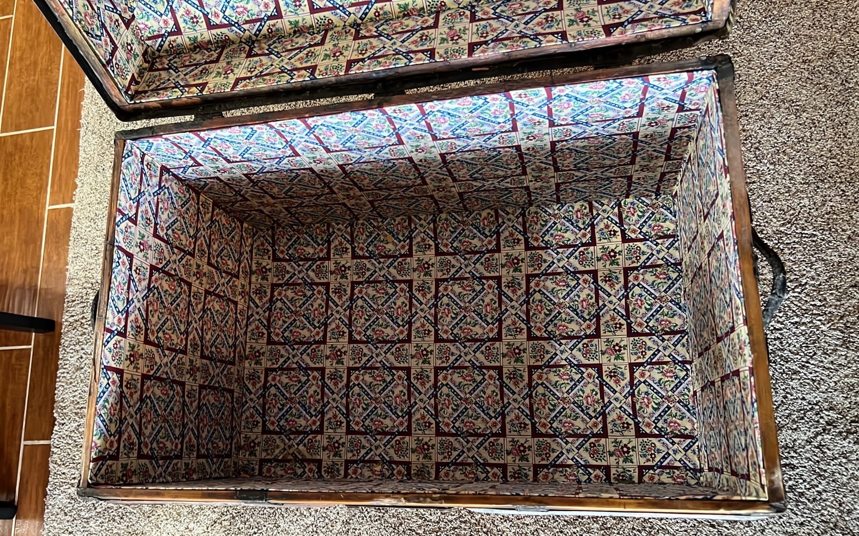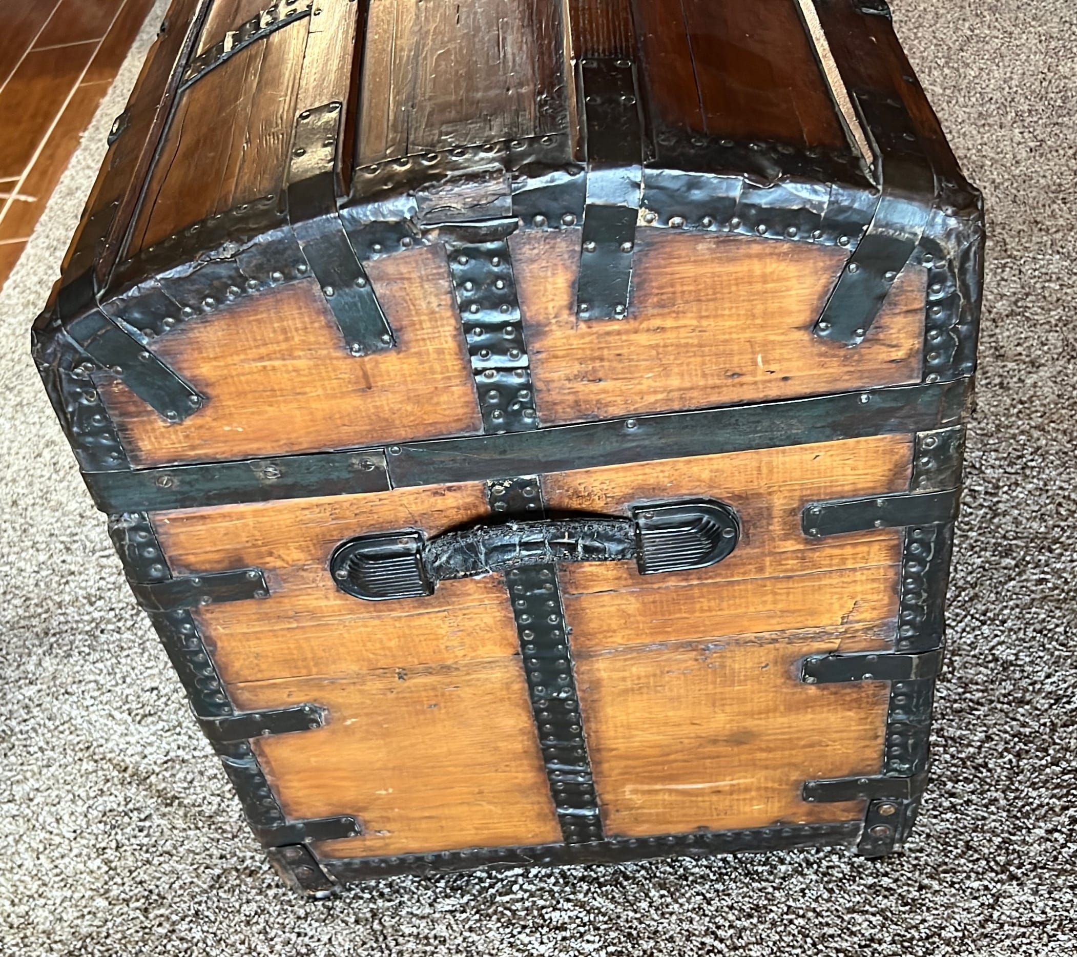 23b 19th Century large all wood domed top antique trunk. All matching design, w/ great patina 25” tall x 31.5” wide x 19” deep