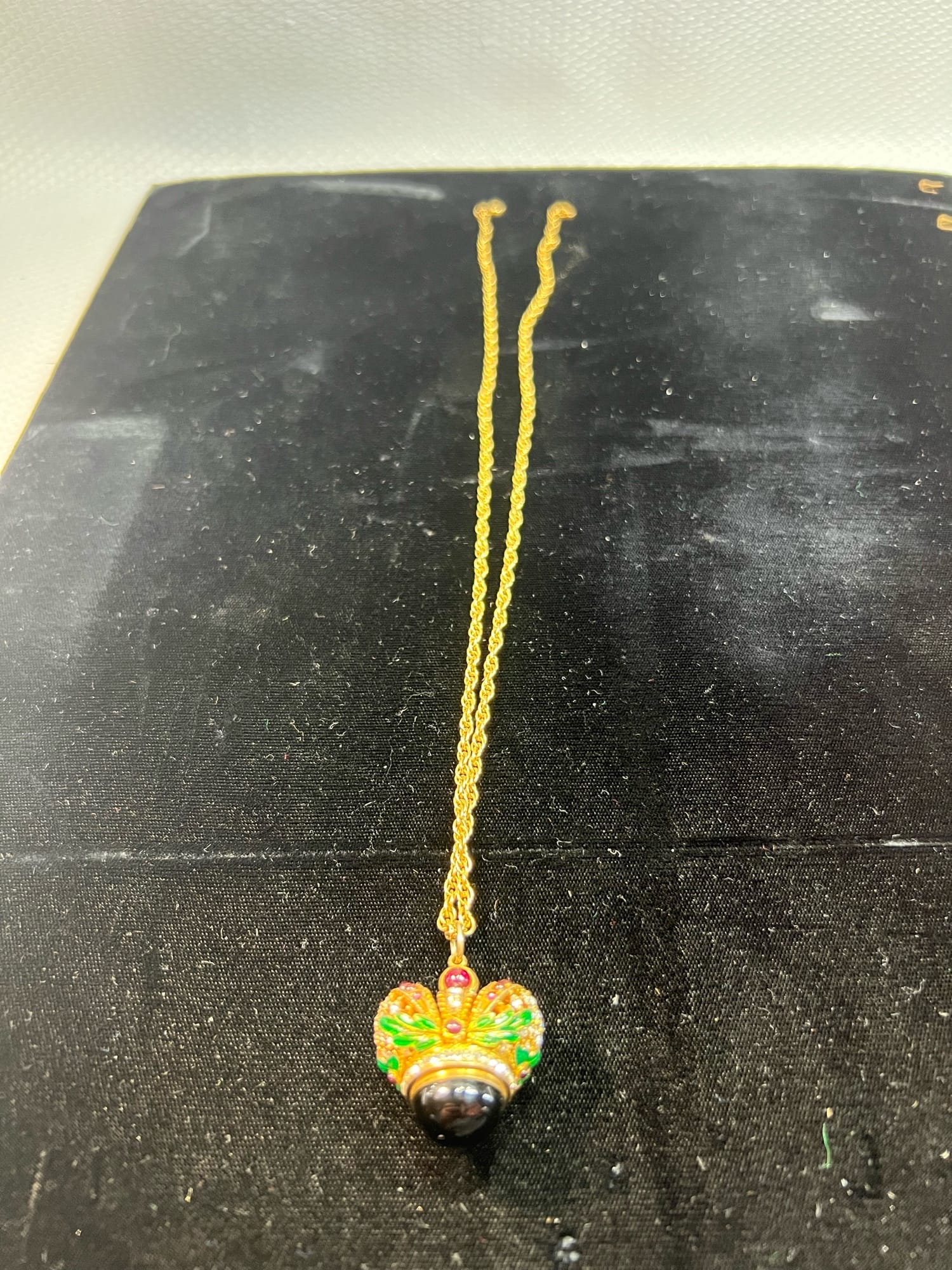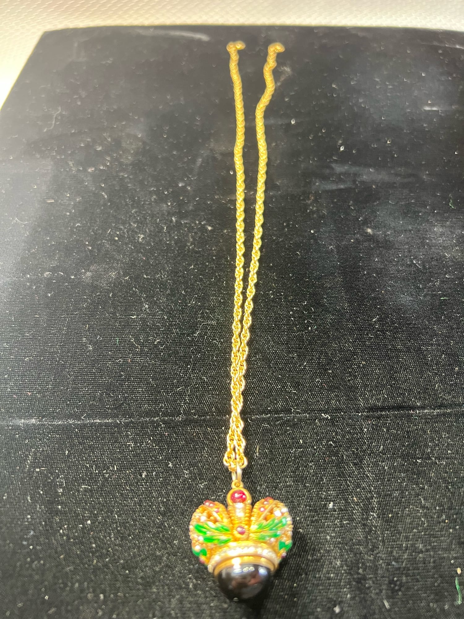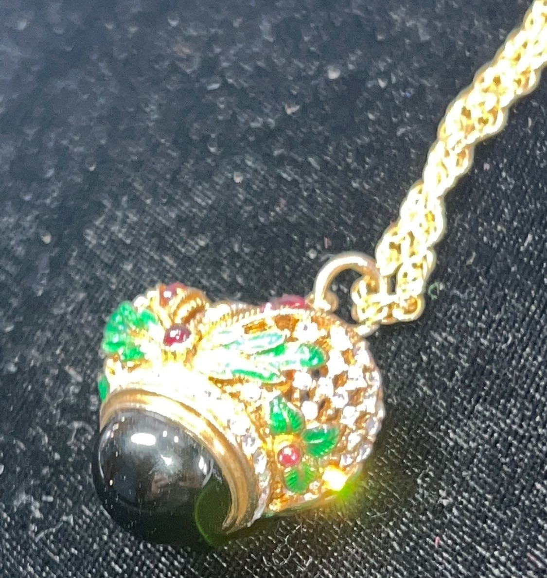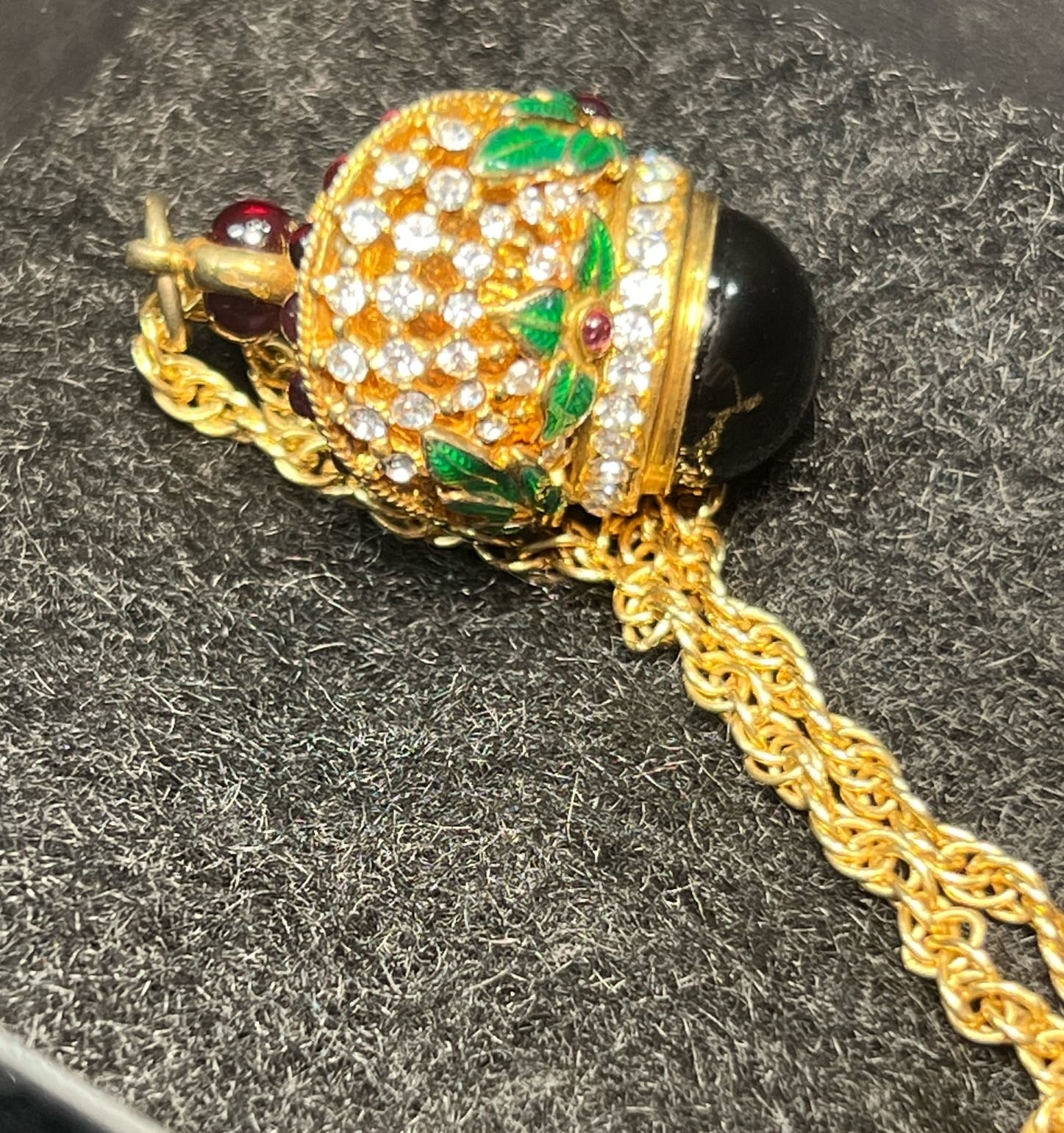 24 Malachite Sterling Silver Russian Enamel Imperial Crown Egg Pendant w/ garnets - chain marked 10kt