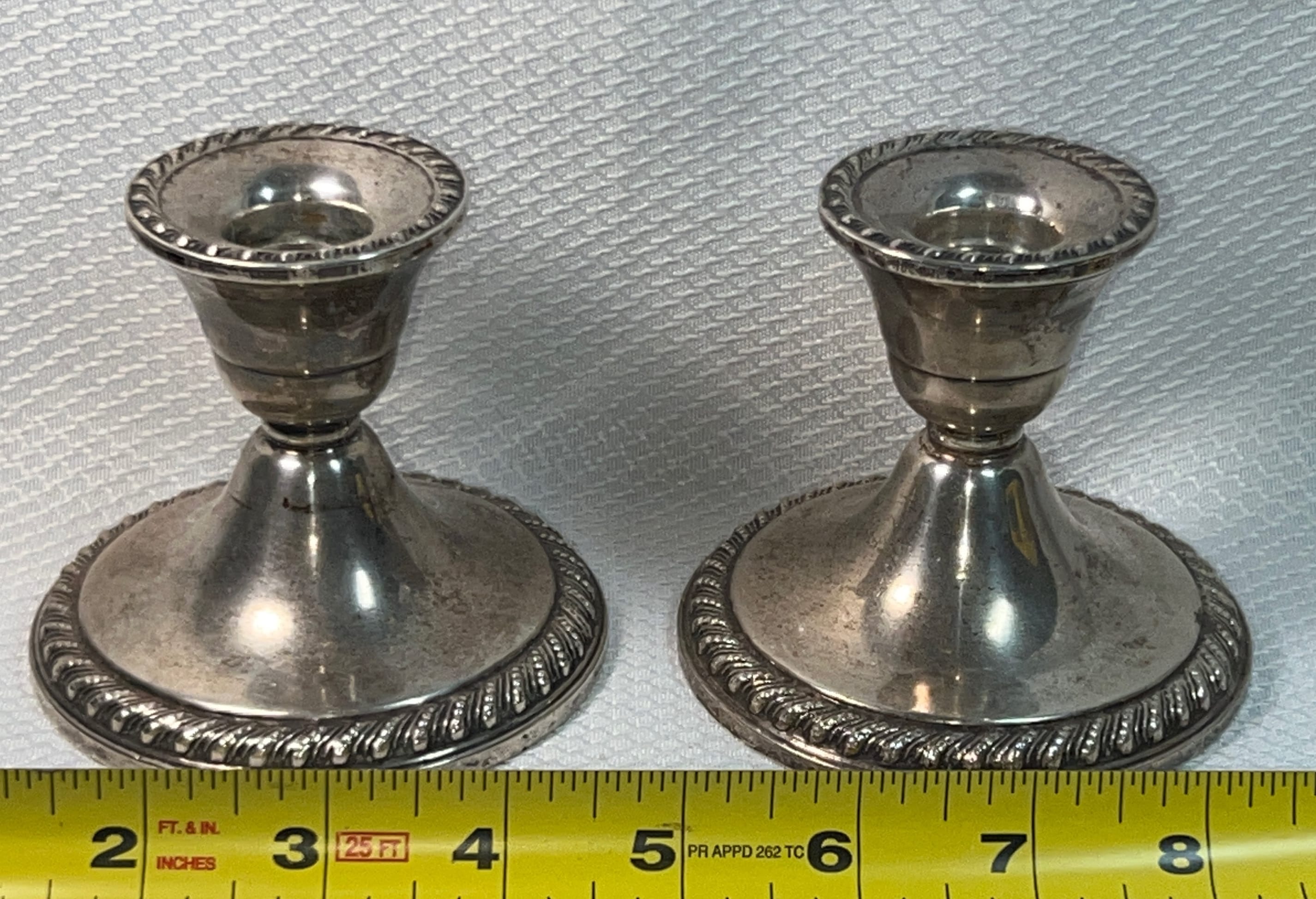 318 Pair of Nickle Candlesticks 7”, Weighted Candle Holder w/ Candle 8.5”
