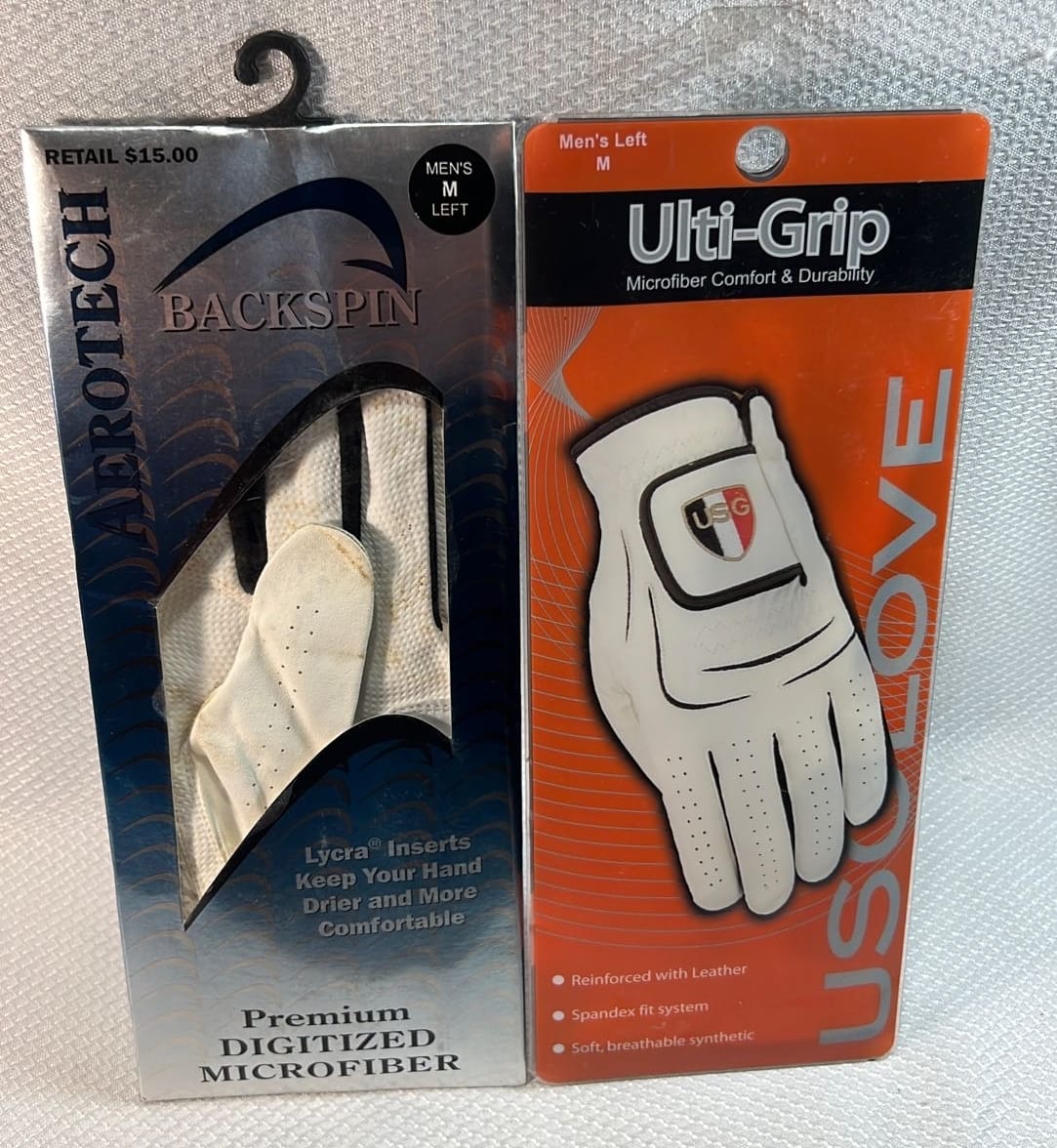 250 (2) New Golf Gloves - Ulti-Grip Microfiber Comfort & Duribility (Men’s Medium Left), Aerotech Backspin Premium Digitzed Microfiber (Men’s Medium Left)