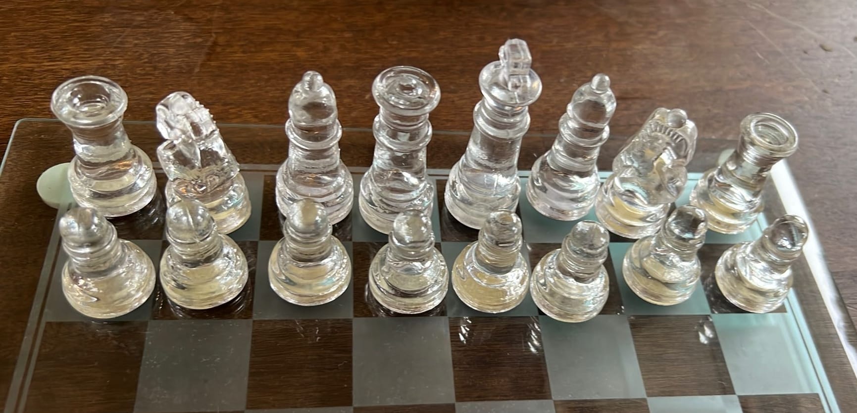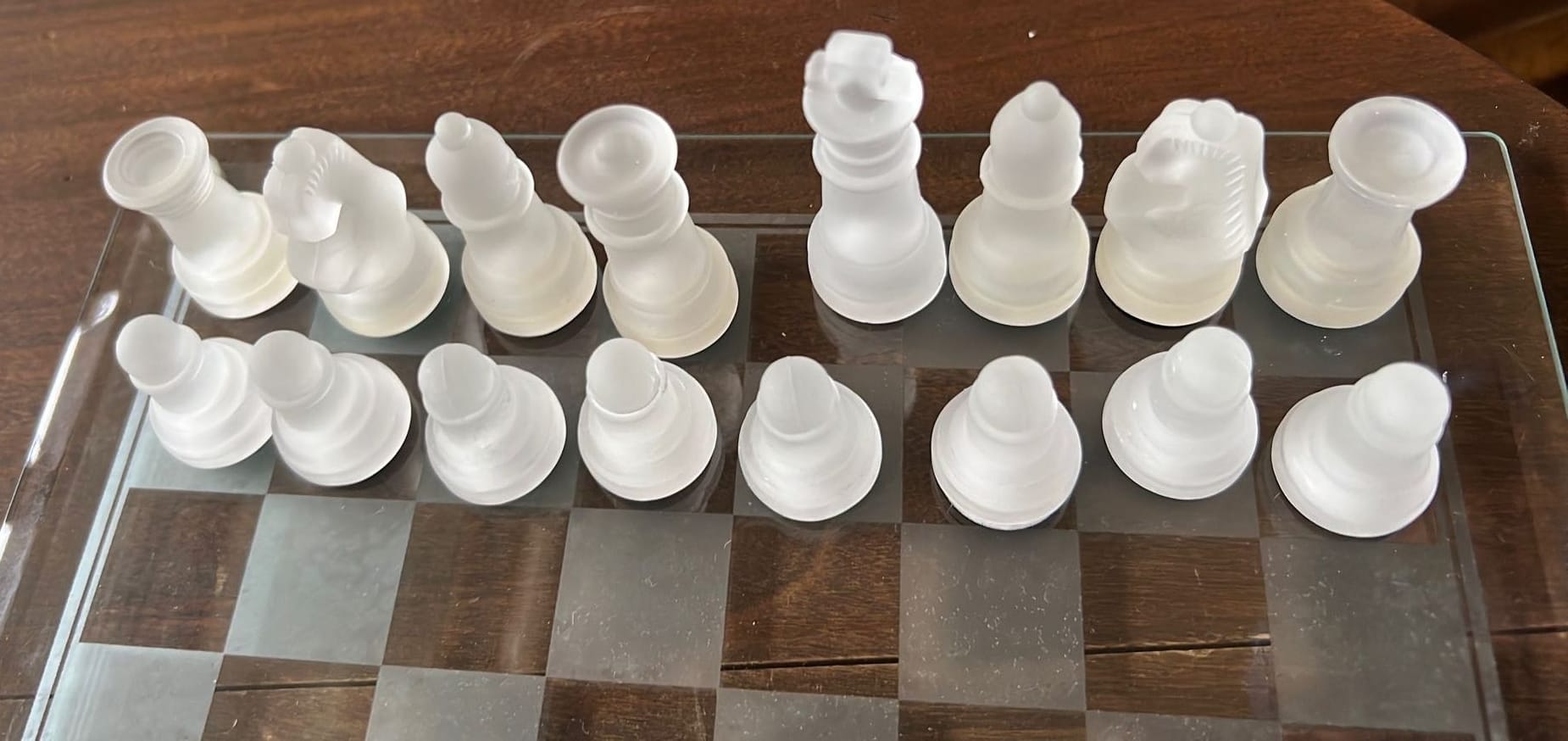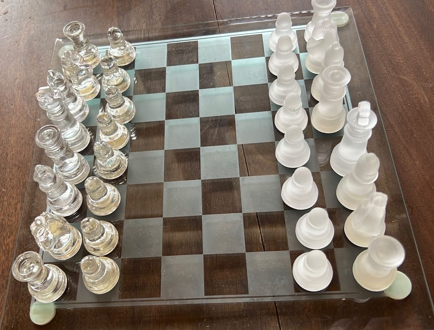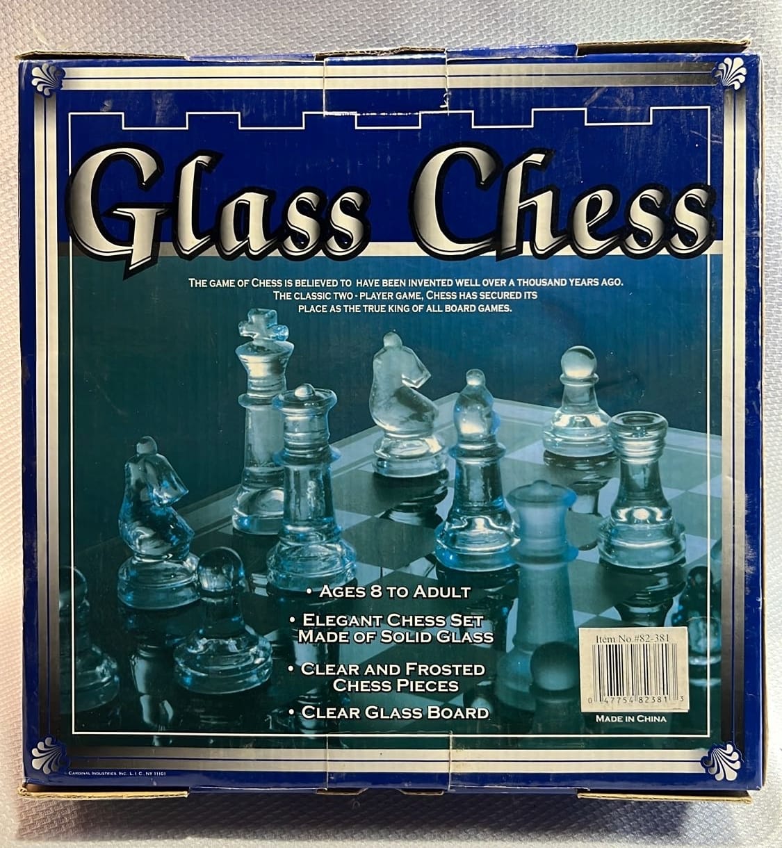 260 NIB Elegant Chess Set made of Solid Glass with Clear and Frosted Chess pieces & Clear Glass Board