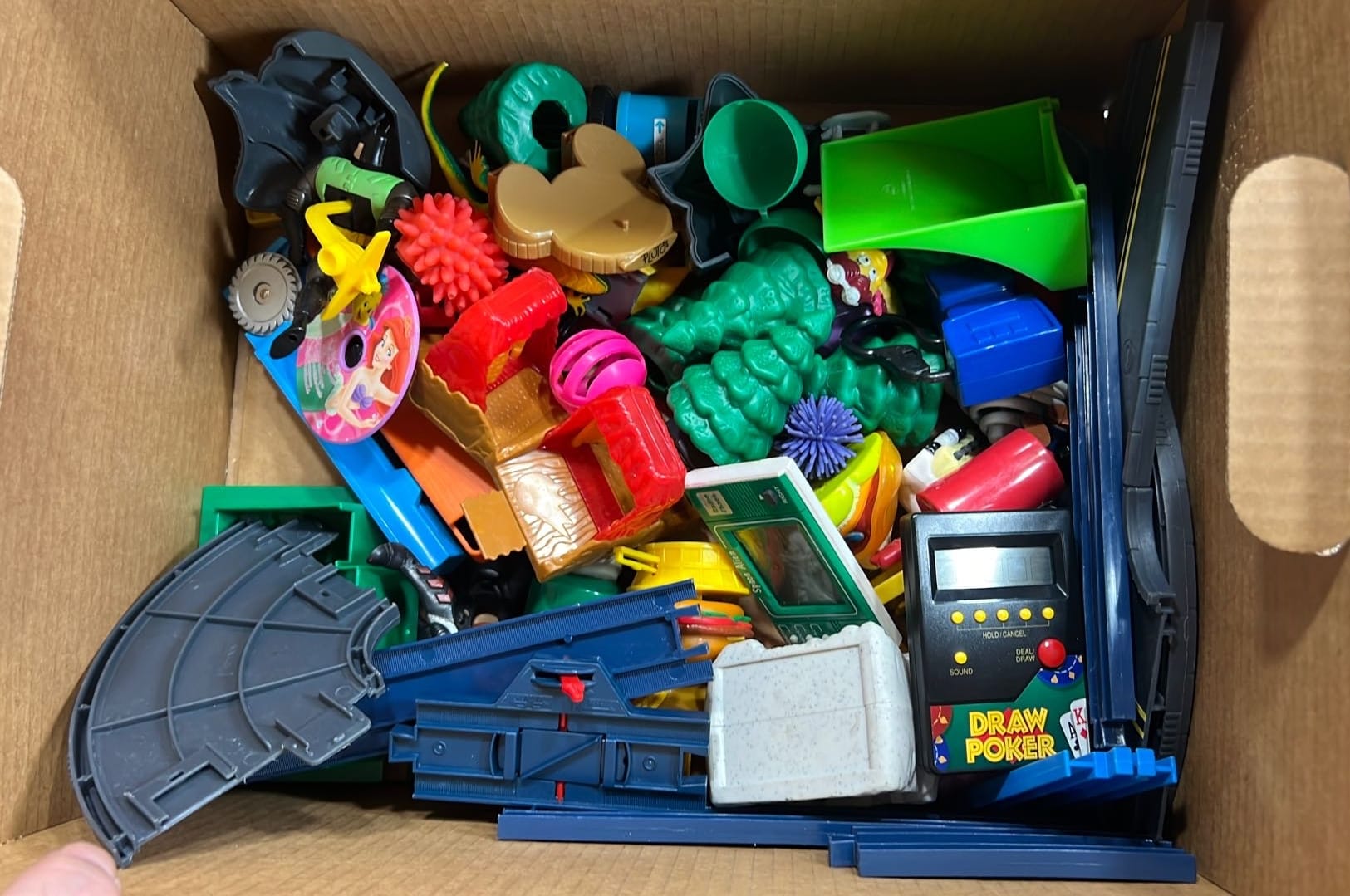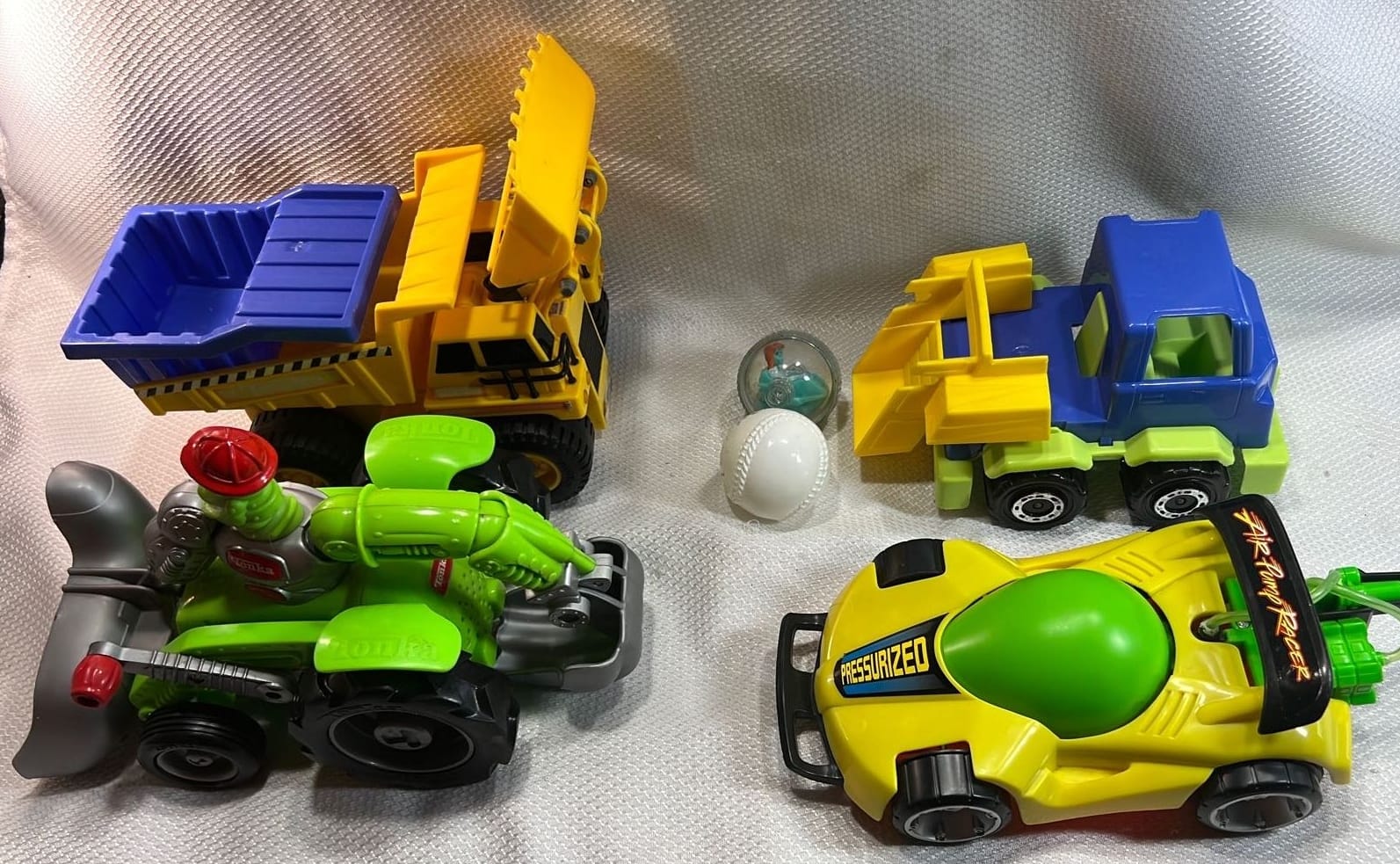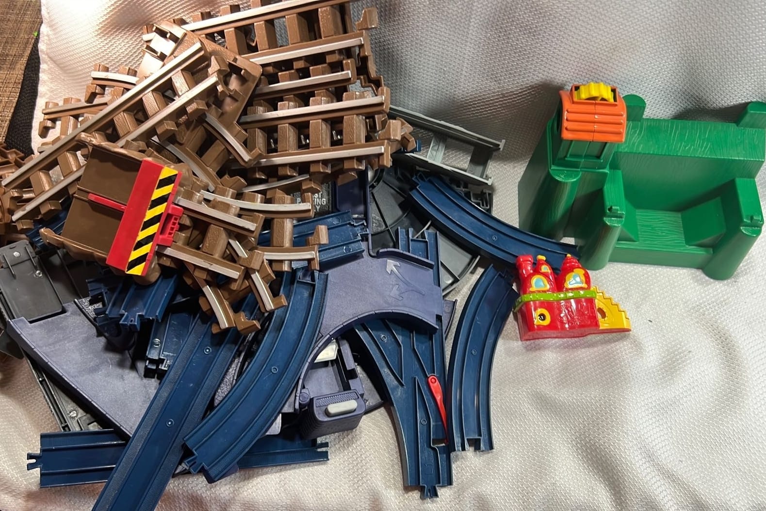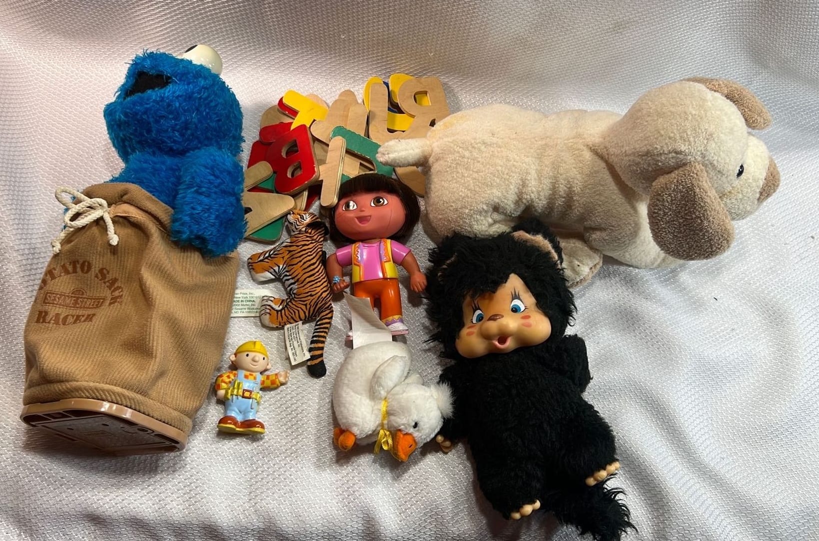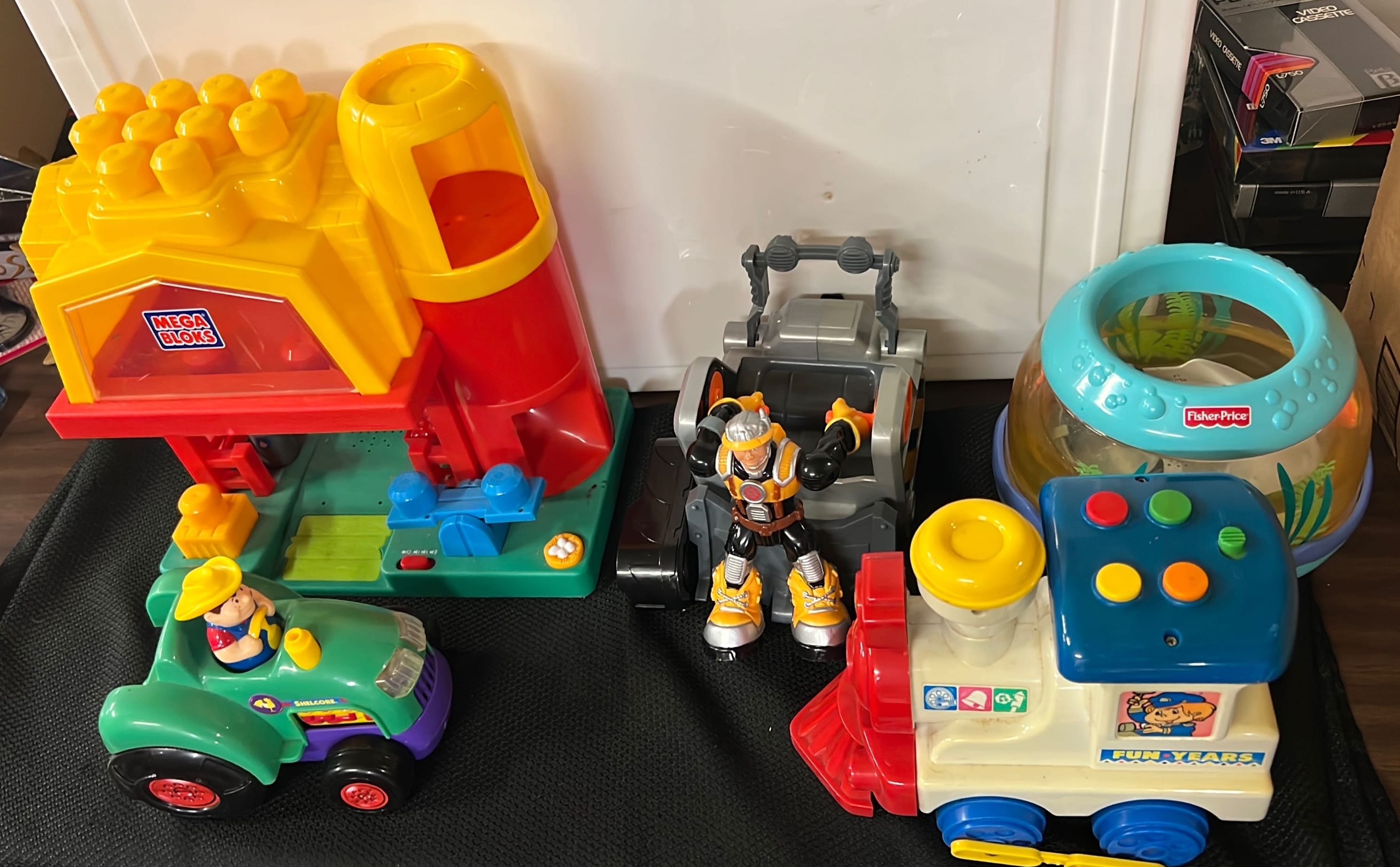 268a Toy assortment including: Mega Blocks, Fisher Price, Blue Box Train, Shelcore Truck, misc