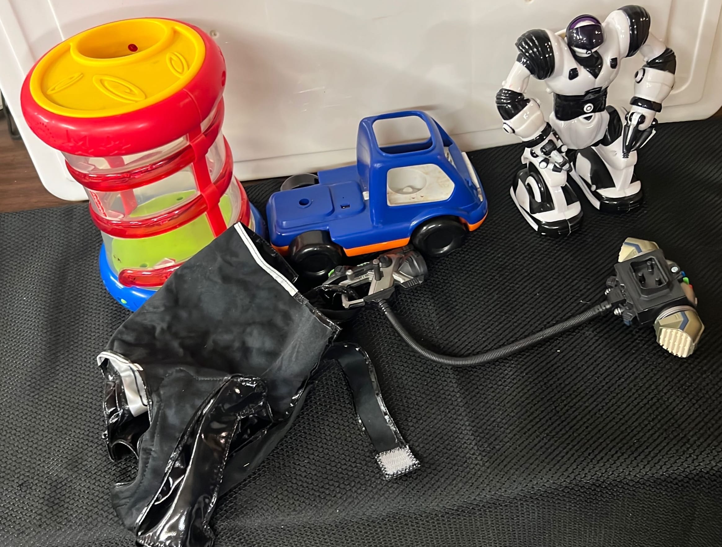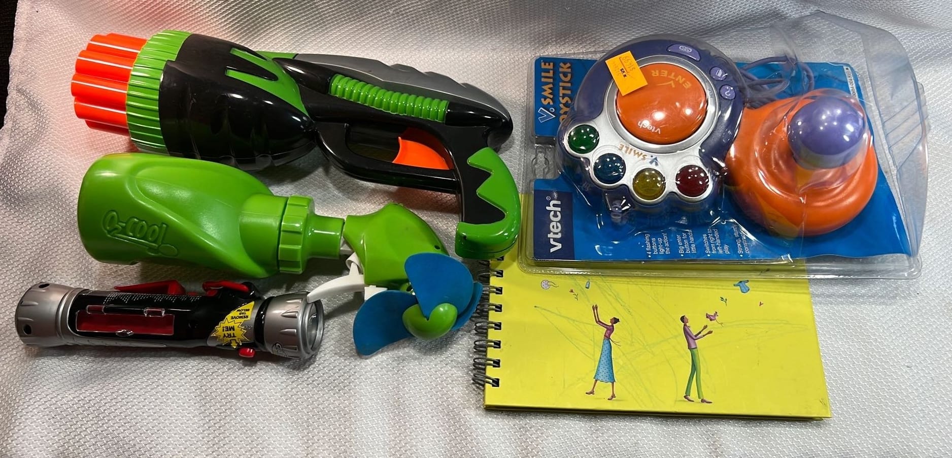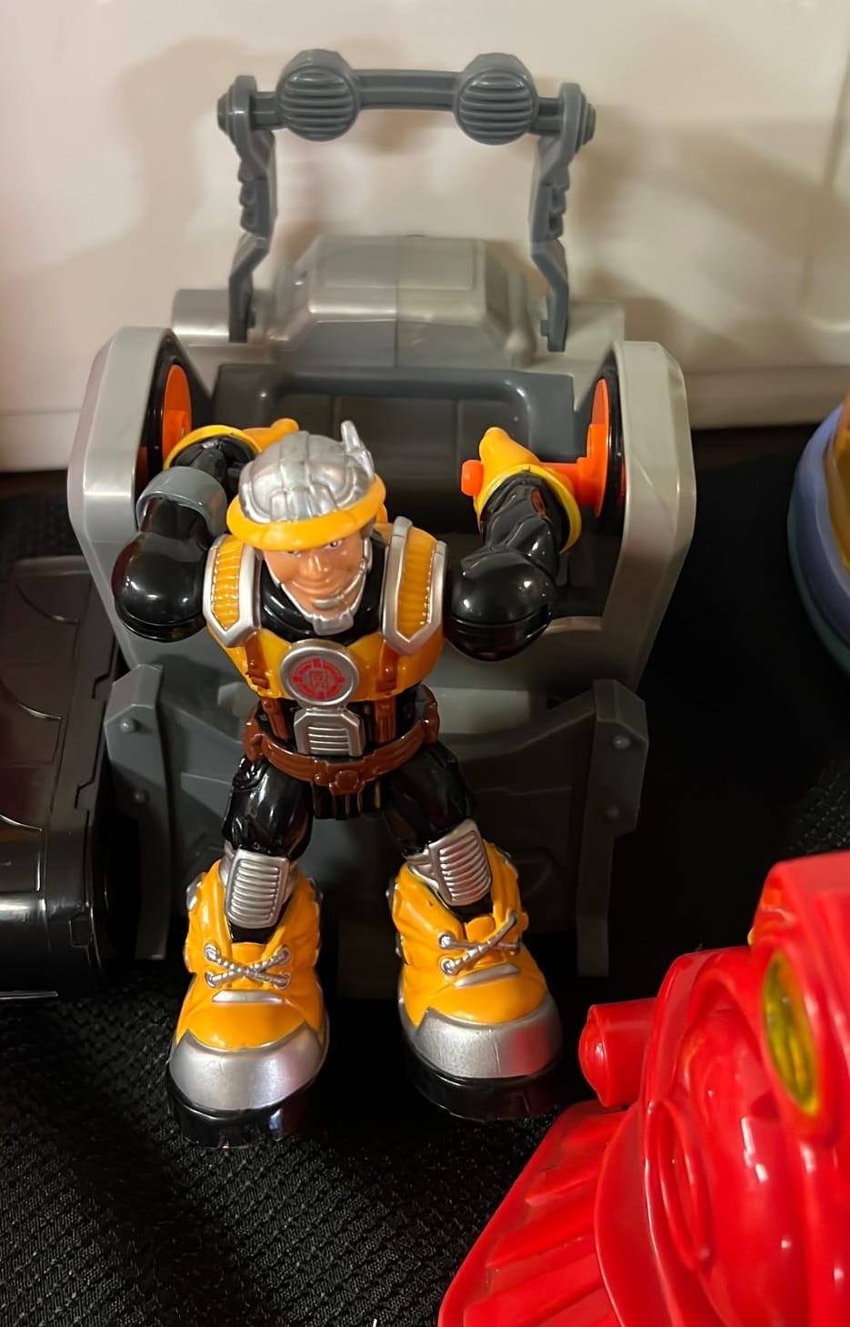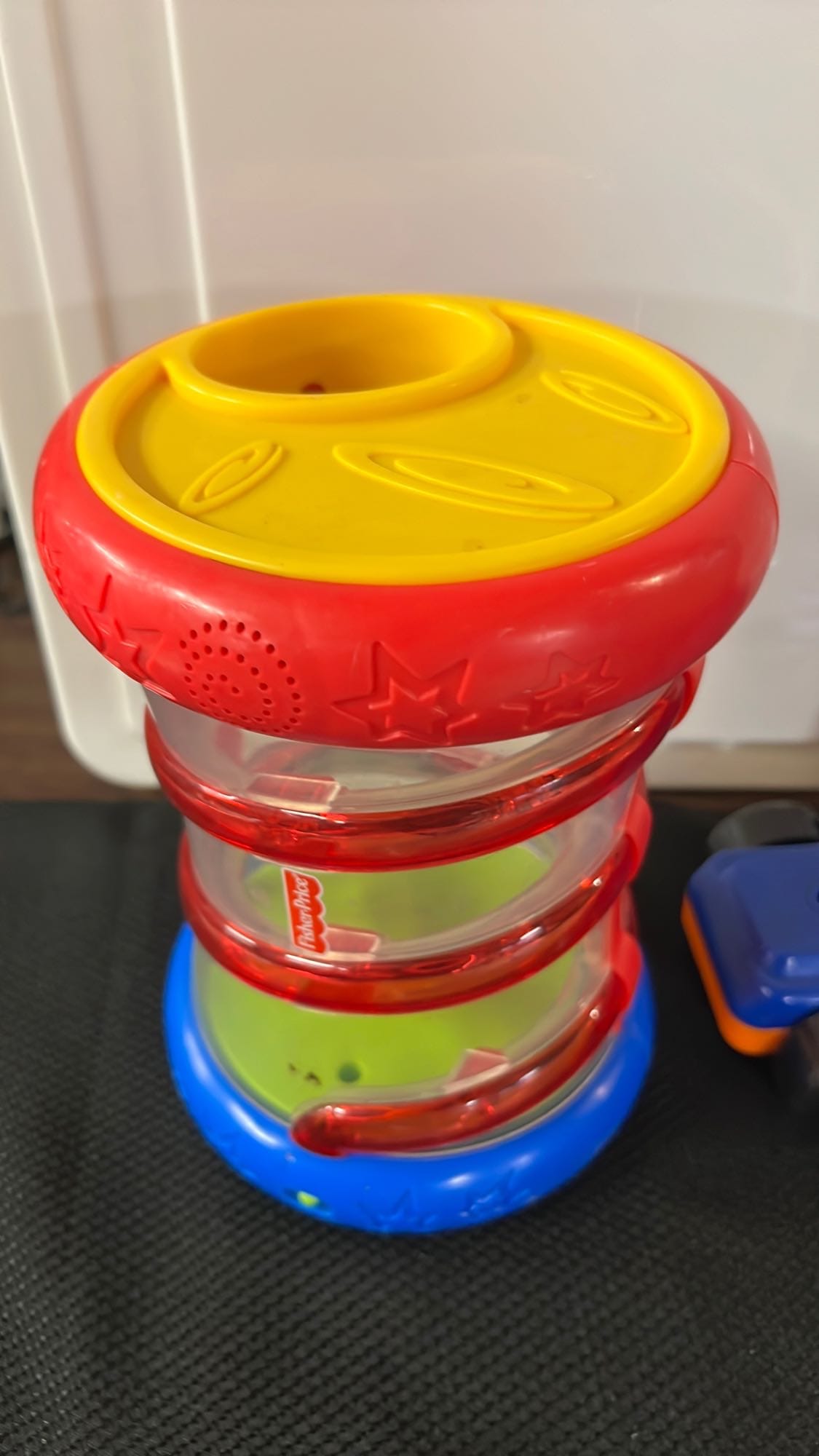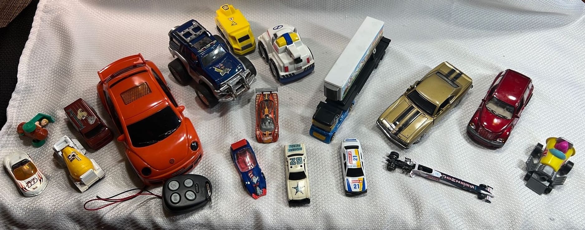 268a Toy assortment including: Mega Blocks, Fisher Price, Blue Box Train, Shelcore Truck, misc