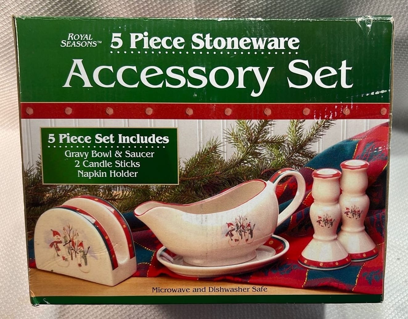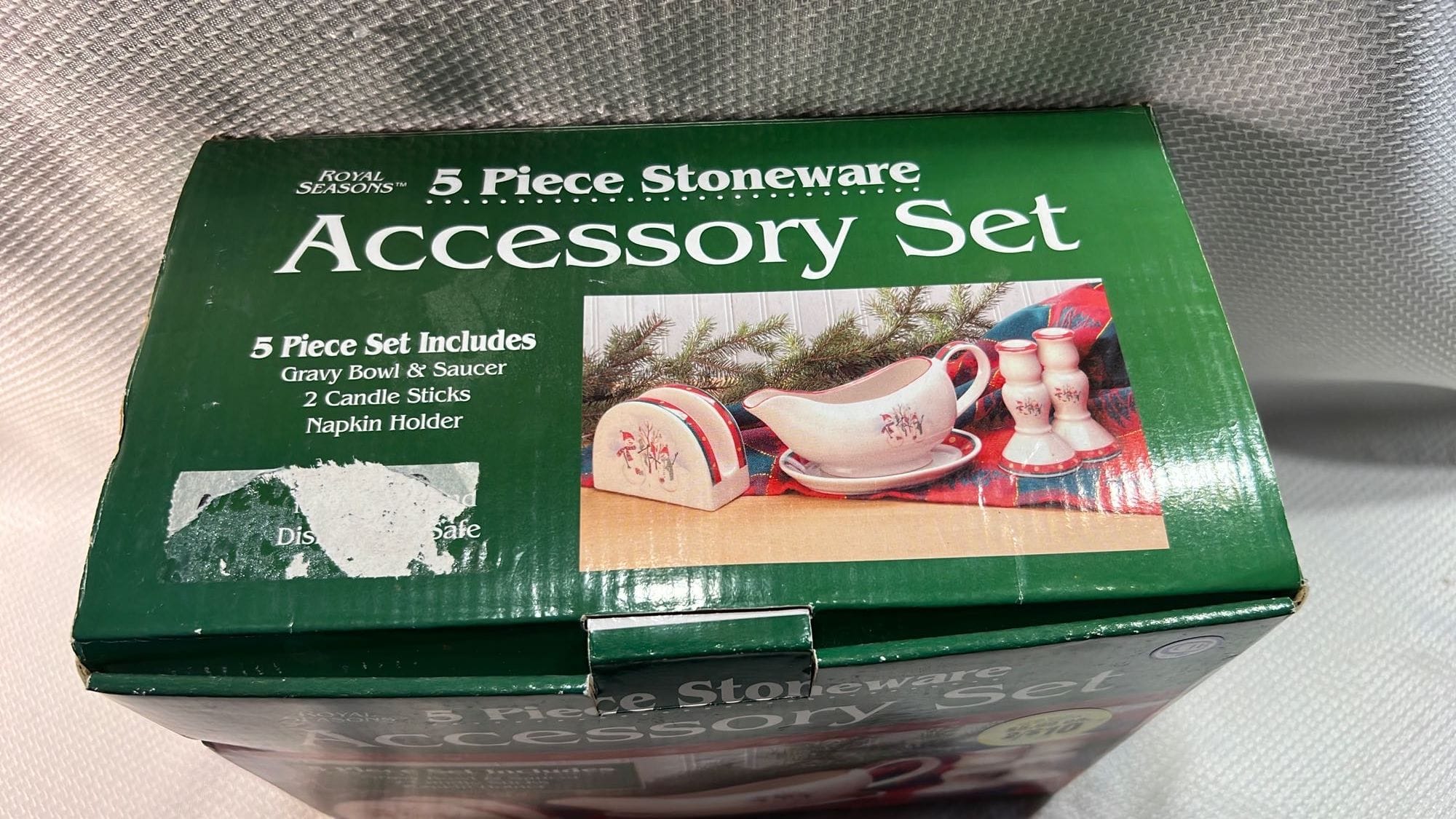 274 NIB Royal Seasons 5-piece Stoneware Accessory Set including: Gravy Bowl & Saucer, 2 Candle Sticks & Napkin Holder