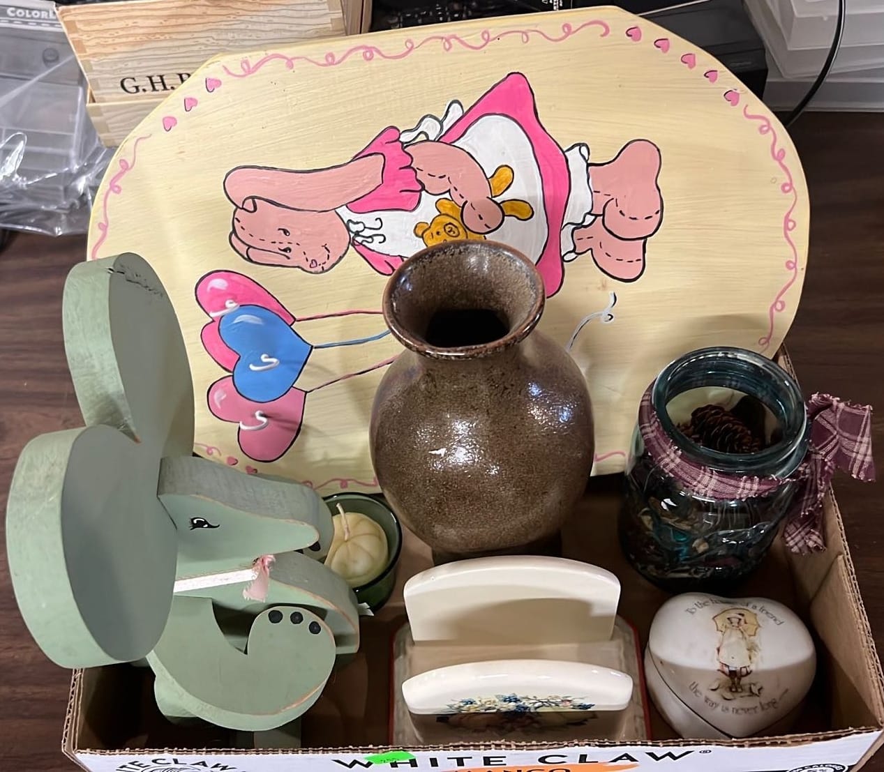 295 Holly Hobbie Jewelry Box, Vase, Blue Ball Jar, Ceramic Napkin Holder, Wooden Kangaroo, Decorative Wall Hanging