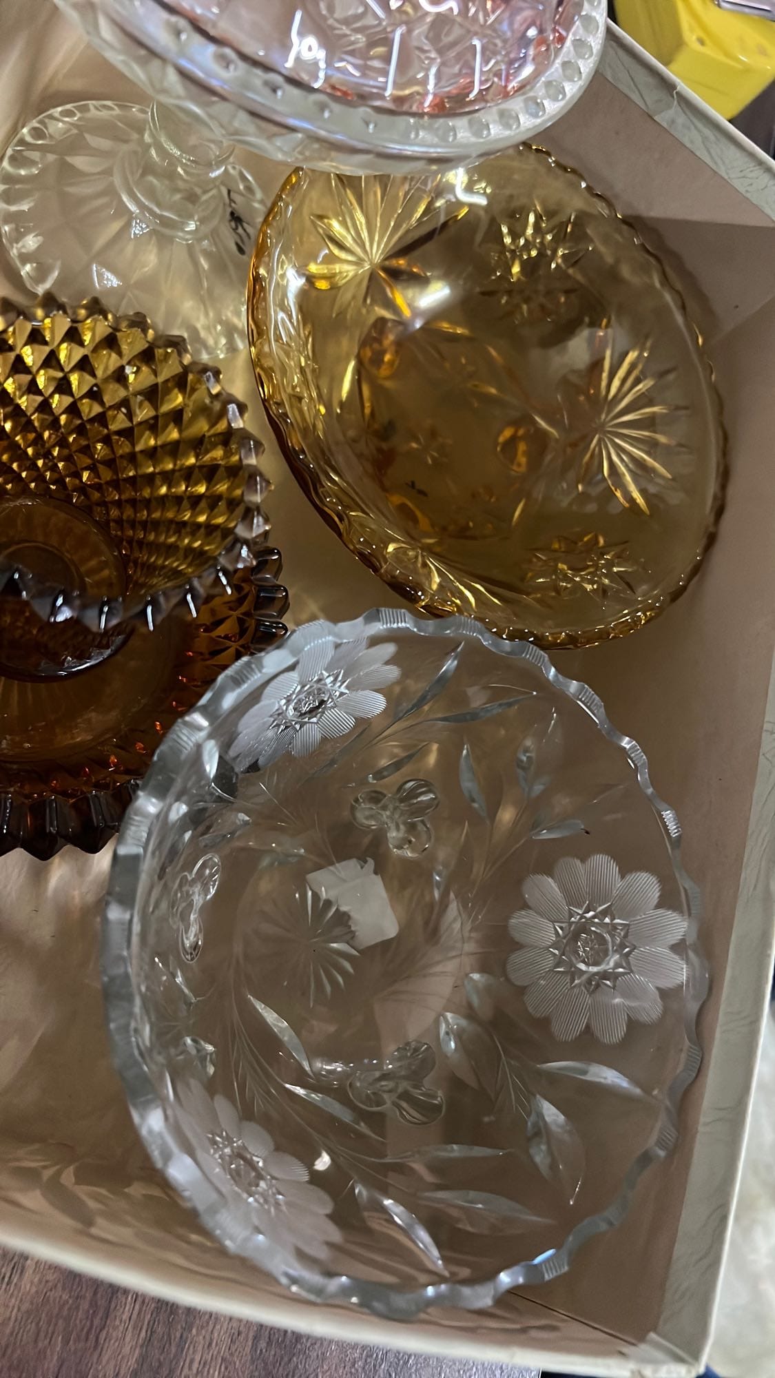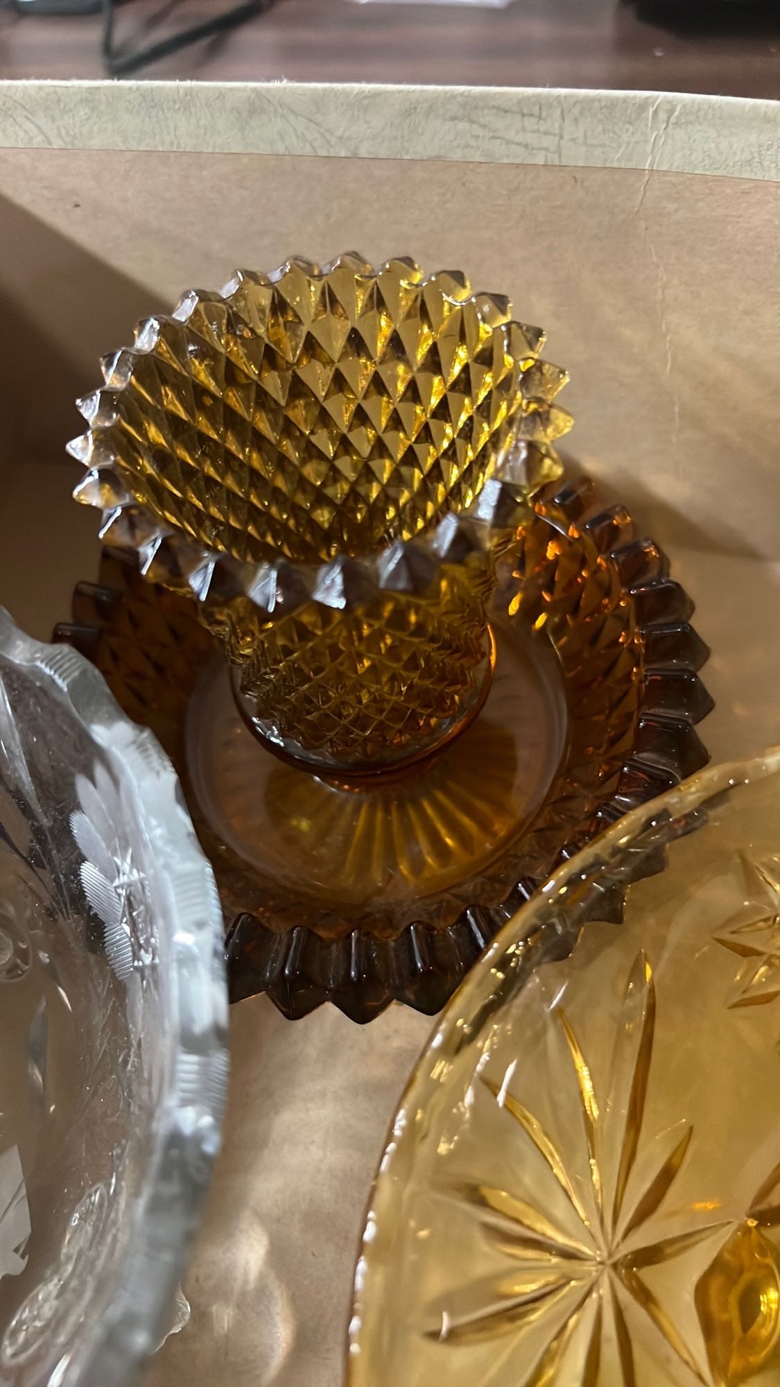 296 Amber Footed Pressed Glass Candy Dish, Pedastal Compote, Pink Depression Glass Lid, Vintage Cut Crystal Bowl with Etched Flowers
