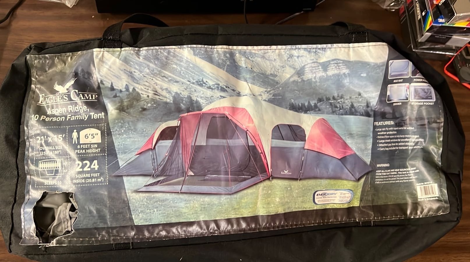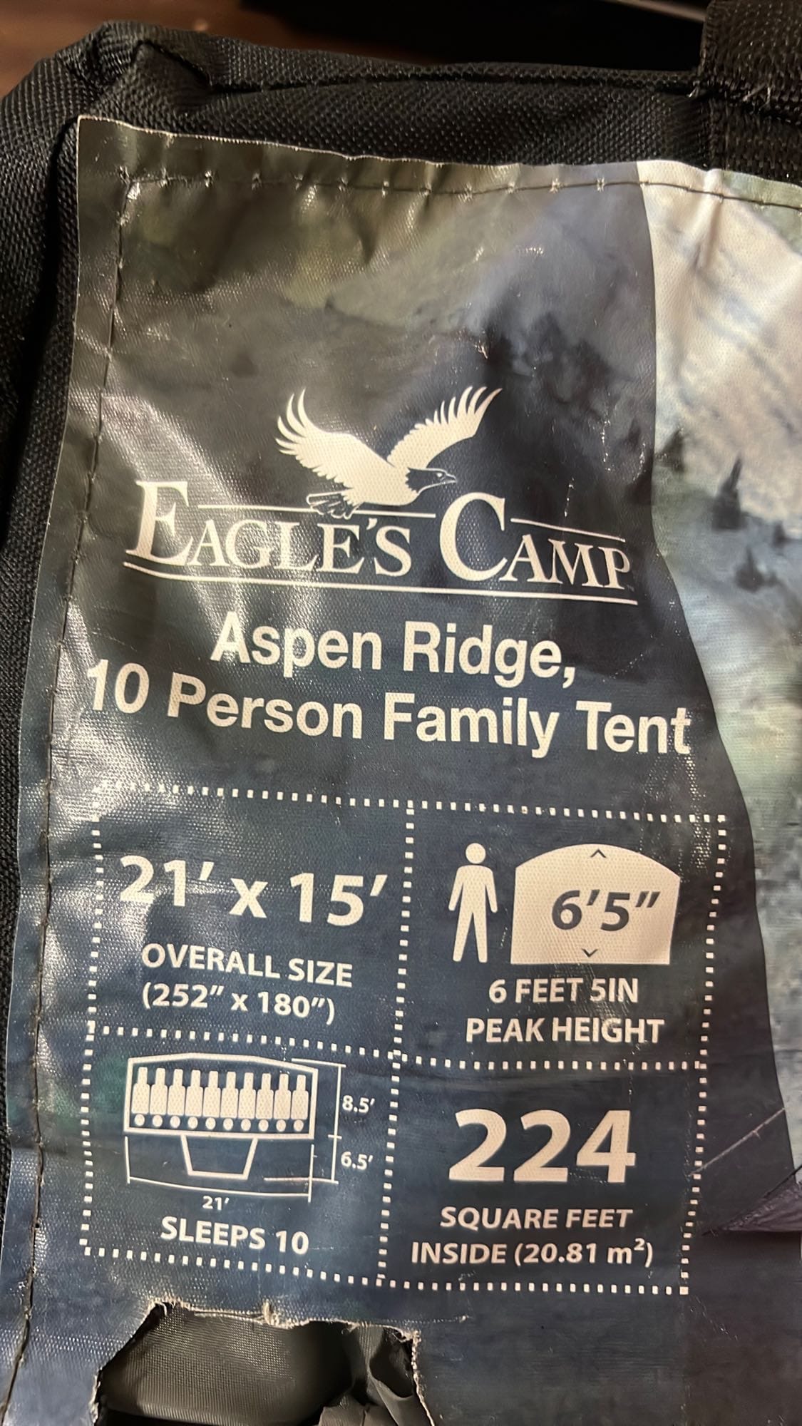 307 New In Package Eagles Camp Aspen Ridge 10 Person Family Tent 21’x15’, Retails for $140.00