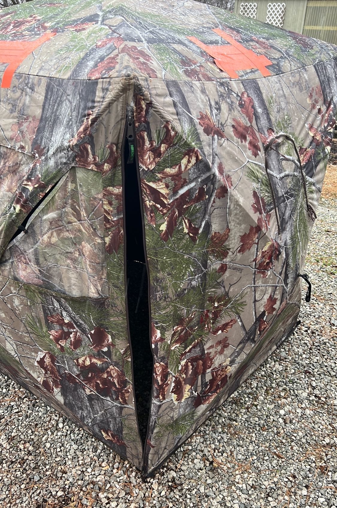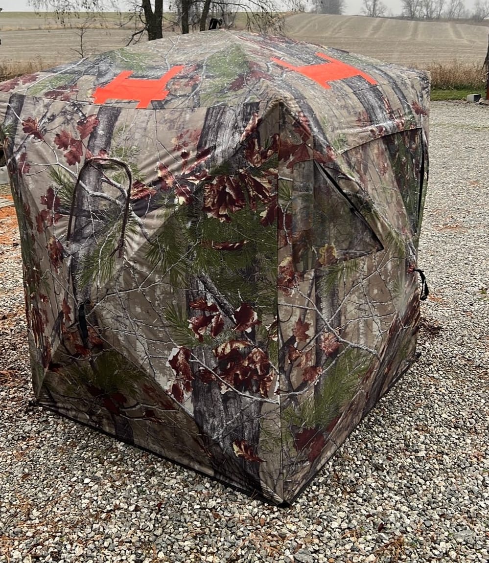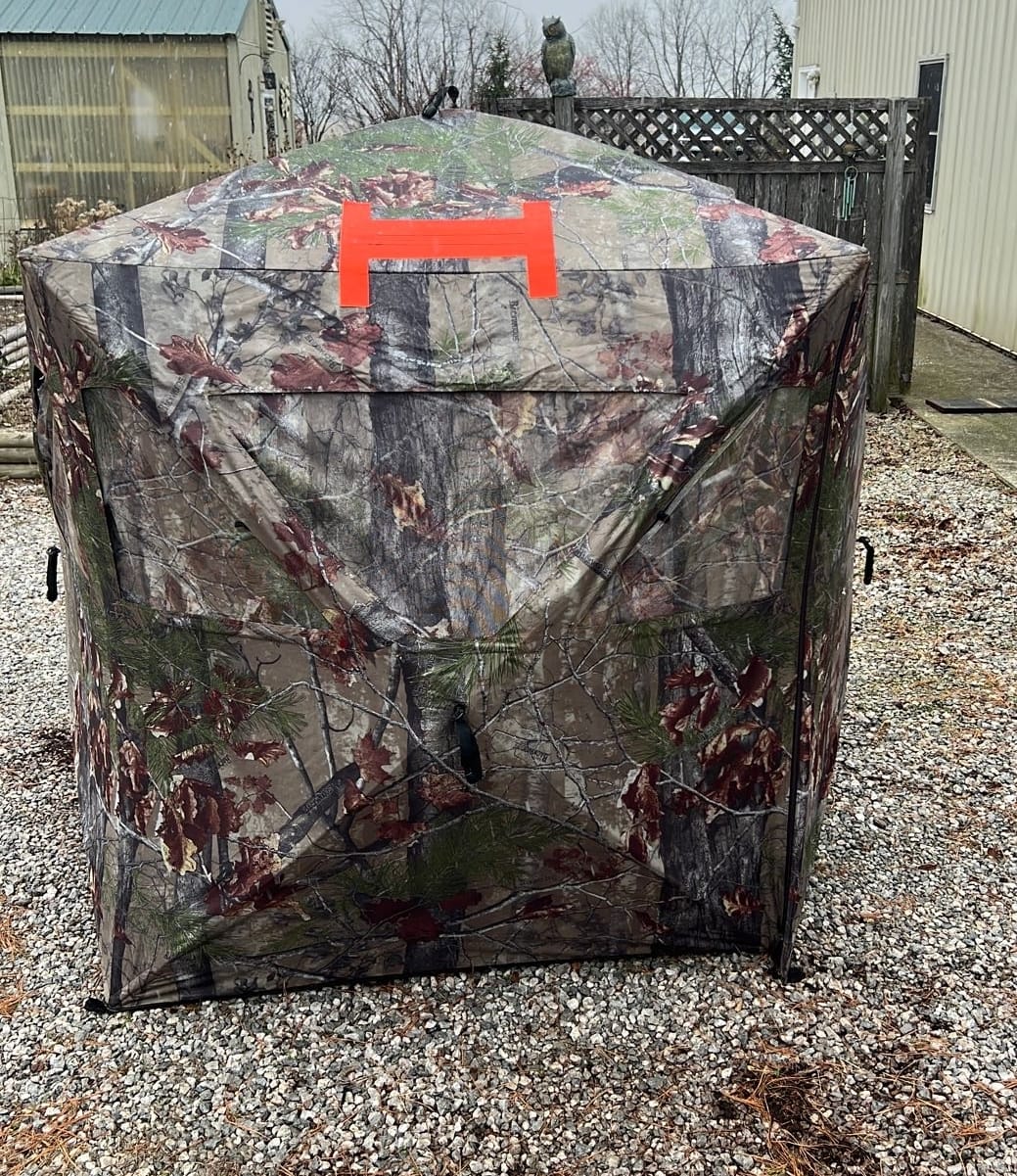 307a Camouflage Hunting Blind 5’x5’x67” tall (orange tape is for safety)