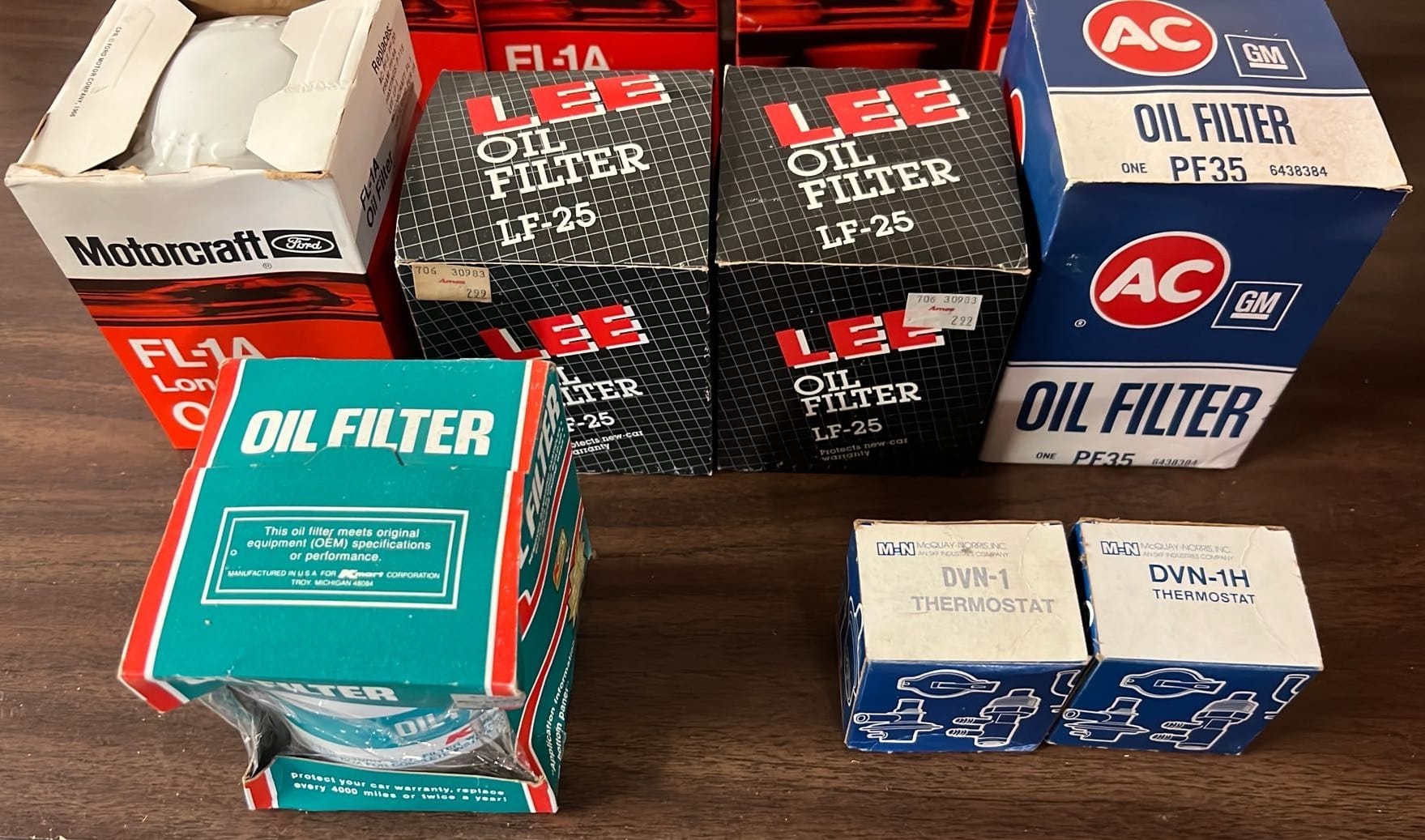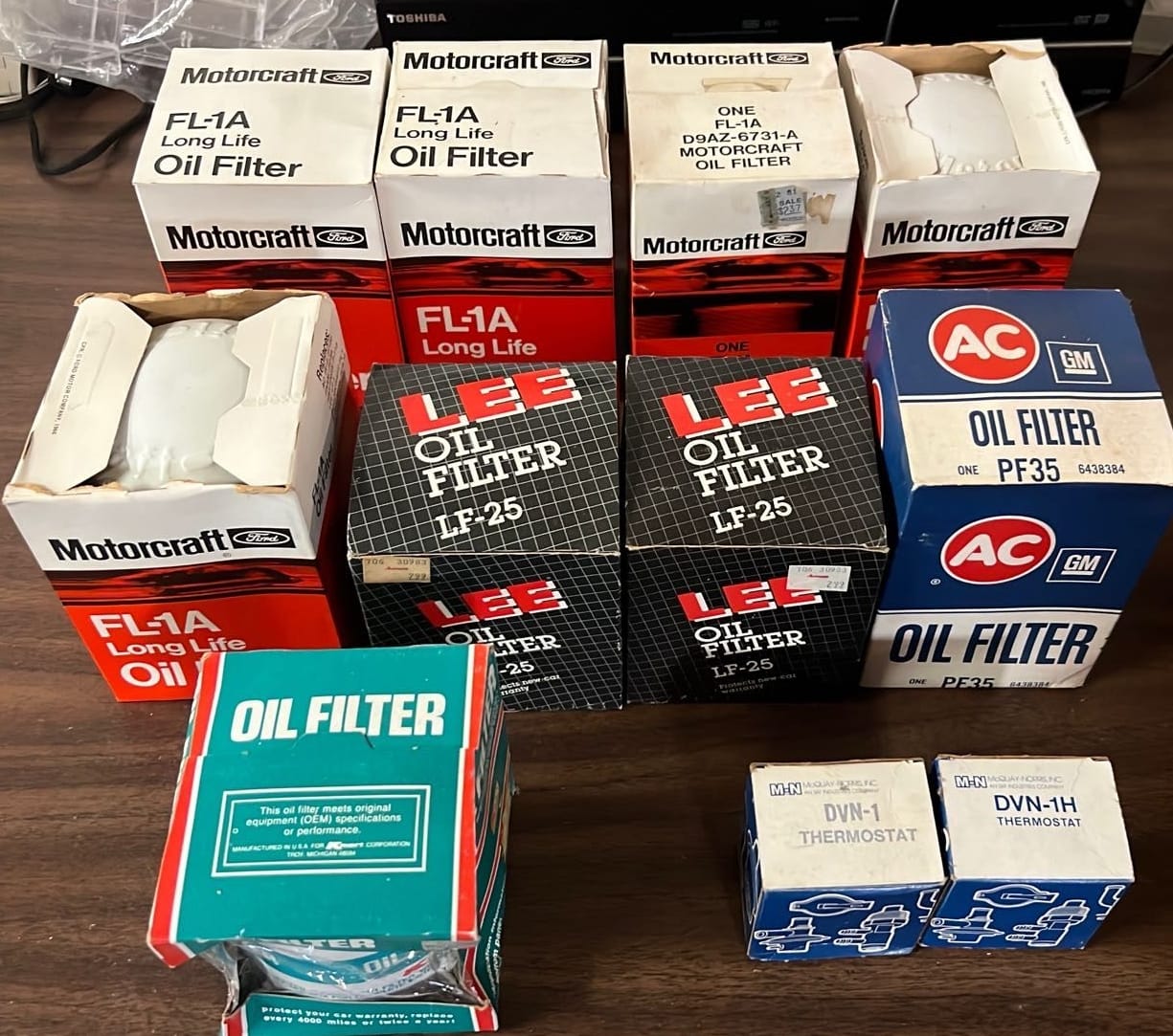 309 NIB (2) Lee LF-25 Oil Filters, (5) Motorcraft FL-1A Oil Filters, AC PF35 Oil Filter, KMART Oil Filter, (2) DVN -1H Thermostats