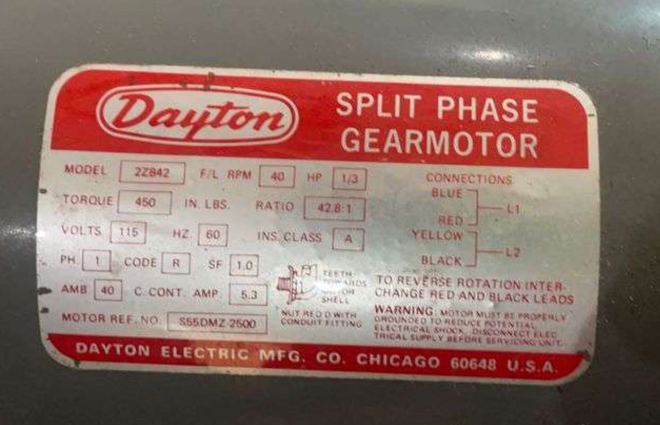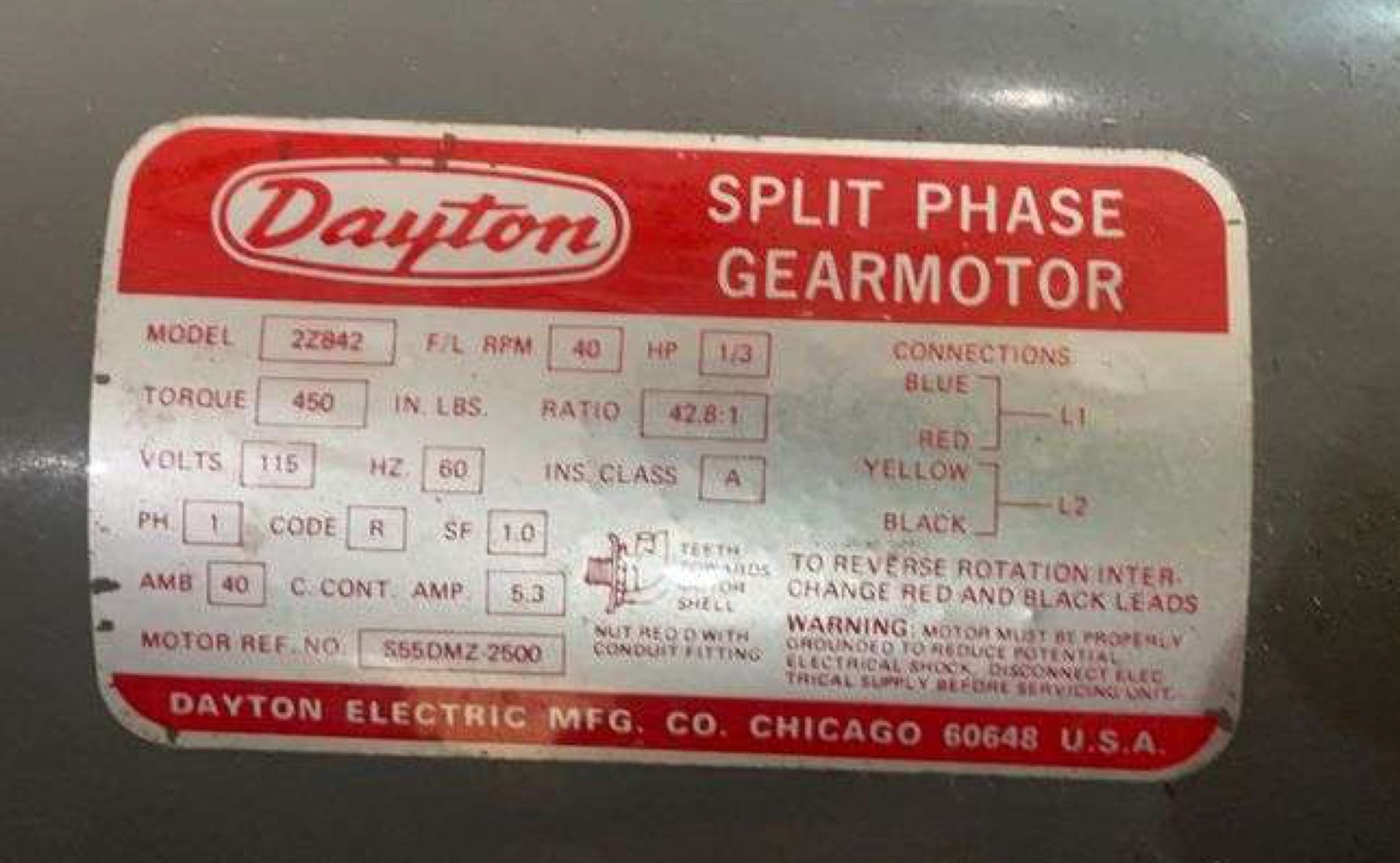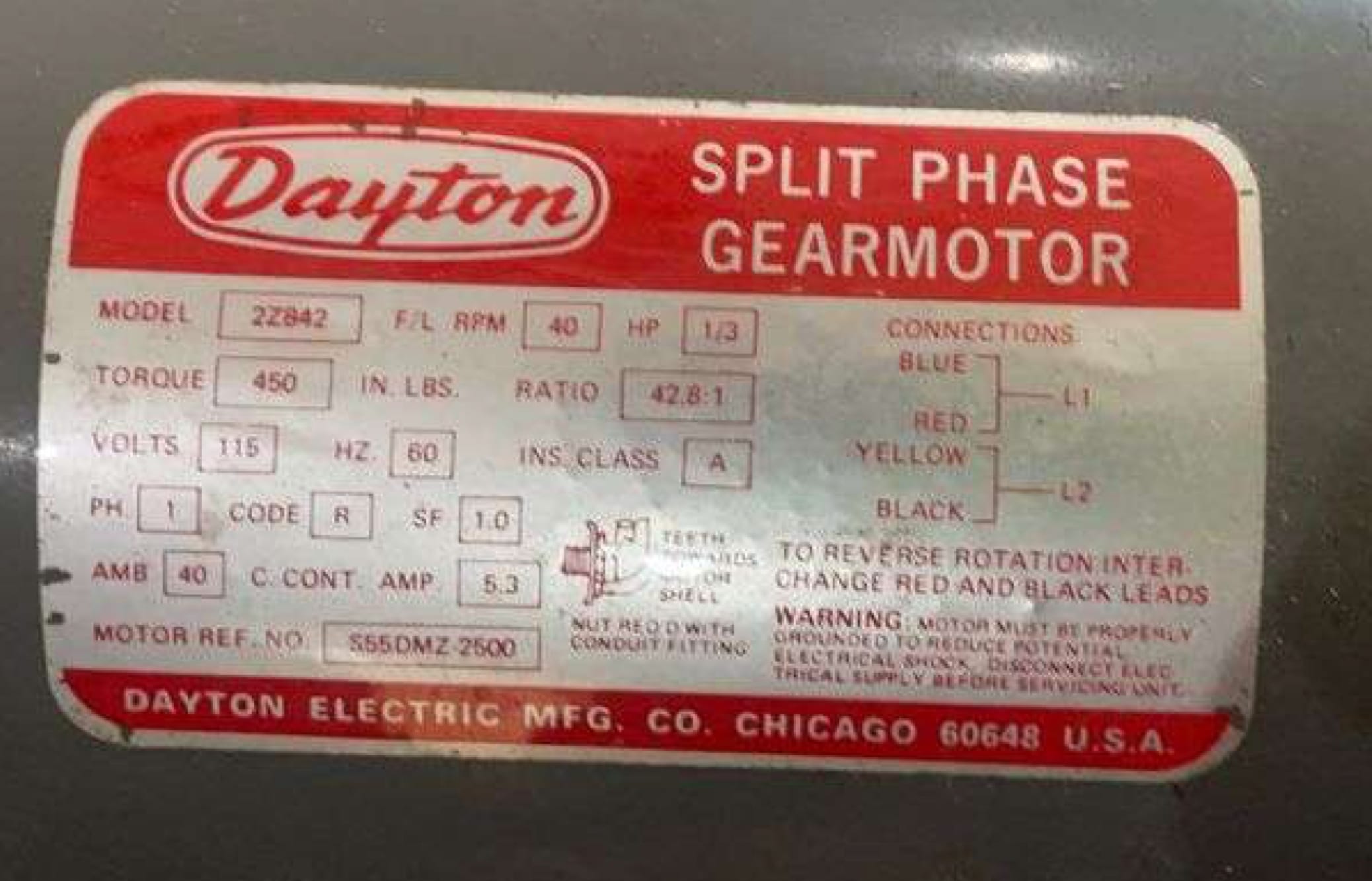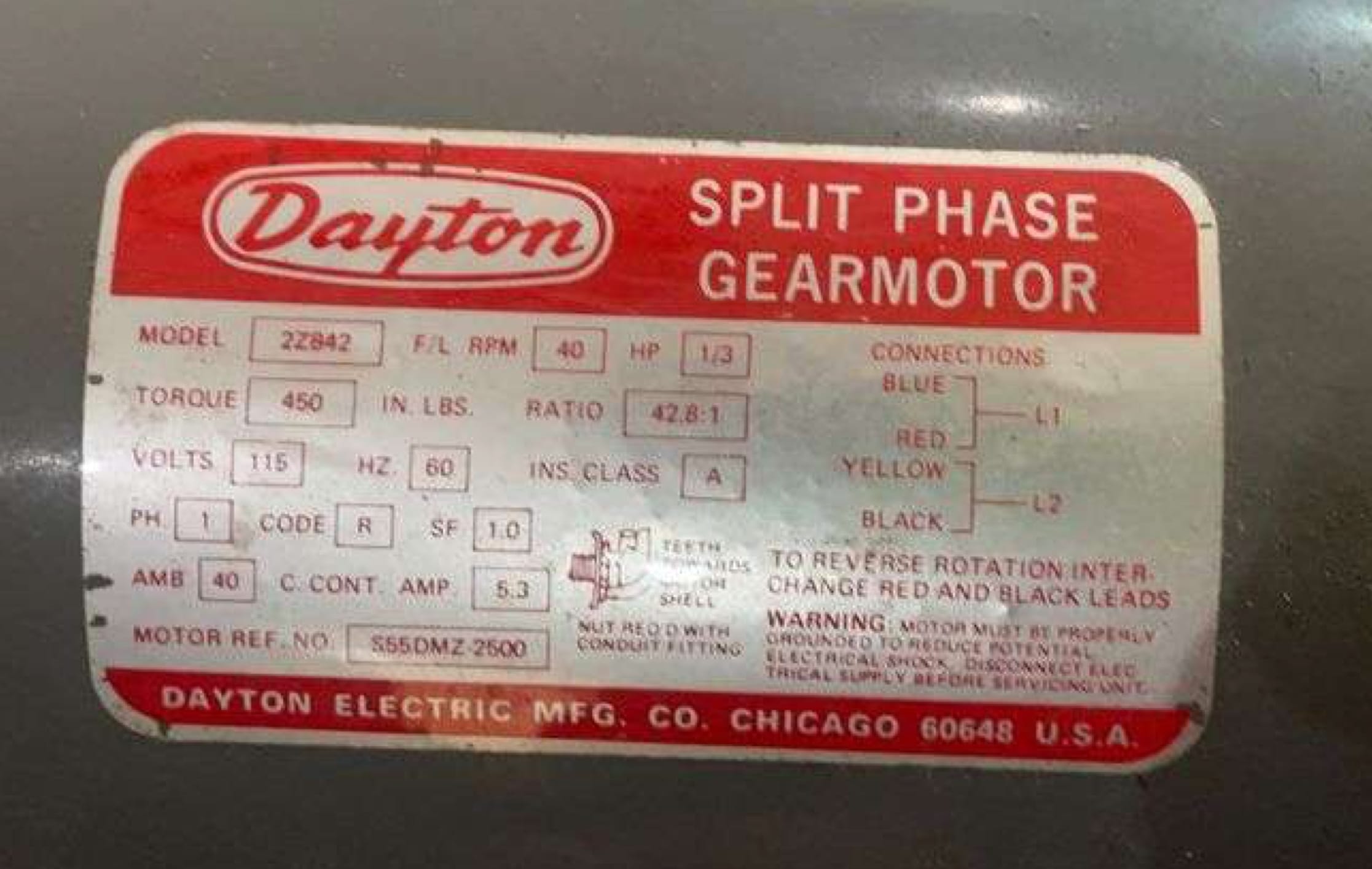310 New/Old Stock: Dayton split phase gear motor Model 2Z842, 115v AC, 1/3 HP, 40 RPM, 40 amps, and 450 I -lb. Torque Retails at Graingers for $921.00.