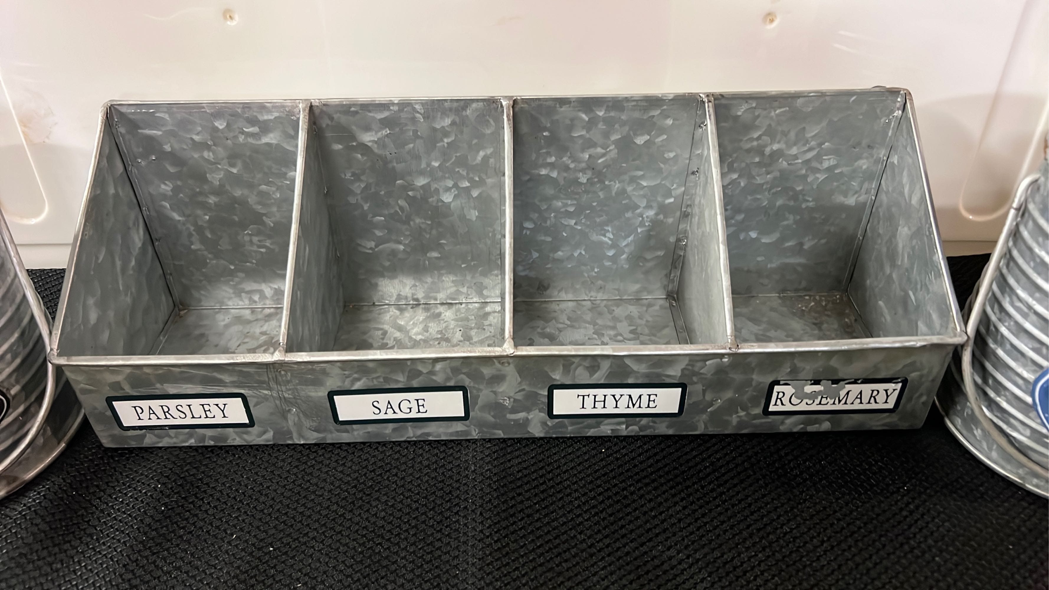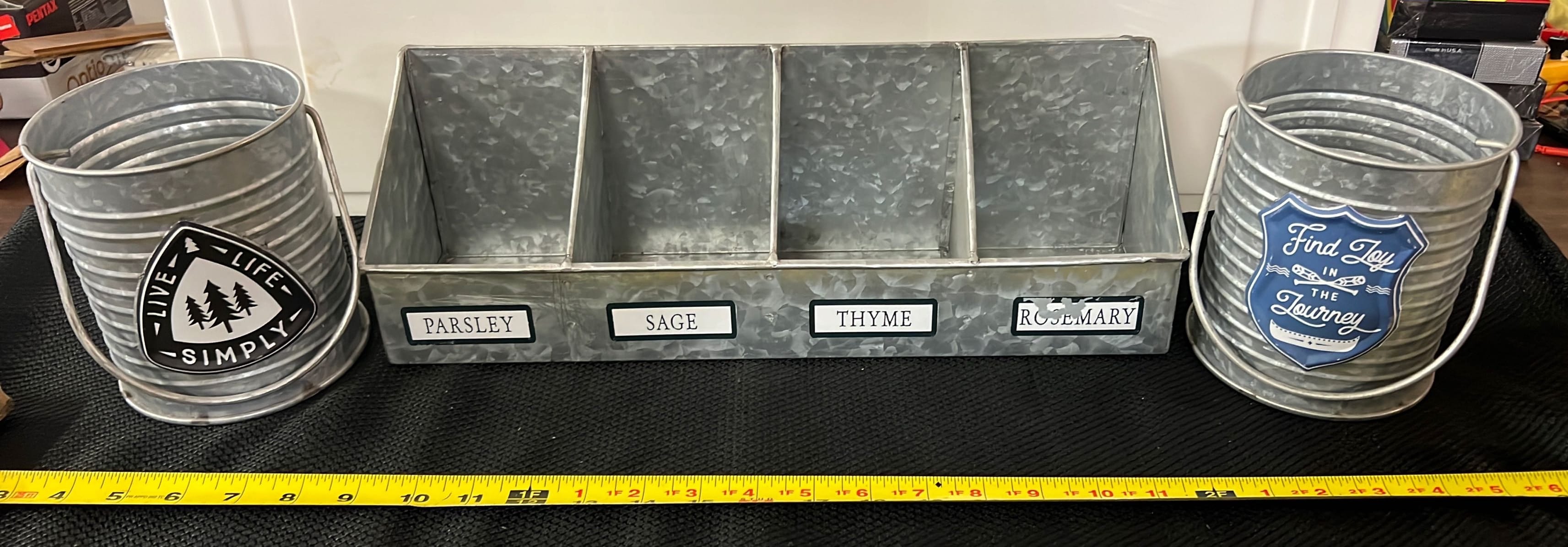 332 Galvanized Spice Rack 16”x5”x4.5” & (2) Galvanized Buckets