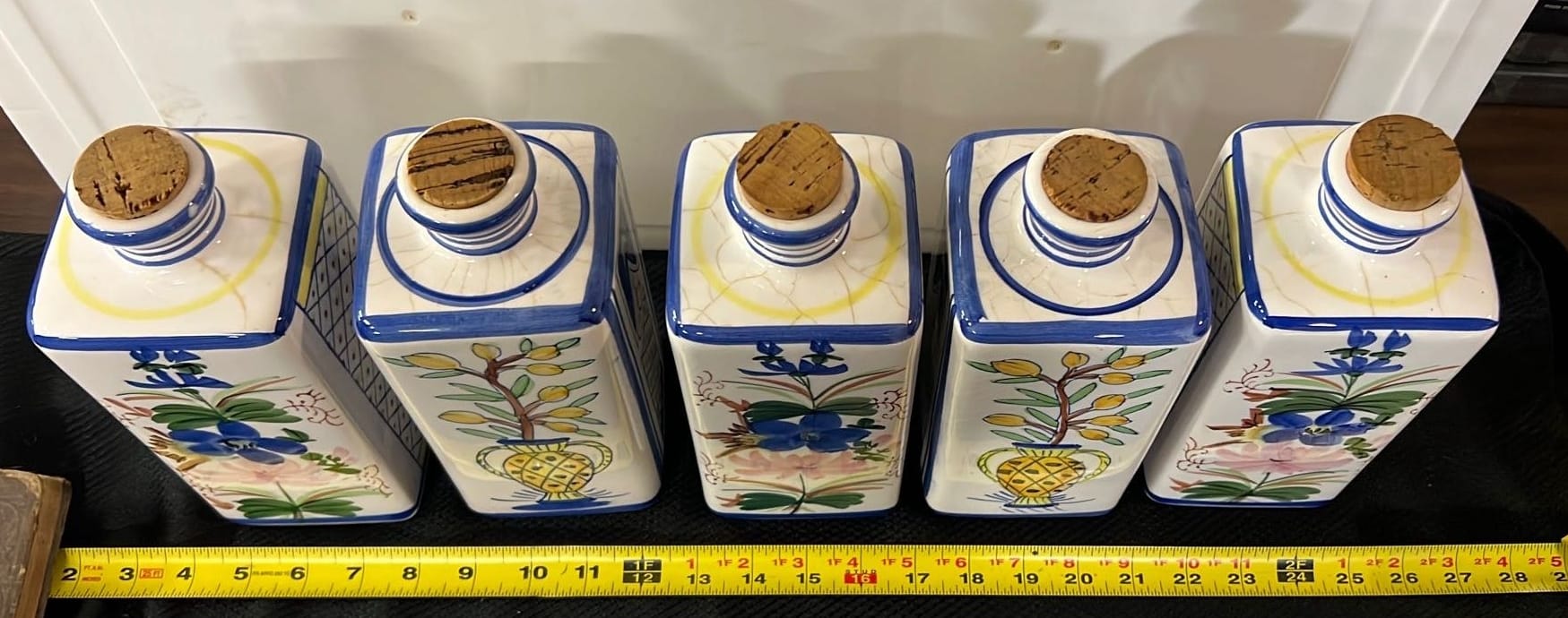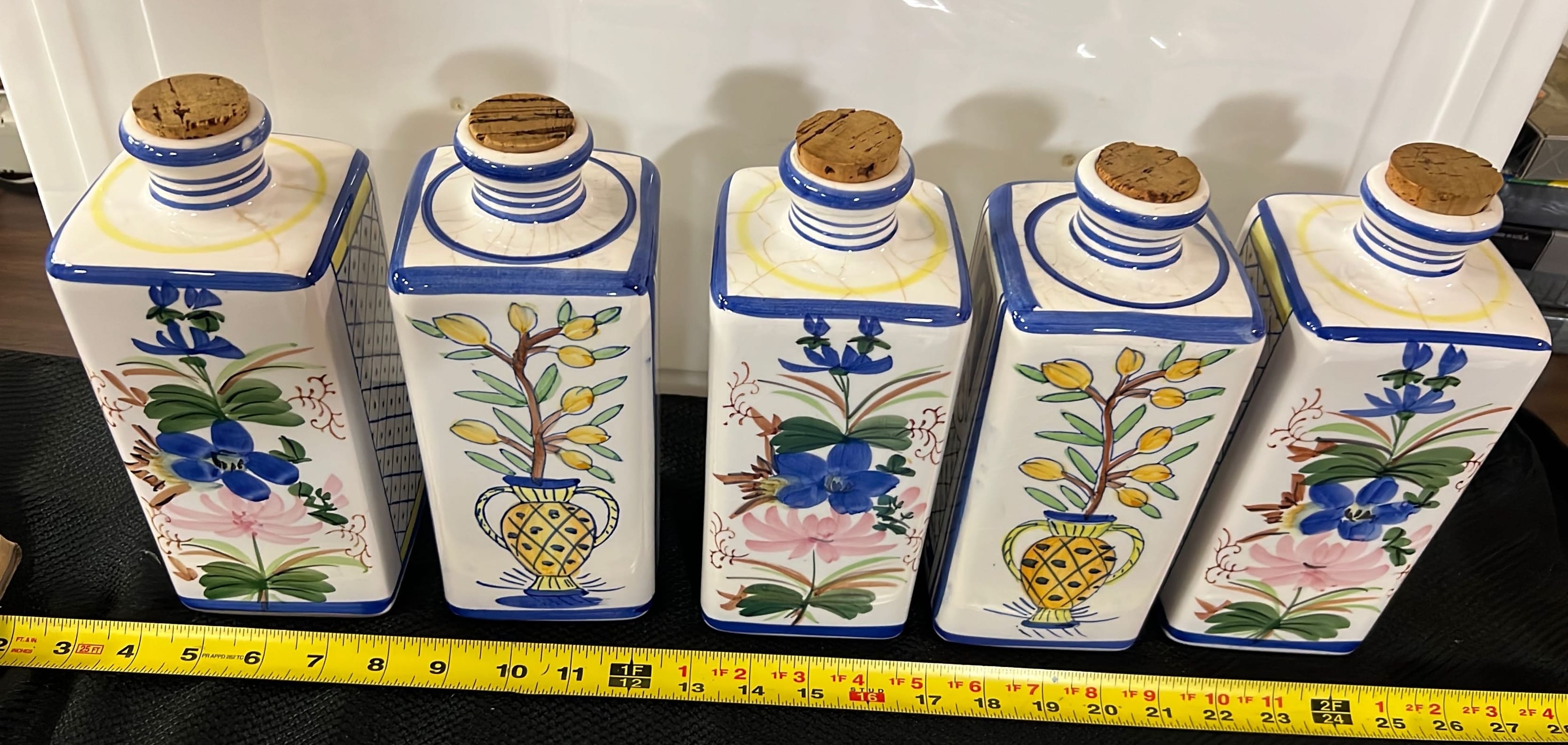 333 (5) Decorative Ceramic Hand Painted Bottles with Corks 9” tall