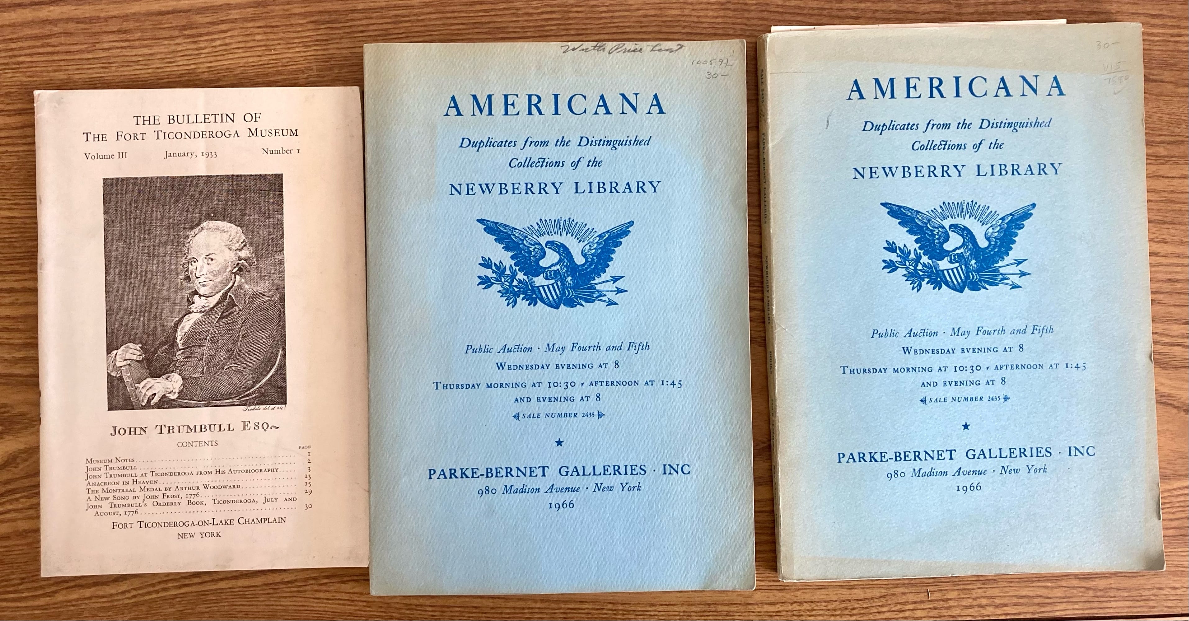 81 3 Paperback Books-The Bulletin of The Fort Ticonderoga Museum, Americana Duplicates from the Distinguished Collection of the Newberry Library, Public Auction May Fouth and Fifth 1966