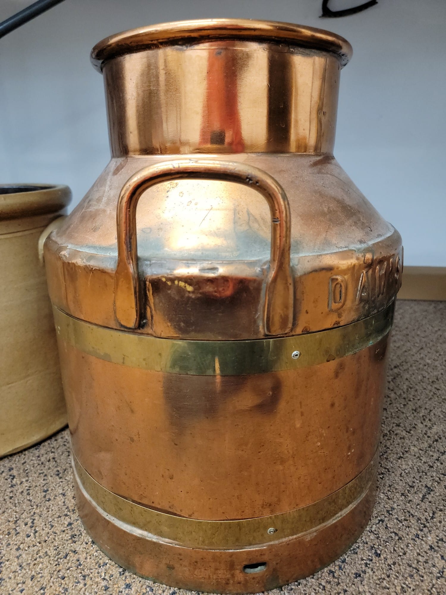 645 Daw's Creameries Totnes Copper Churn with handles, 17"H x 13.5" D
