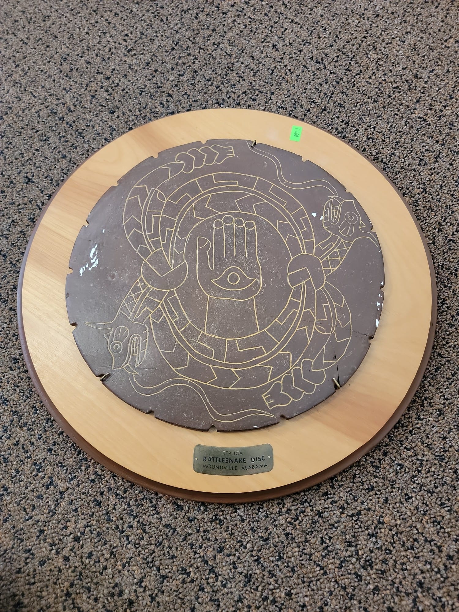 803 Replica Rattlesnake Disc Moundville, Alabama, 12" disc, cracked, 17" wooden mount with letter from University of Alabama