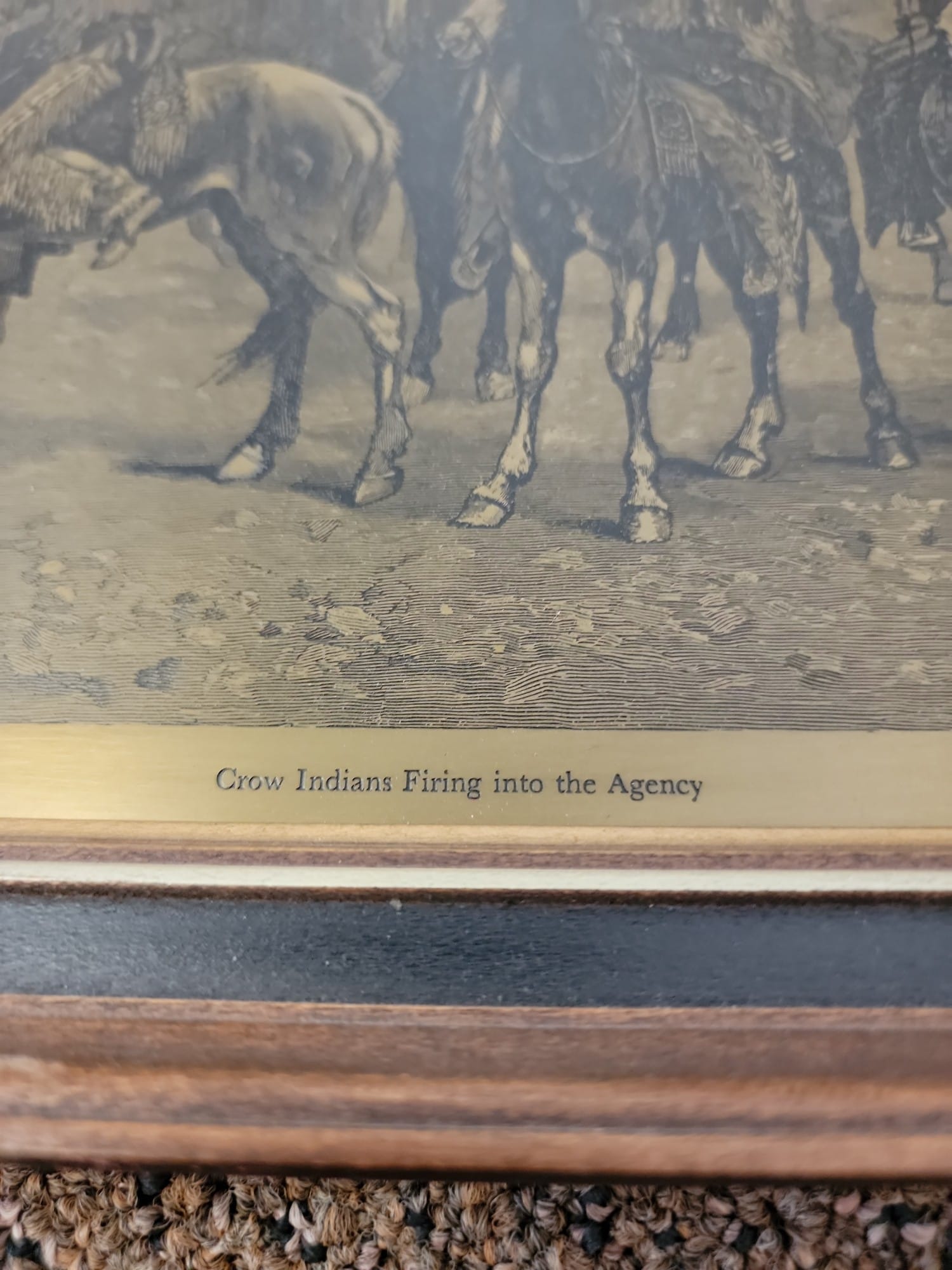 806 Framed Ropkey Engraving "Crow Indians Firing into the Agency" by Remington 9" x 11" engraving in 14" x 10.5" frame