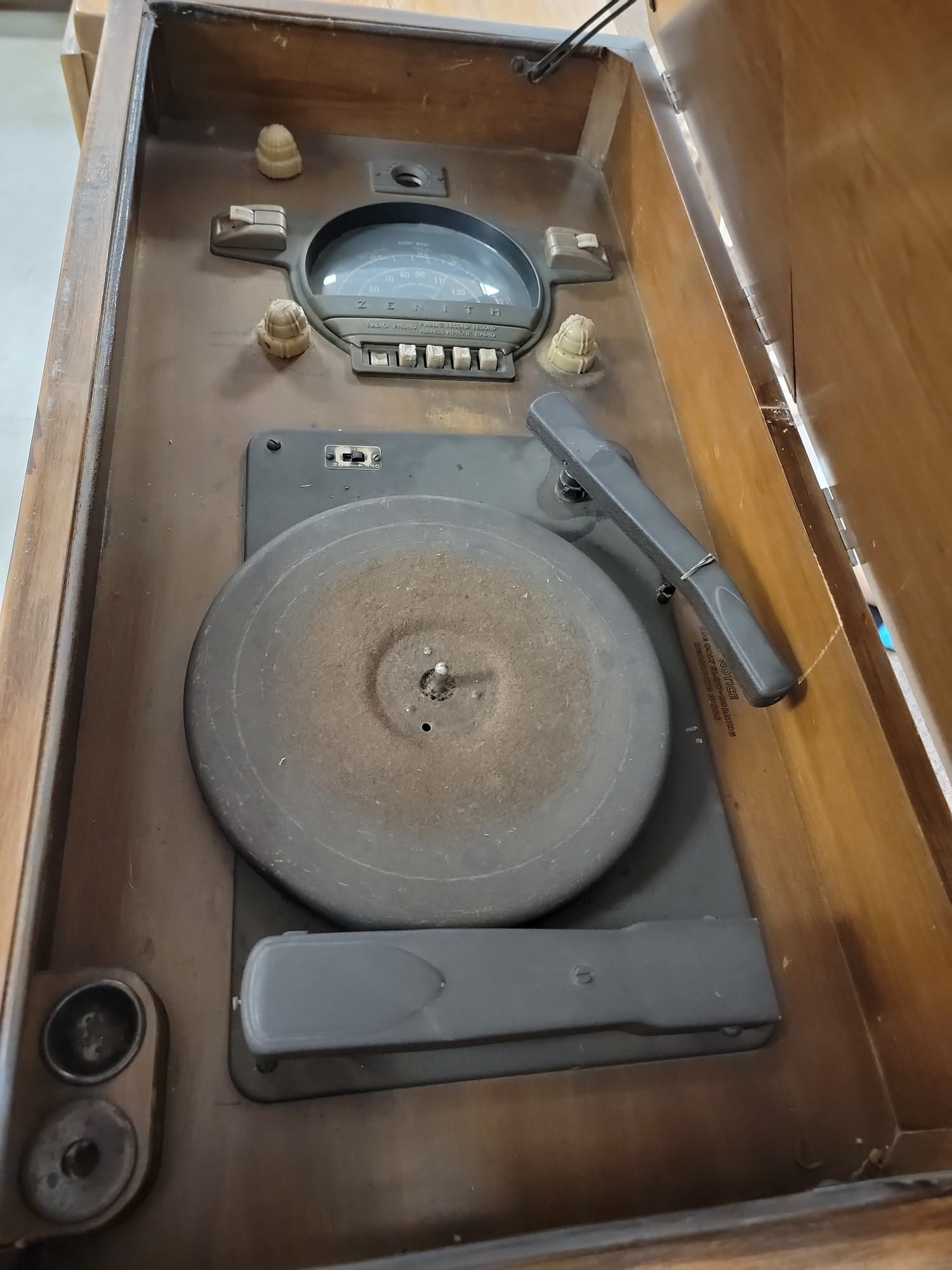 902 Vintage Record Player Radio Cabinet- some scratches and frayed material 32.5"W x 32.75"H x 16.25"D