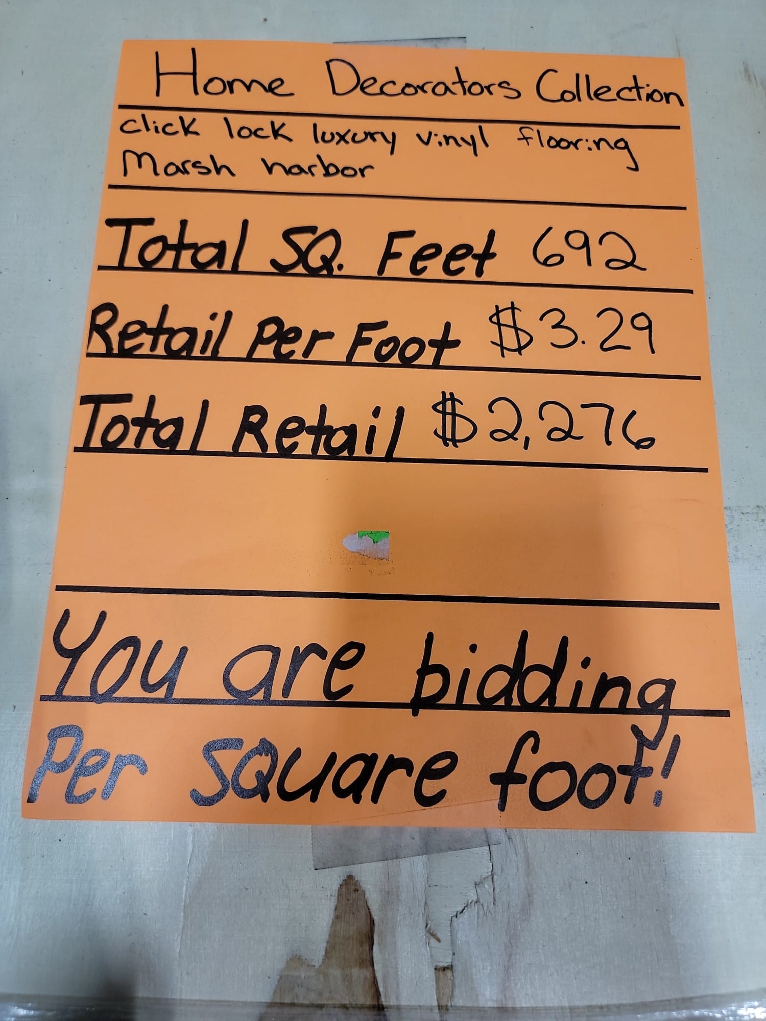 6 "692 sq.ft. Home Decorators Collection Marsh Harbor 7.1 in. W x 47.6 in. L Luxury Vinyl Plank Flooring (23.44 sq. ft.), 28 cases, you are bidding per sq.ft."