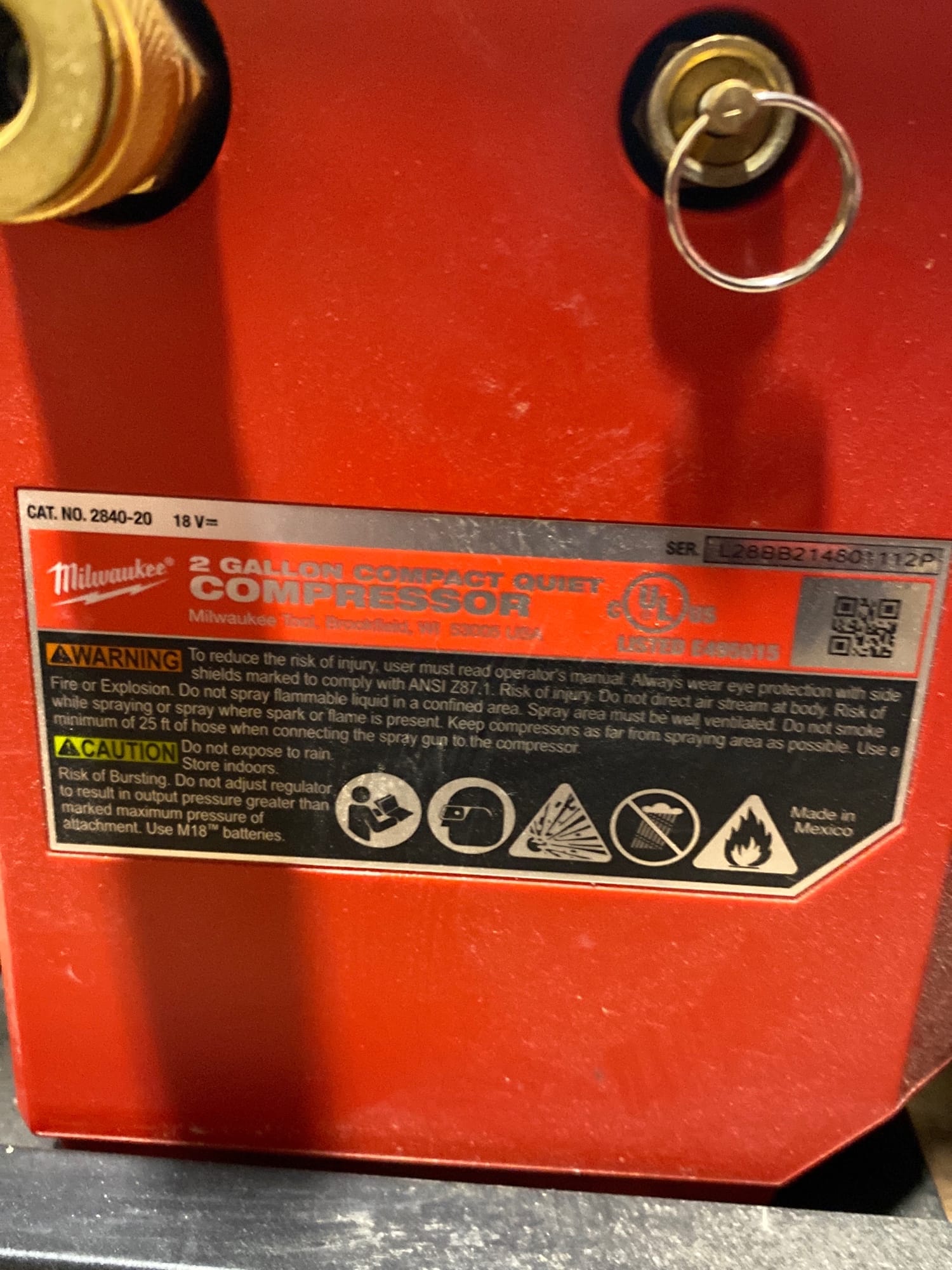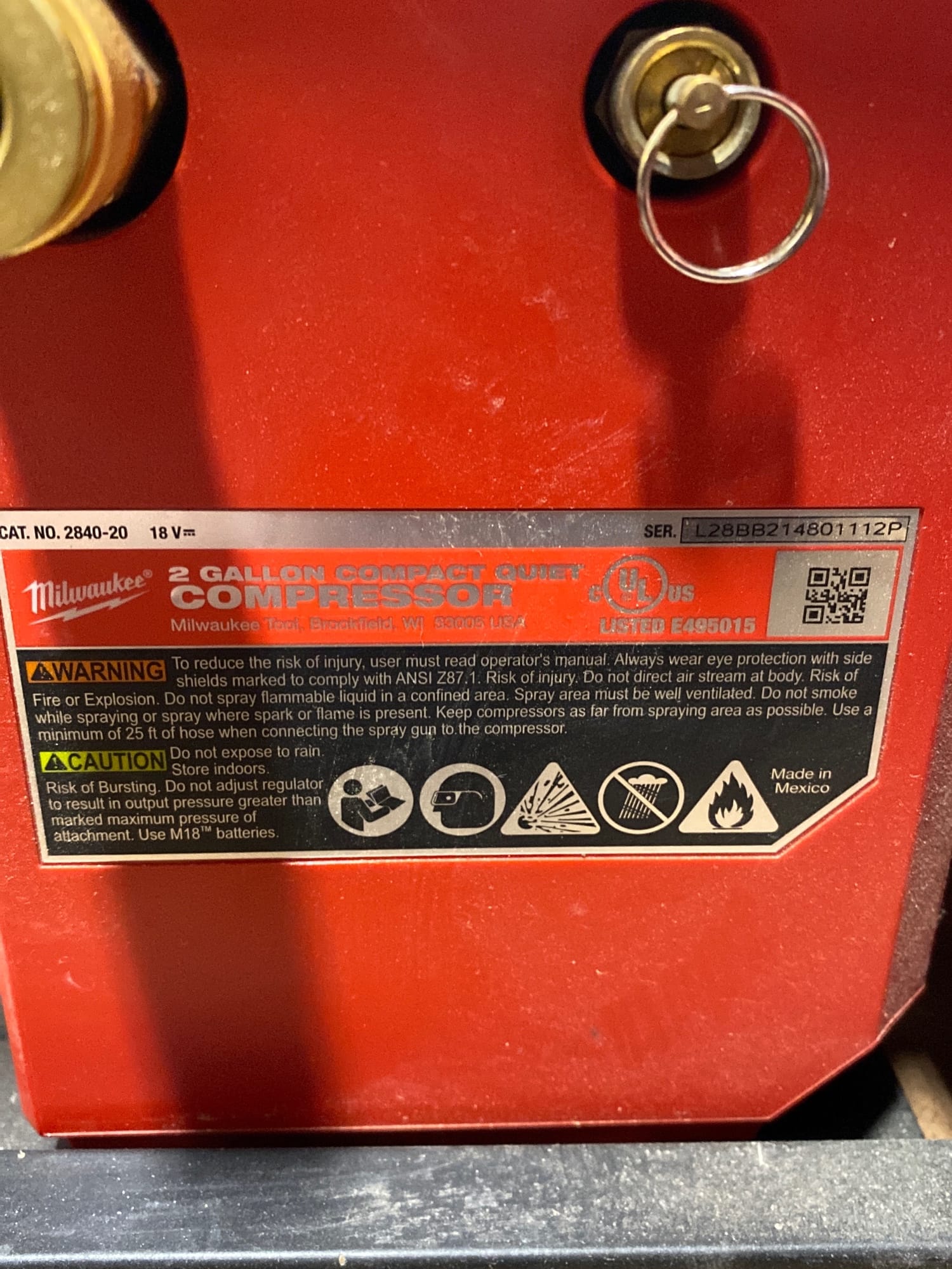 148 Milwaukee M18 Model:2840-20 2gal Compact Quiet Compressor, Tool Only
