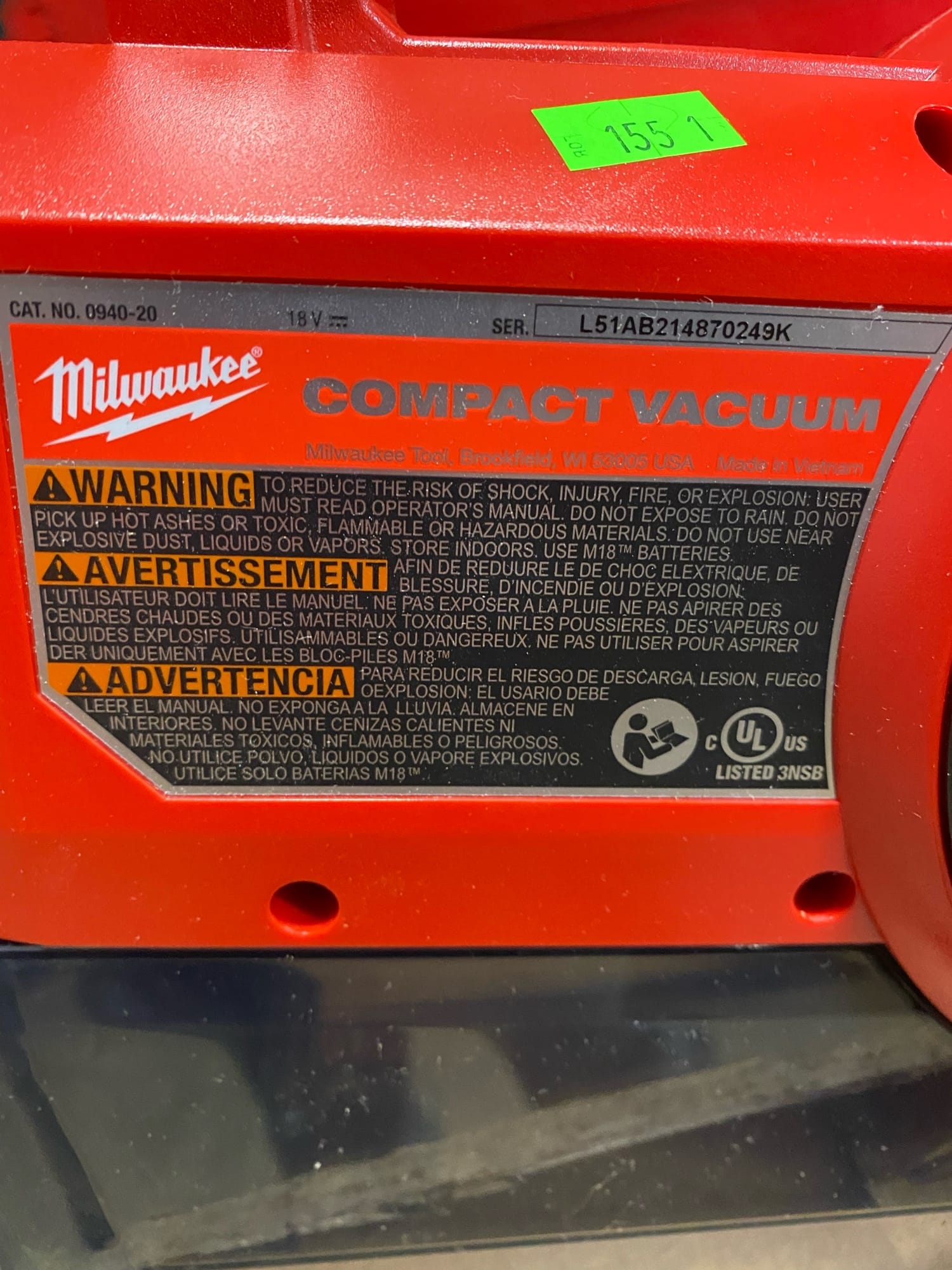 155 Milwaukee M18 Model:0940-20 Compact Vacuum, Tool Only