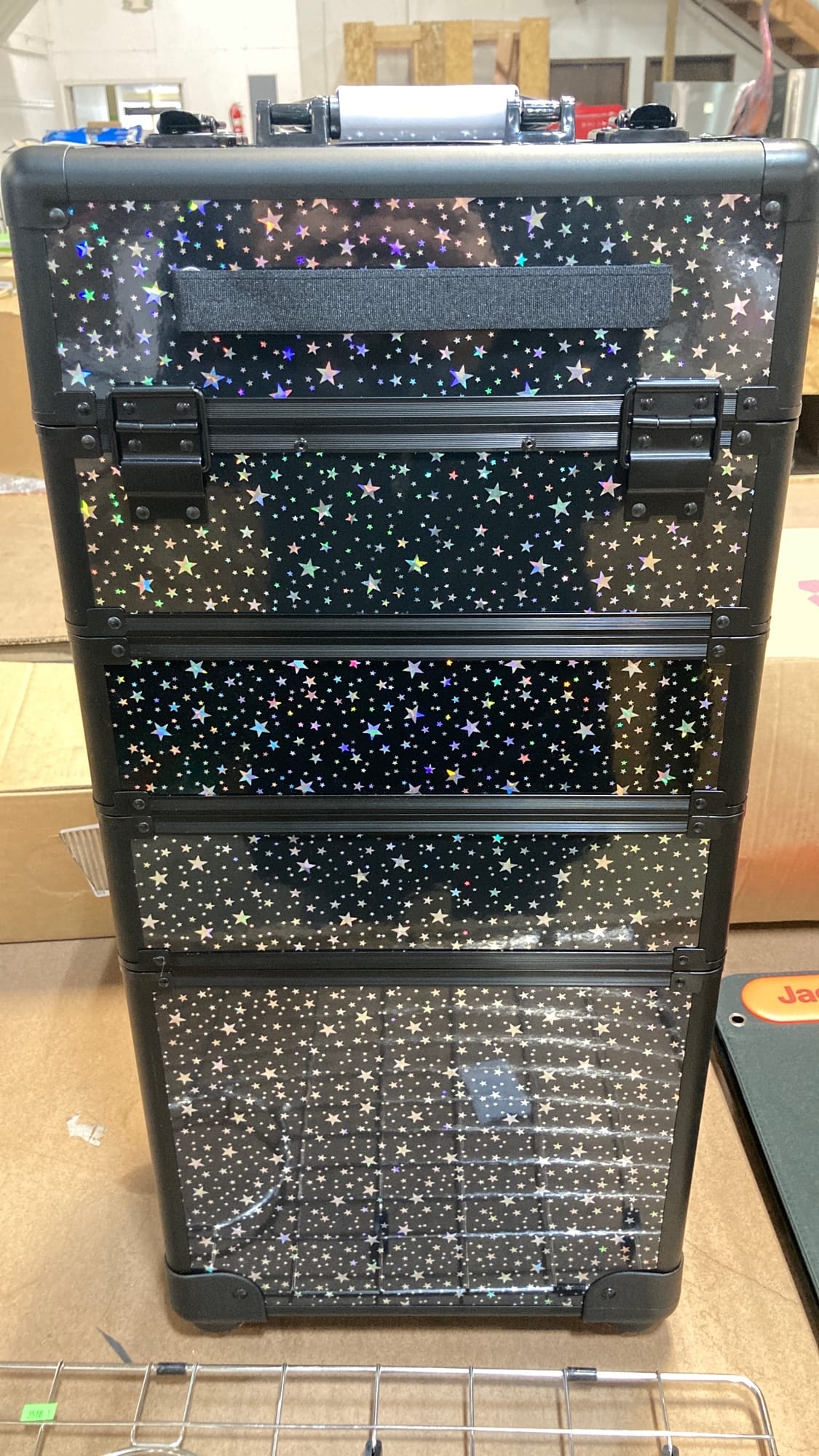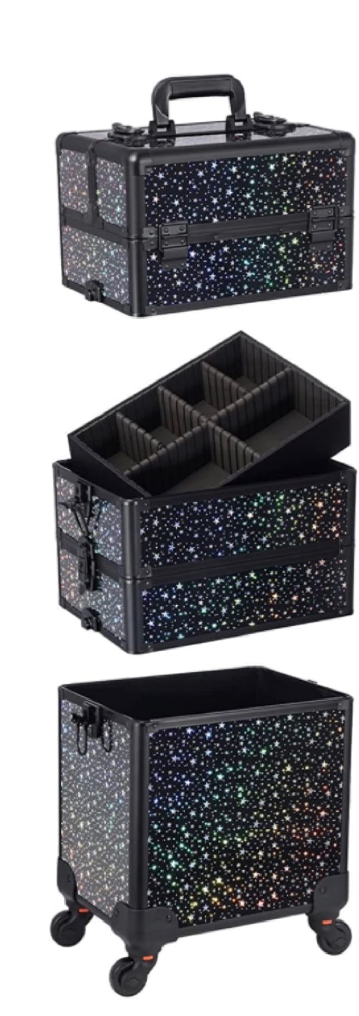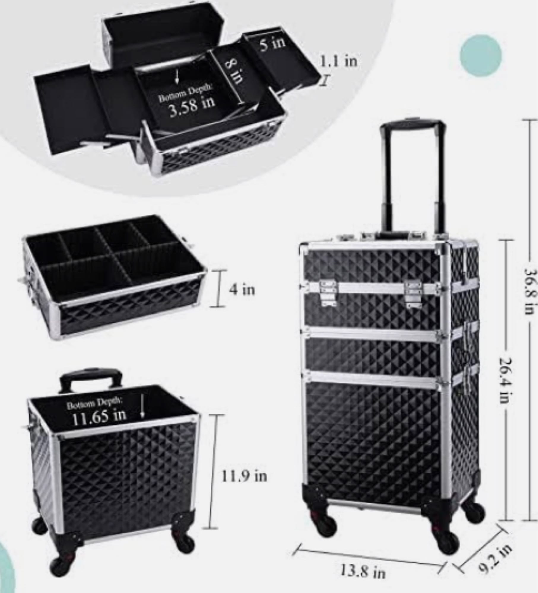 9053 Frenessa 3 in 1 Rolling Makeup Train Case Professional Cosmetic Trolley Large Storage with Keys Swivel Wheels Salon Barber Case Traveling Cart Trunk for Make Up Hairstylists Nail Tech, Vintage Black,Wheels Missing