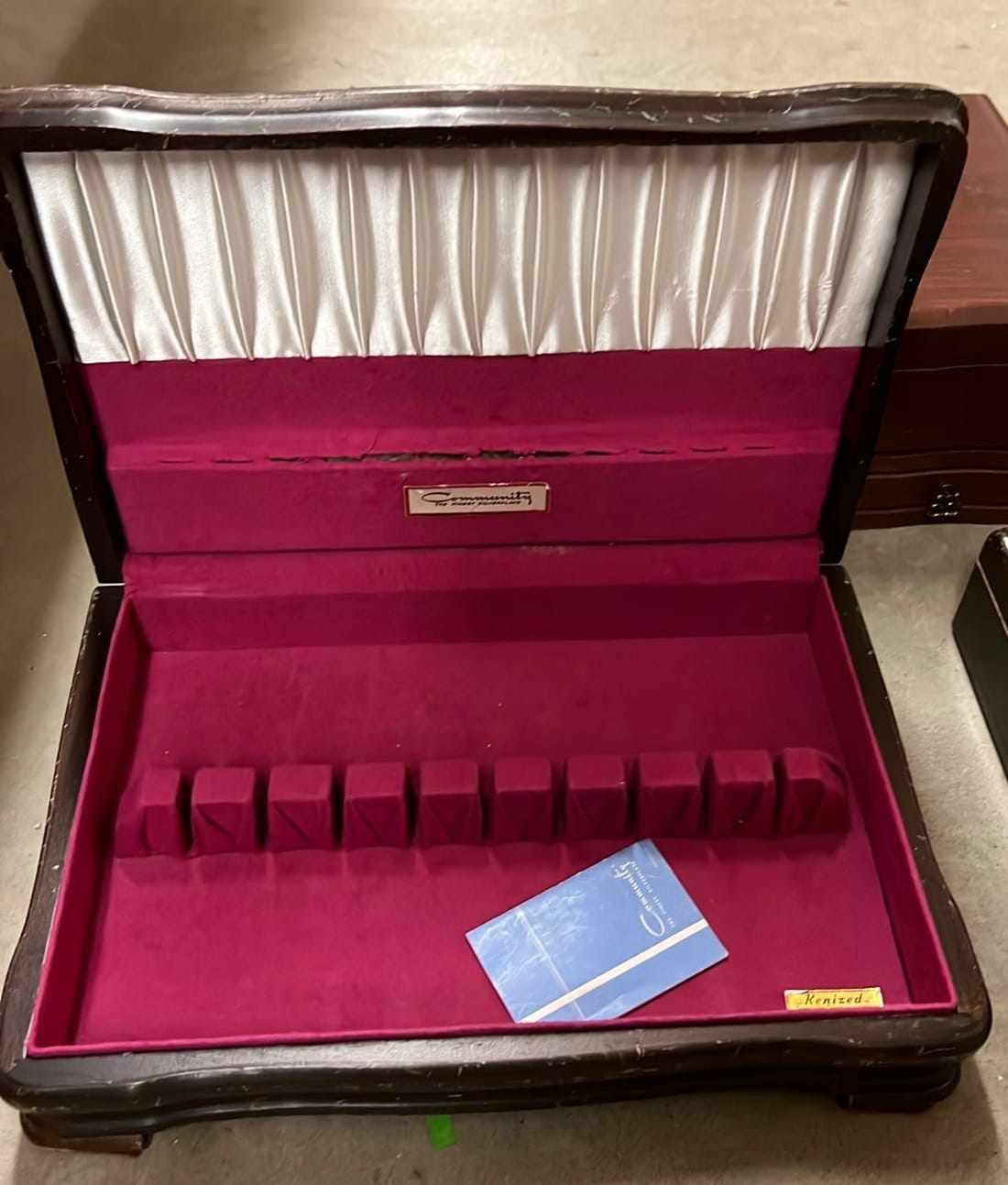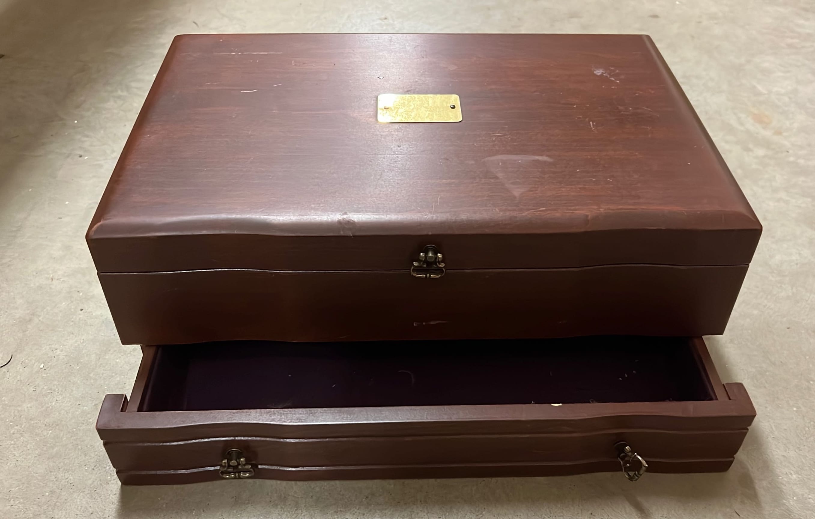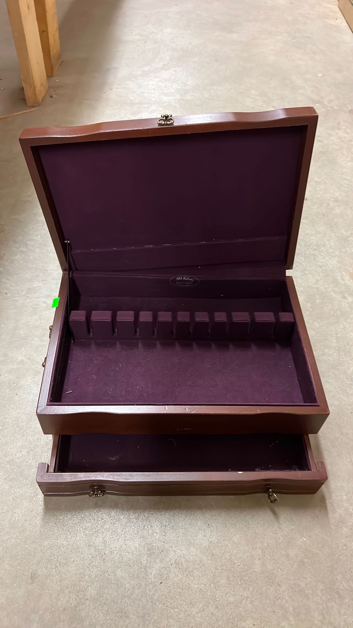 505 3- wood silverware chests, 11 1/2” x 17 1/2” x 4”; 11” x 16” x 4”; 11” x 17” x 6 1/2”, large one has loose hinge