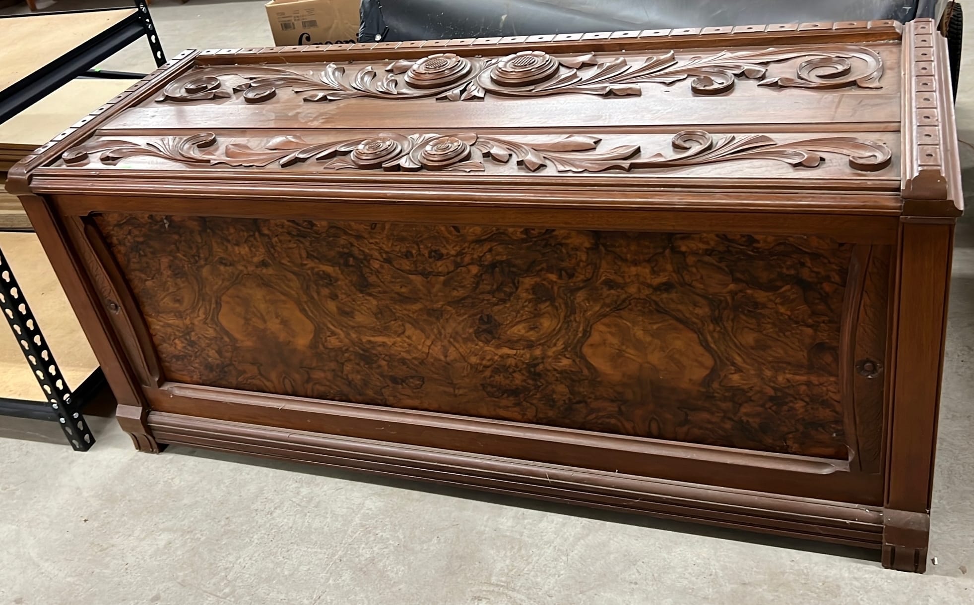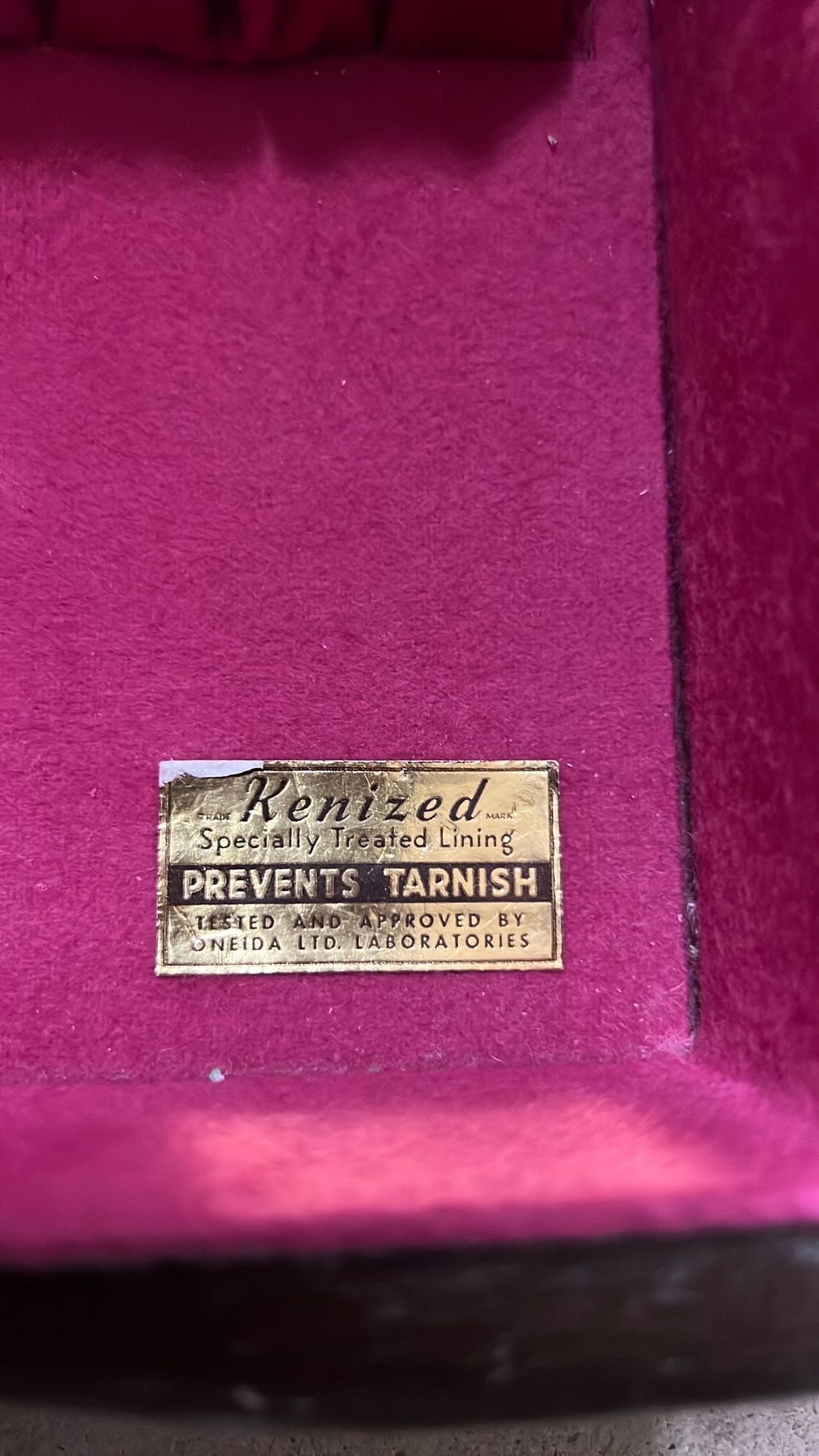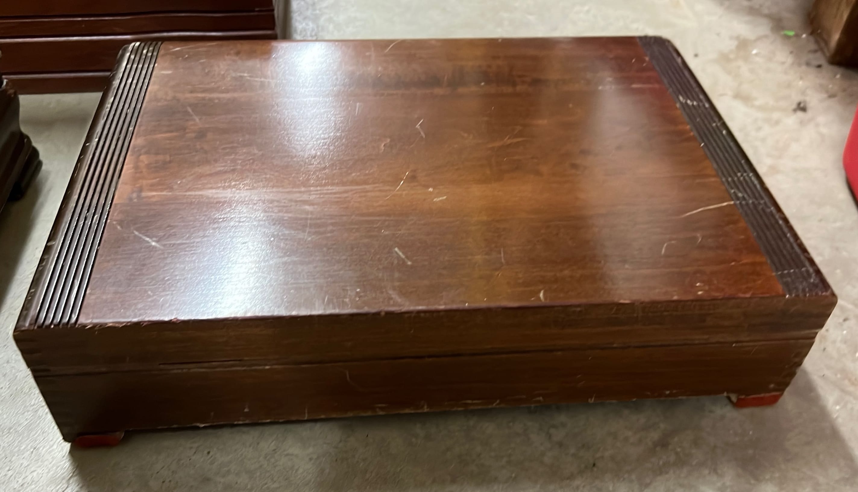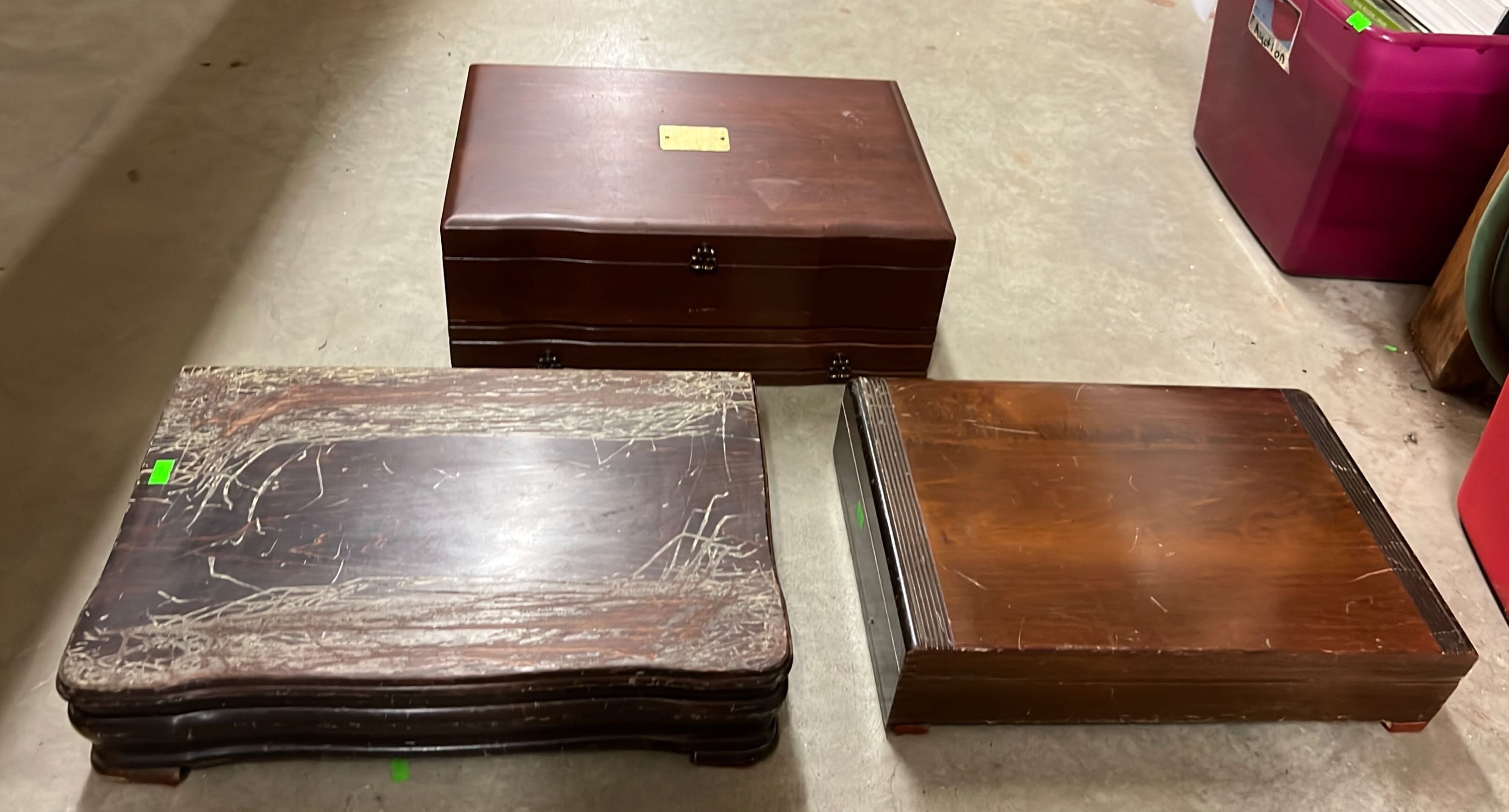 505 3- wood silverware chests, 11 1/2” x 17 1/2” x 4”; 11” x 16” x 4”; 11” x 17” x 6 1/2”, large one has loose hinge