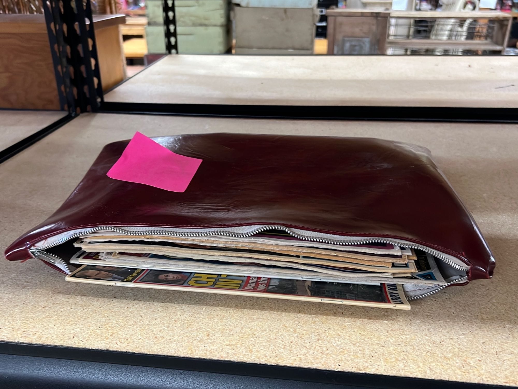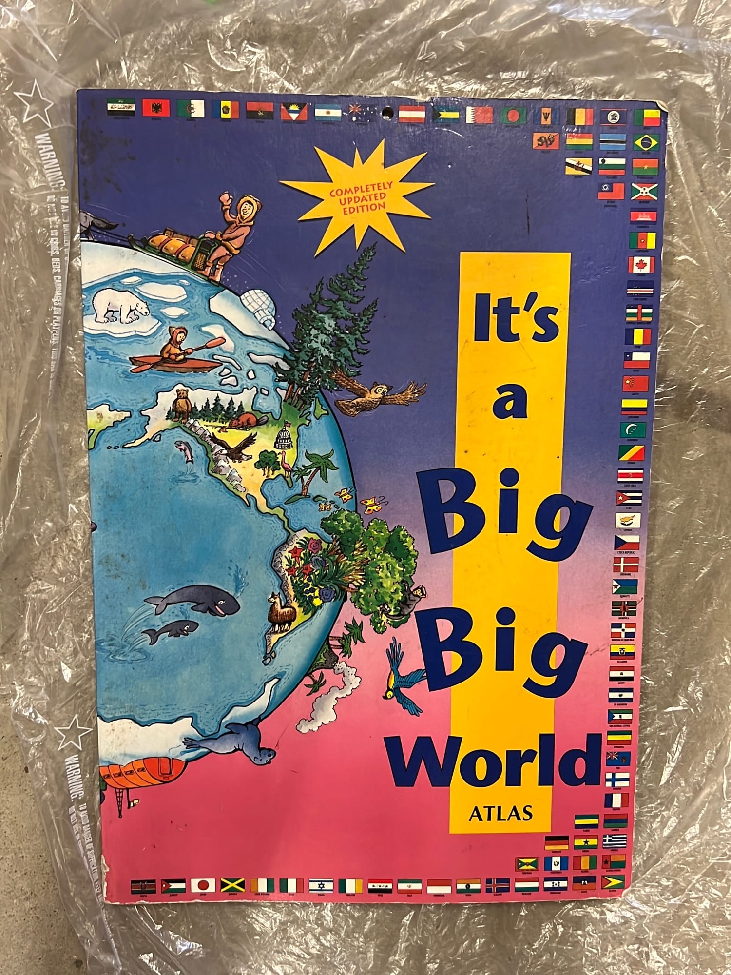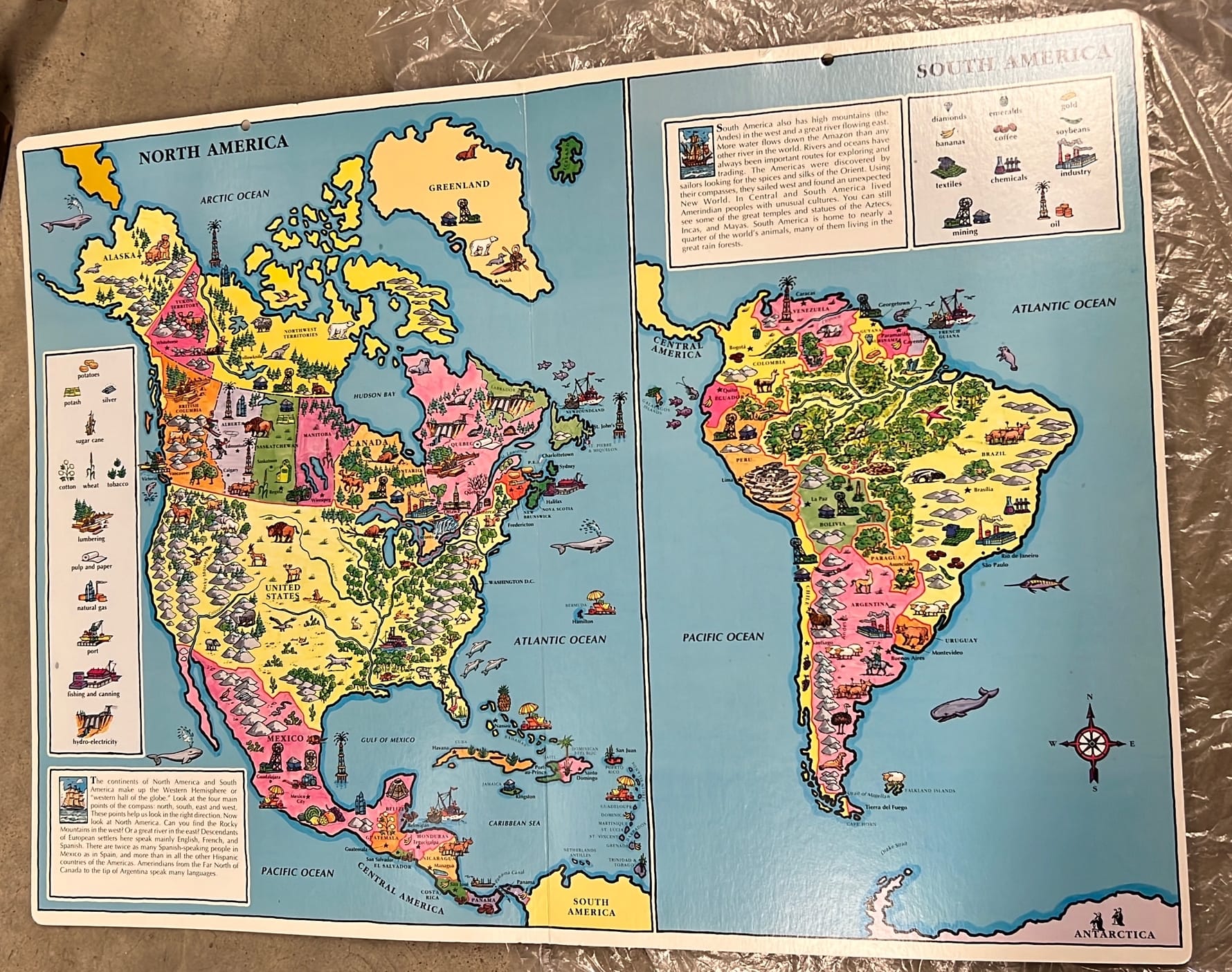 73 Enquirer Magazines & Satchel, It’s a Big World Atlas, Florescent Light 24.5”, Wire, Decorative wood spindle 47.5”