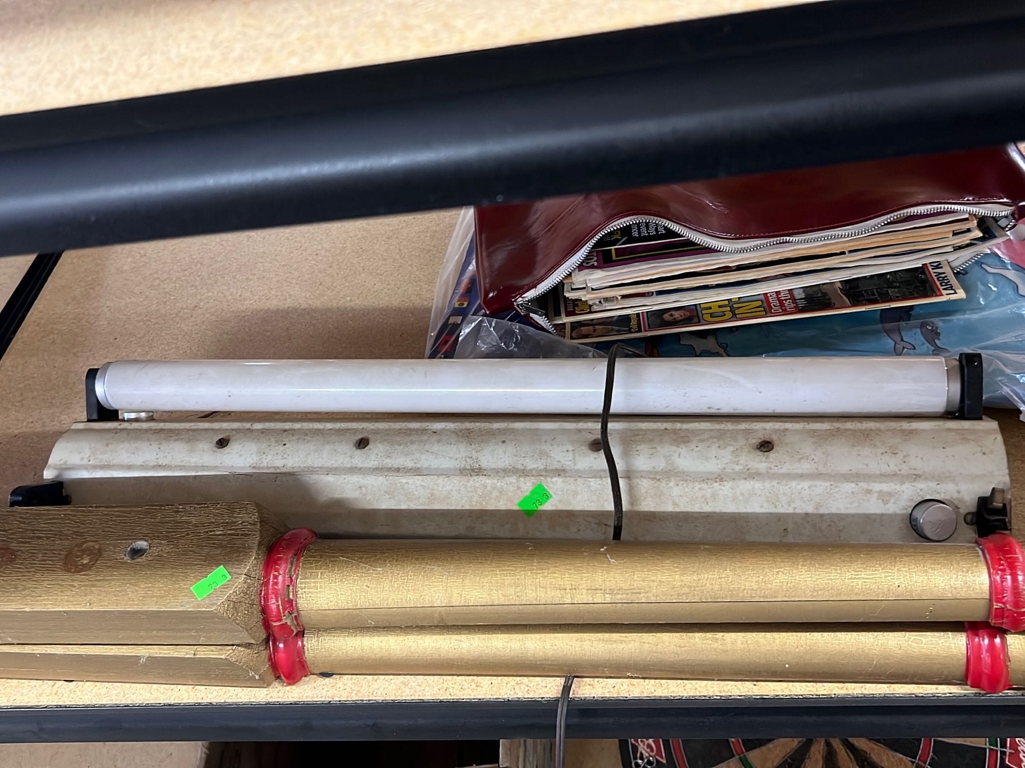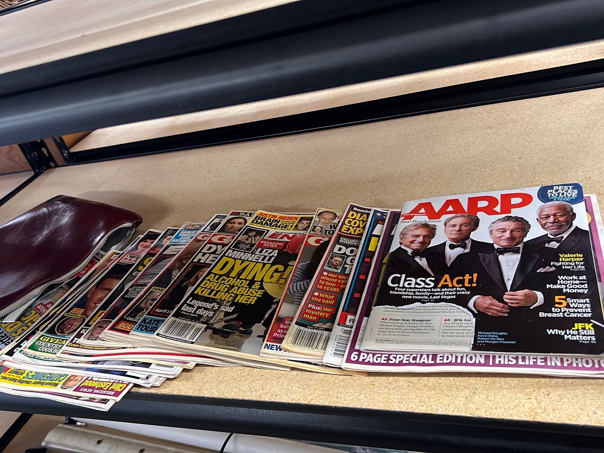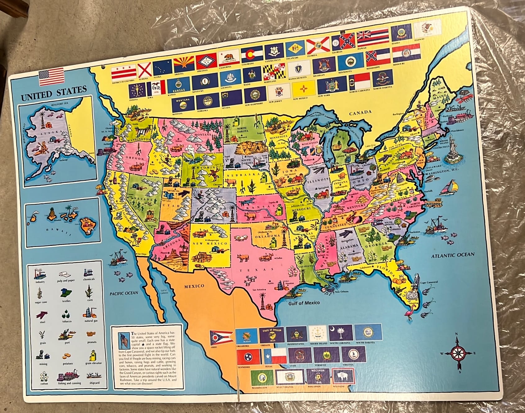 73 Enquirer Magazines & Satchel, It’s a Big World Atlas, Florescent Light 24.5”, Wire, Decorative wood spindle 47.5”