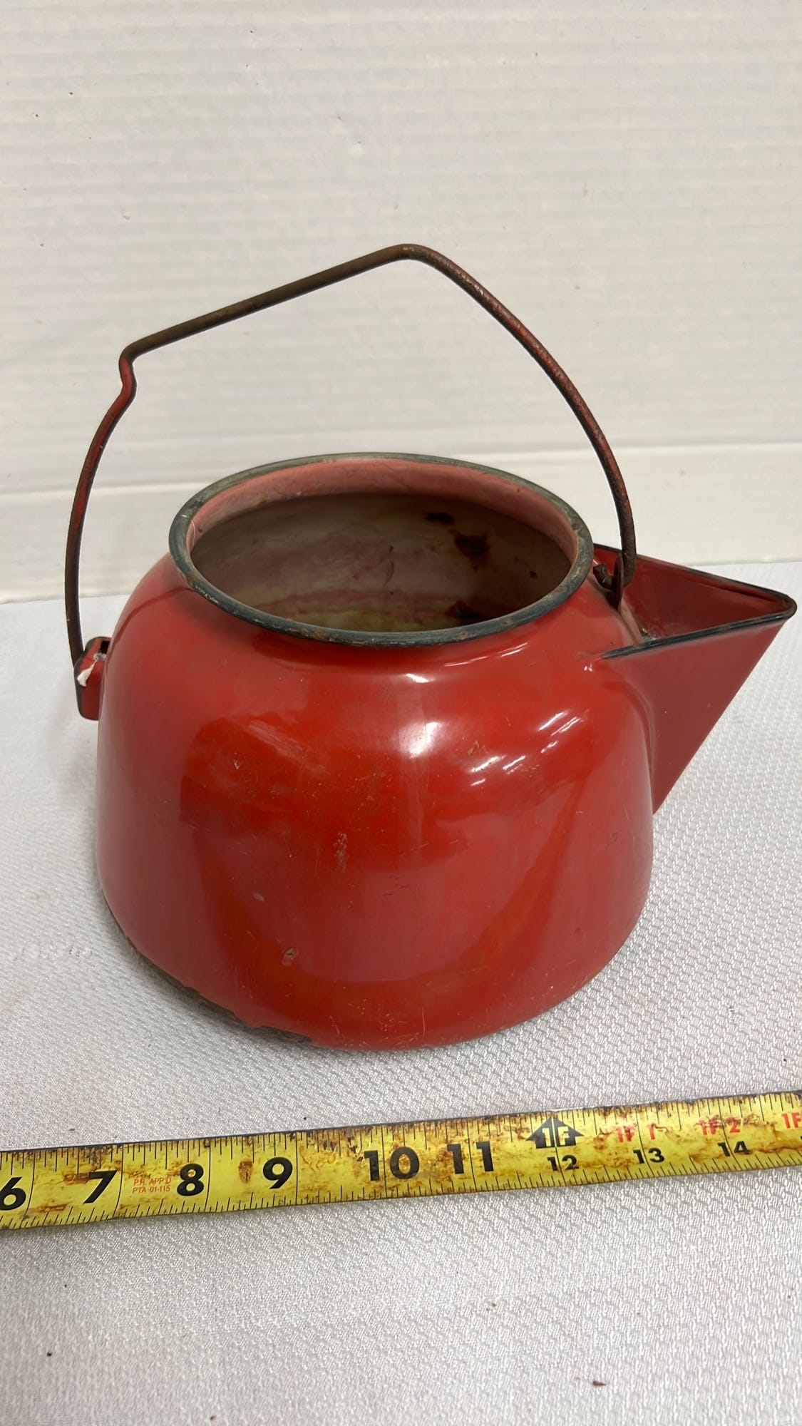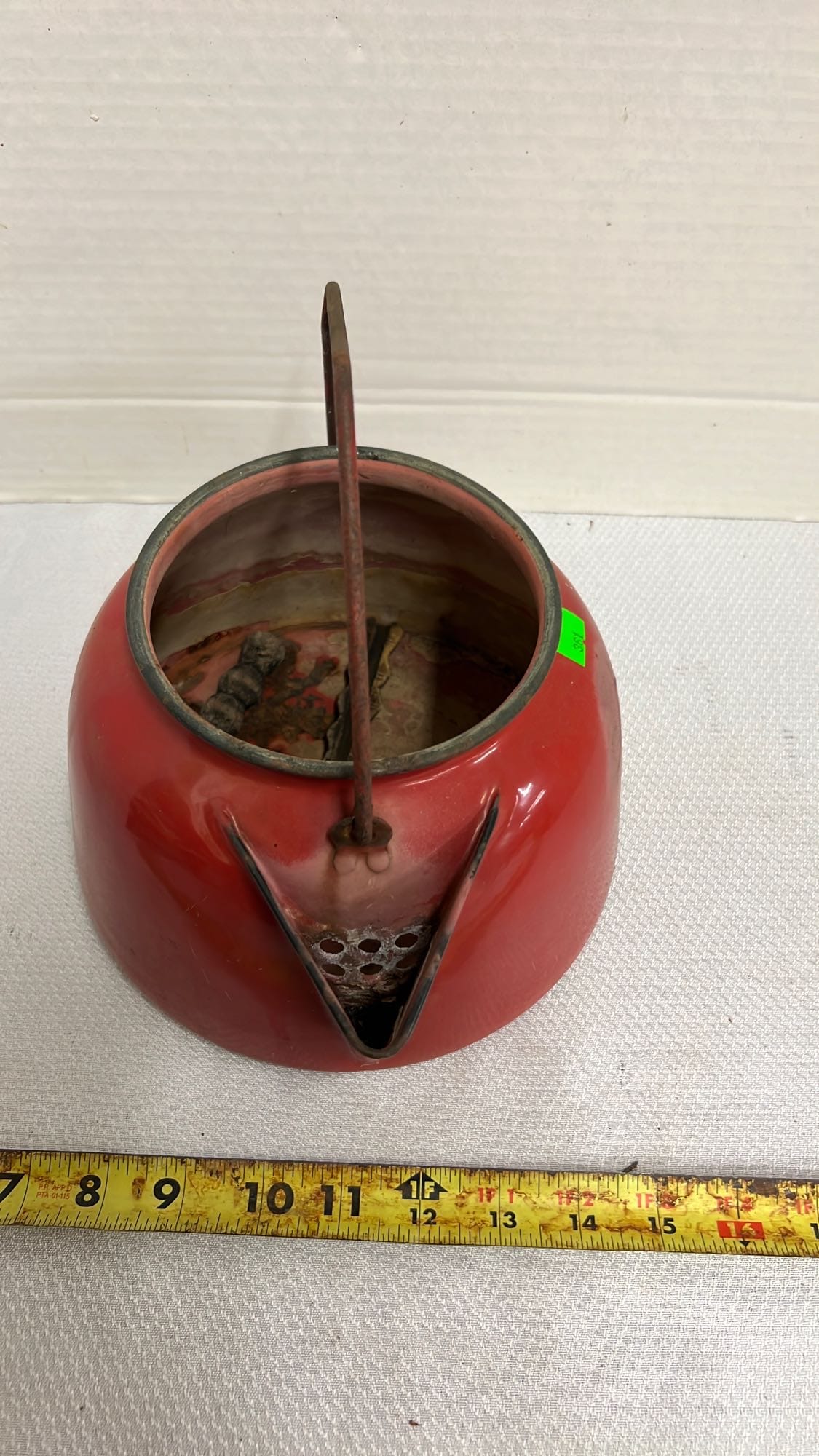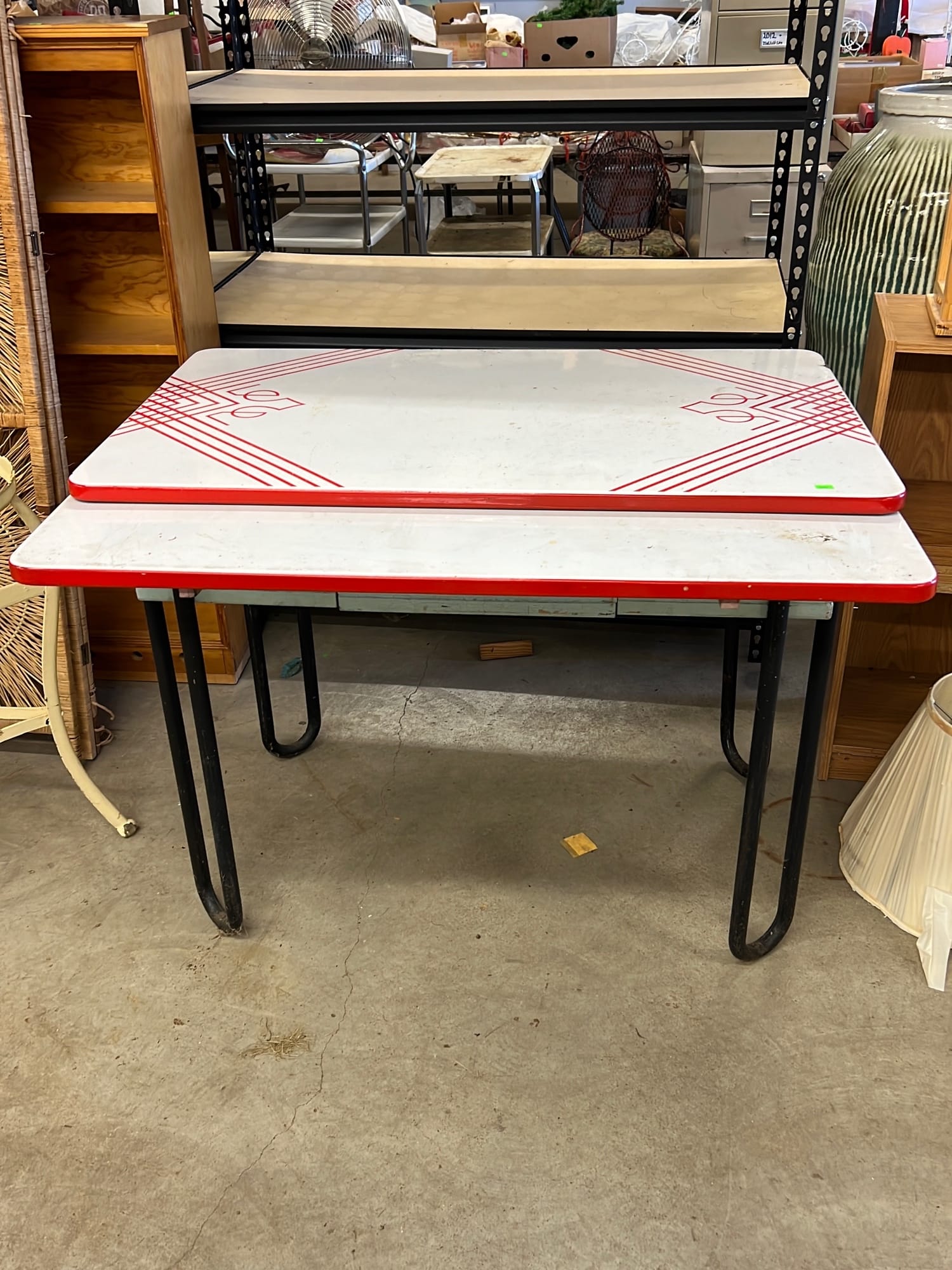 103 Antique White and Red Enamel Top Table w/ 2 Pullout Leaves 40”x30”x25”, Leaves are 9.5”